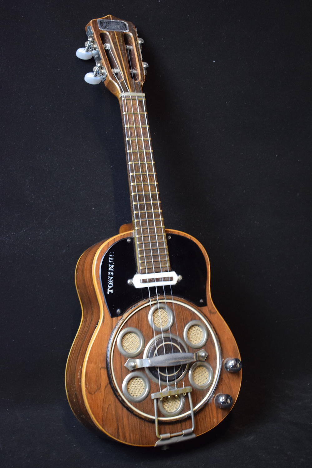 This Brazilian instrument, made by Del Vecchio, is a rarity dating back to the 1960s. It’s a cavaquinho fitted with an aluminum resonator and a biscuit like the National instruments of the late 1920s and 1930s. You can also set it up as a ukulele or play it in GDAE tuning like a mandolin. It’s a very versatile instrument. It sounds really good, and for good reason: it’s made entirely of Brazilian Rosewood. The pickup is excellent with a very high output. The original pickguard bear the name of the original owner, Toninho. Ready to play.