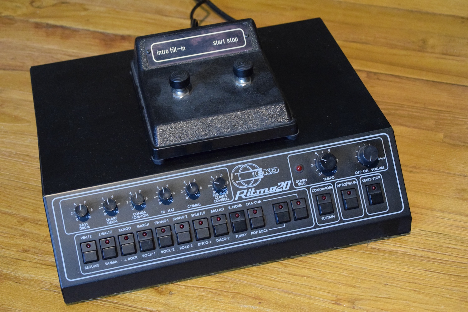A compact and characterful Italian drum machine from the 1960s, it delivers fully analog patterns with the warm, characteristic tone of the era’s circuits. With its retro-looking casing and simple mechanical knobs, it offers a range of pre-programmed rhythms—rock, swing, bossa nova, tango, bolero, and more—that can be layered to create unexpected grooves. Its crisp, edgy percussion sounds have a truly incredible presence; the bass drum, for example, is astonishingly realistic, perfect for adding a minimalist yet vibrant groove. There’s no custom programming here: just fixed styles, a tempo, a volume control, and that immediate charm that makes the Ritmo 20 an ideal little machine for anyone seeking an authentic analog texture.