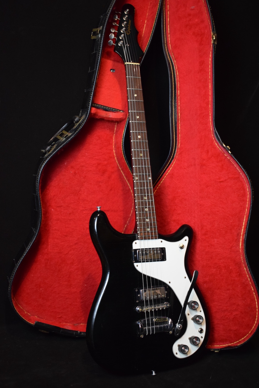 This superb guitar is a very rare original custom color. It like it’s the only one I have ever met or seen all these years. Made by Gibson in Kalamazoo, Michigan, it is a kind of mini SG with mini humbuckers. A mahogany neck and body with a long tenon that vibrates so much, an original Gibson ABR-1. It is complete with its maestro vibrato. It is an original guitar in perfect playing and preserved condition and in a rare and very sought-after color. Black remains classy, whatever the guitar. All the solders are original and the original pickups have not been opened. They still have their patent number labels. It comes with its semi-rigid period correct case. For once I know a littel bit about the history of the instrument: this guitar was brought back from the States (along with a white one) by the frontman of the Hives, and later sold to a well known dealer in Sweden that kept it for a couple years. I very recently acquired it at a show.