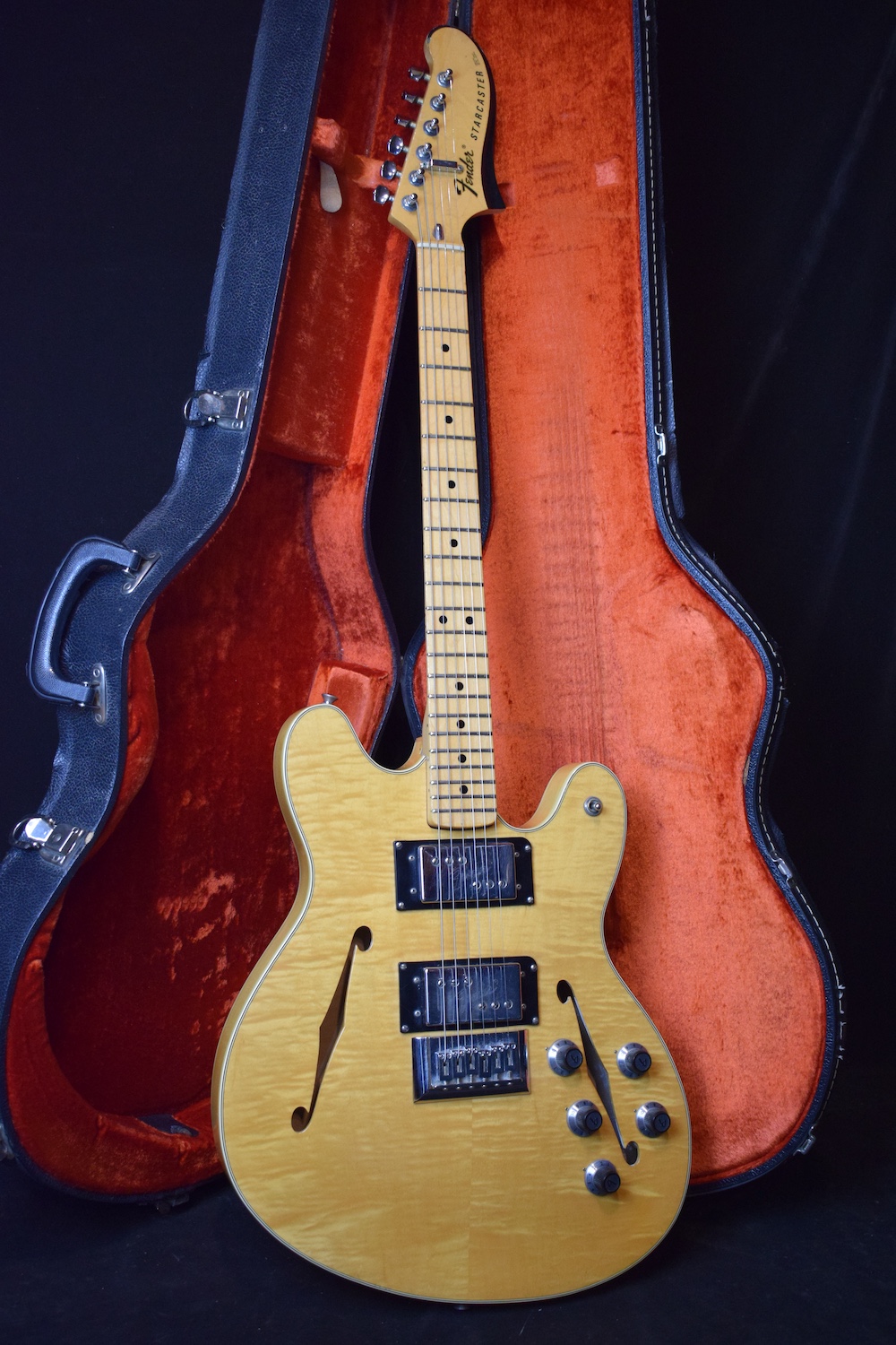 The Starcaster, in my opinion, is a great example of Fender’s ability to make excellent instruments in the 70s. It was designed as a high-end instrument, a semi-hollowbody offset, a sort of response to the equally excellent Gibson Les Paul Signature, which was its contemporary. Fender was clearly not known for its semi-hollowbody models, and yet they succeeded in their gamble in my opinion. The craftsmanship is impeccable, including the body’s routing to accommodate the neck, which can be quite loose on other models at that time, is perfect here. The woods are very well chosen and absolutely magnificent, especially here in its natural version. The missing pickguard could even be a coherent aesthetic choice, as the maple is so beautiful. It is equipped with two wide-range humbucker pickups designed by Seth Lover, quite simply the inventor of the humbucker. A man to whom the modern electric guitar owes a lot. This instrument plays perfectly. The Starcaster has been a frequent performer for several decades by major rock bands such as Radiohead, notably on OK Computer, and with Arctic Monkeys. It has also been occasionally used in jazz fusion, although this isn’t what makes it so well-known to the general public; it’s a guitar capable of many different things. It comes with its original hardshell case.