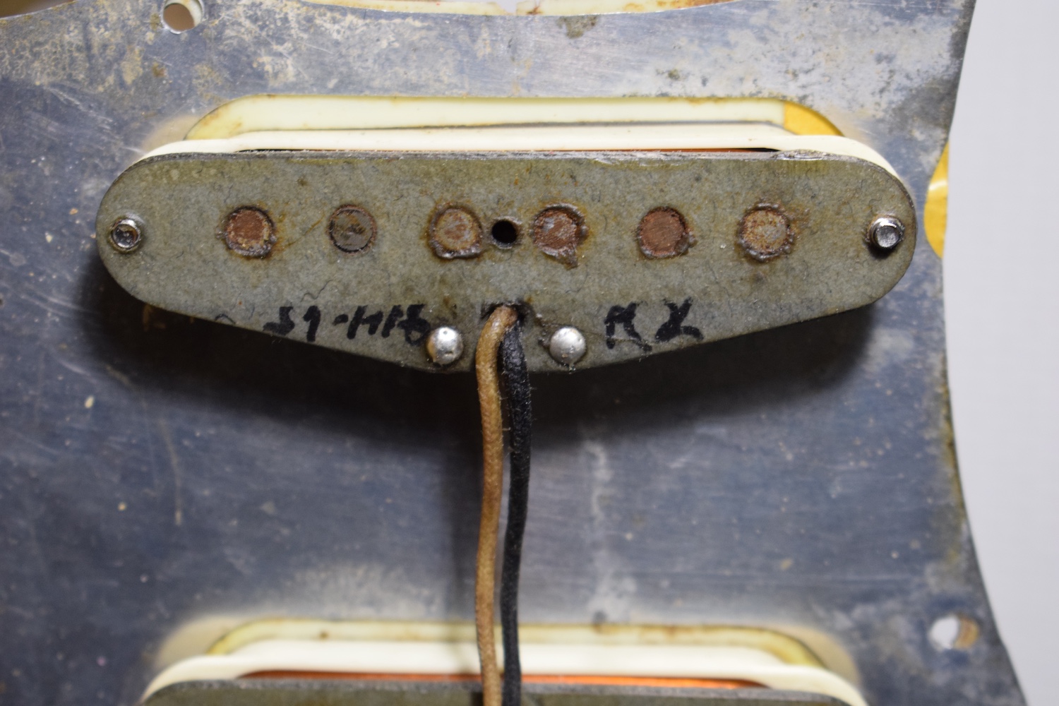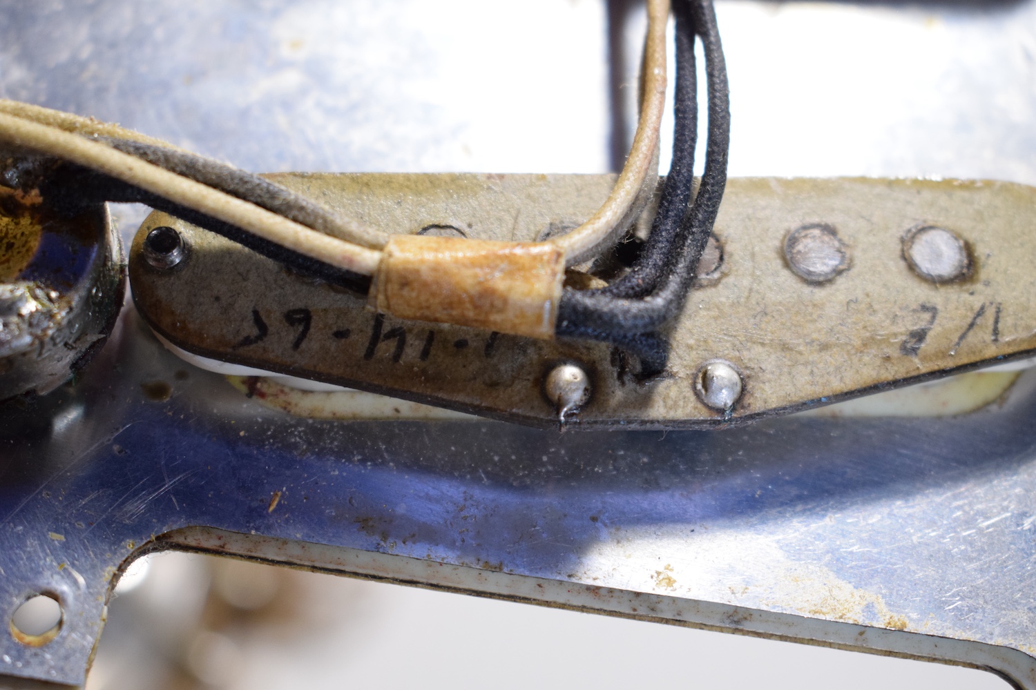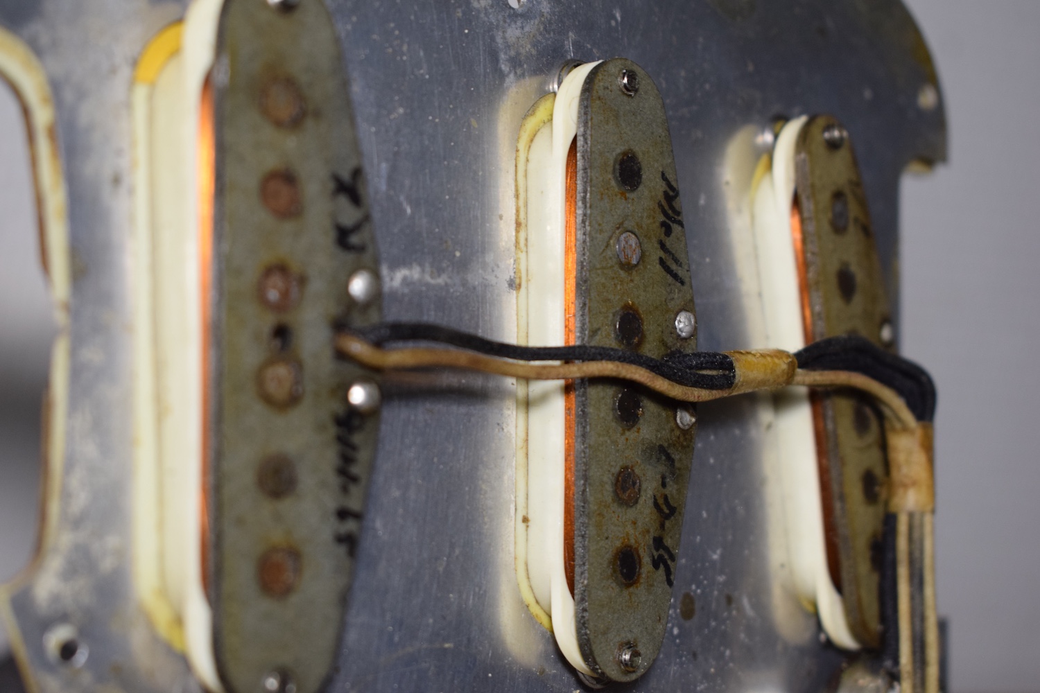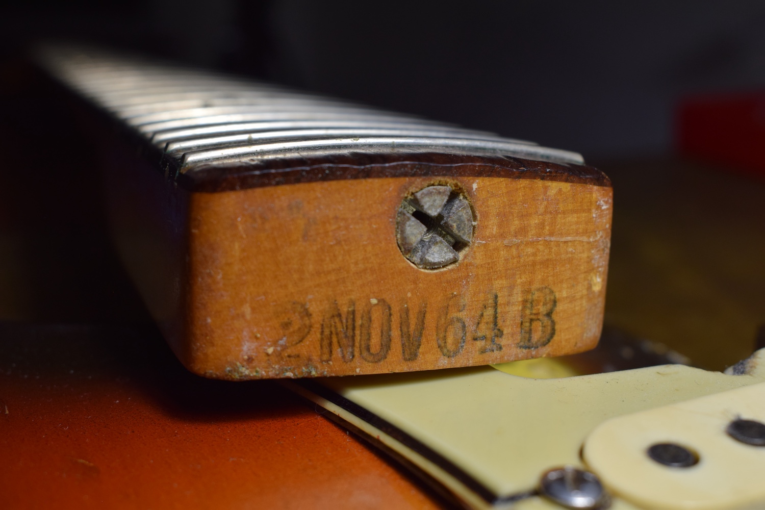 This guitar features all the 1964 specifications: green guard, grey-bottom pickups with Formvar copper wire. It truly dates from the transition period between 1964 and 1965, with a neck stamped November 1964 and three matching potentiometers dating to the 5th week of 1965. The pickups are also from early 1965 and hand-dated. Note the small piece of masking tape in the neck pickup cavity, bearing the initials of the worker who completed the instrument.