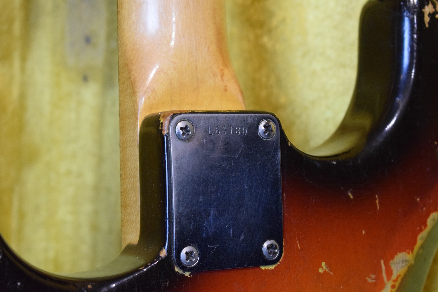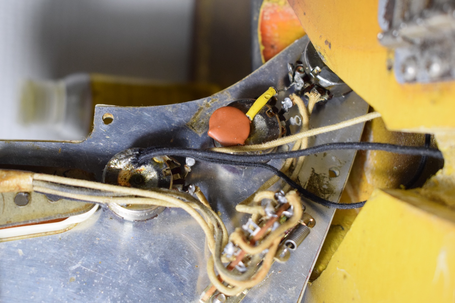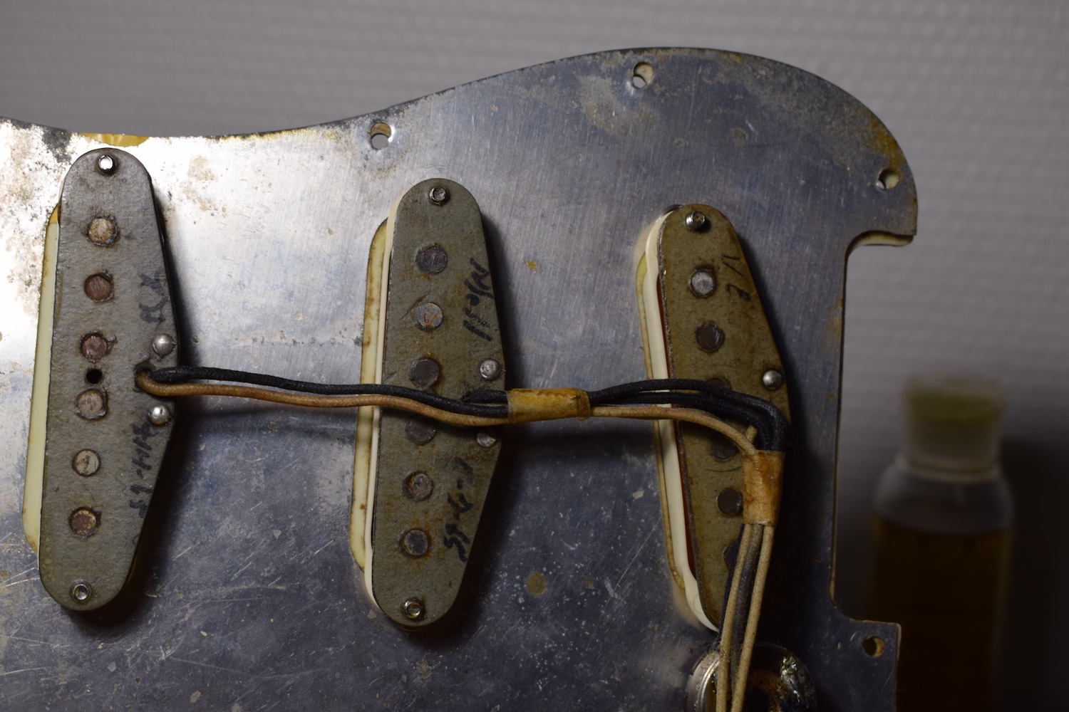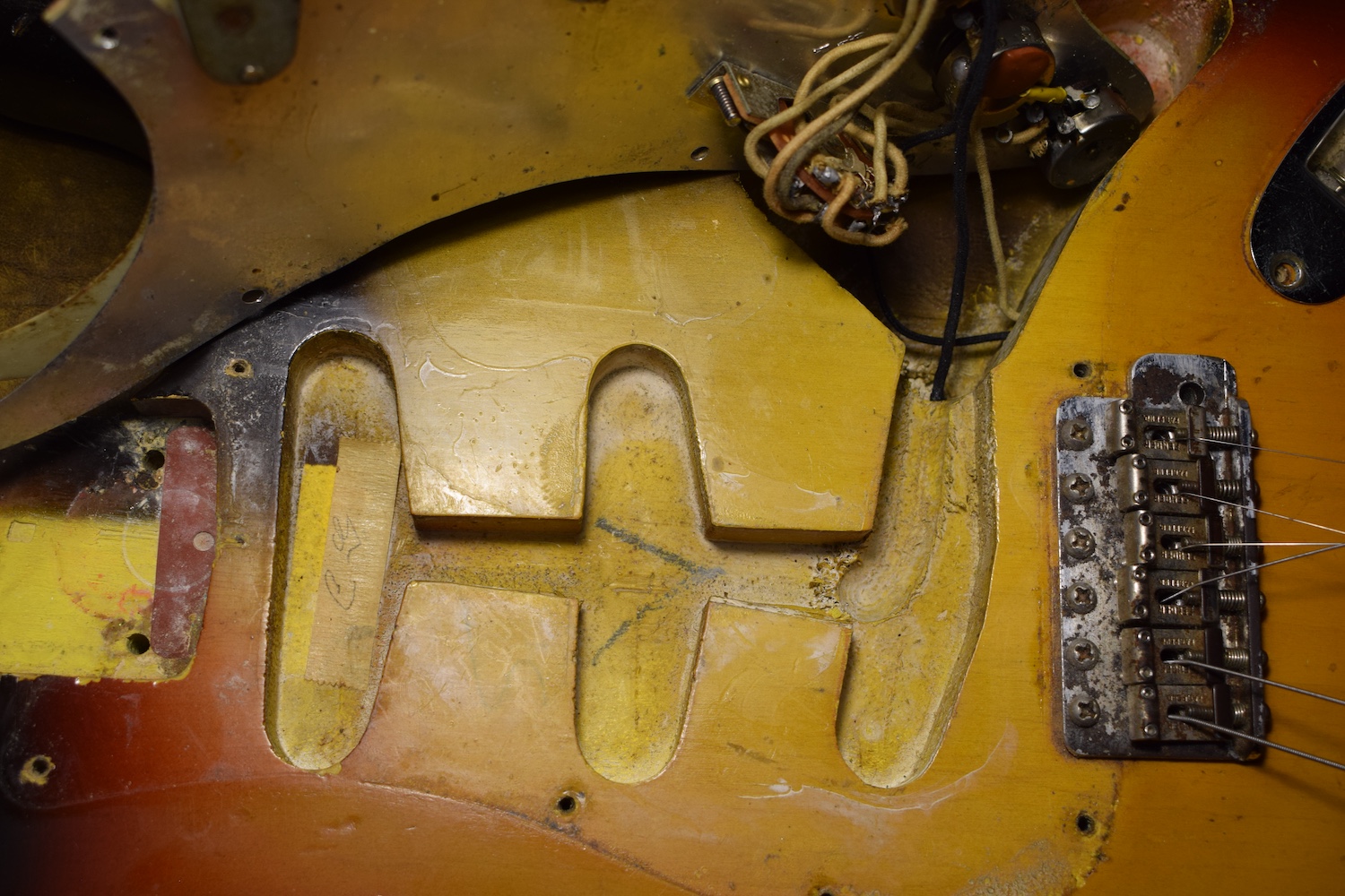 This guitar features all the 1964 specifications: green guard, grey-bottom pickups with Formvar copper wire. It truly dates from the transition period between 1964 and 1965, with a neck stamped November 1964 and three matching potentiometers dating to the 5th week of 1965. The pickups are also from early 1965 and hand-dated. Note the small piece of masking tape in the neck pickup cavity, bearing the initials of the worker who completed the instrument.