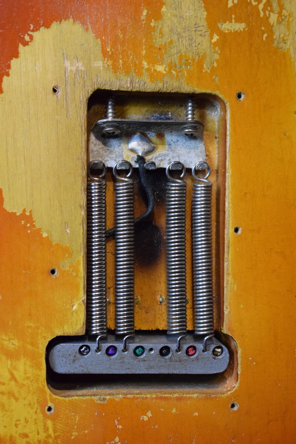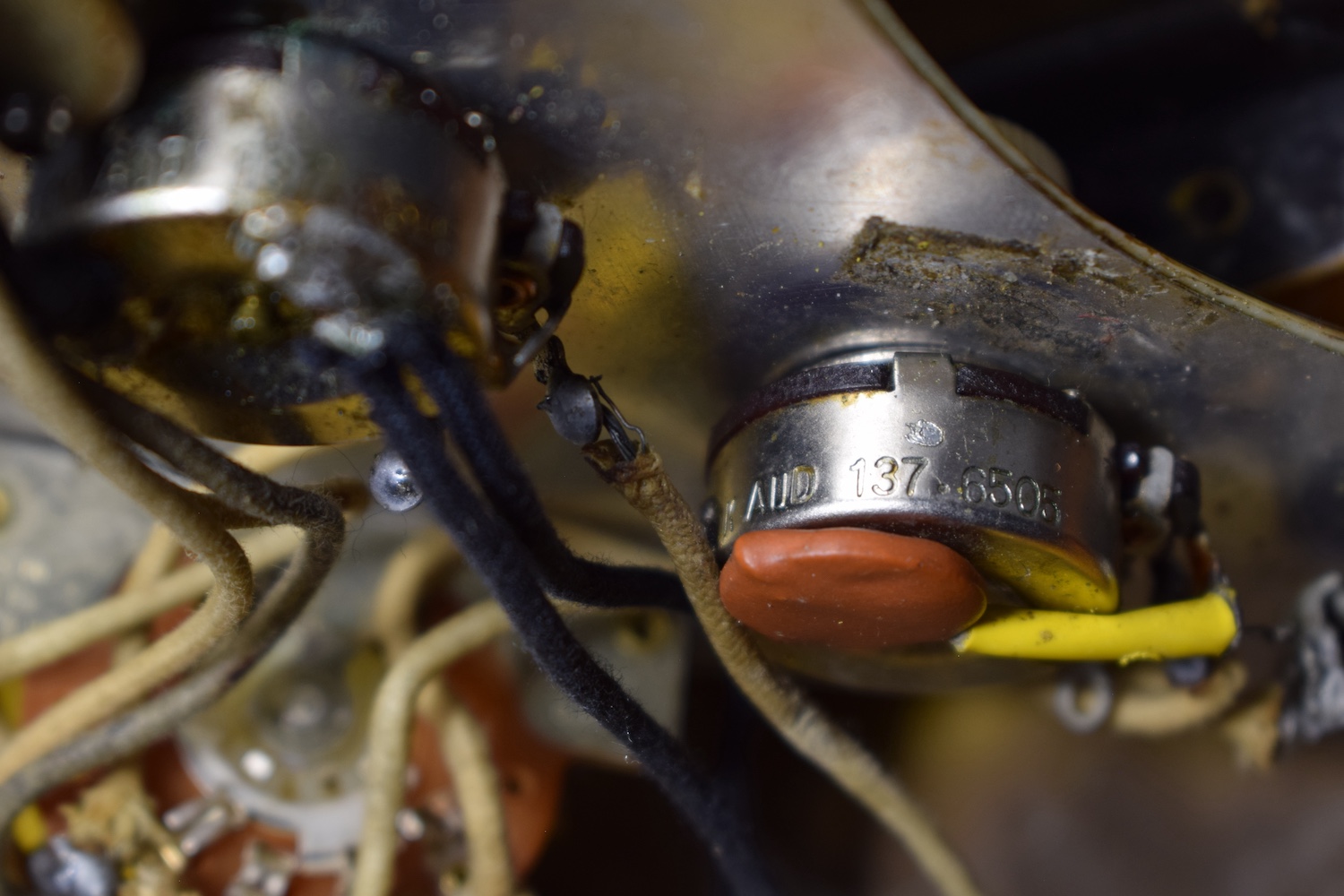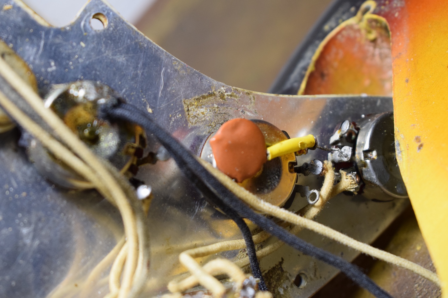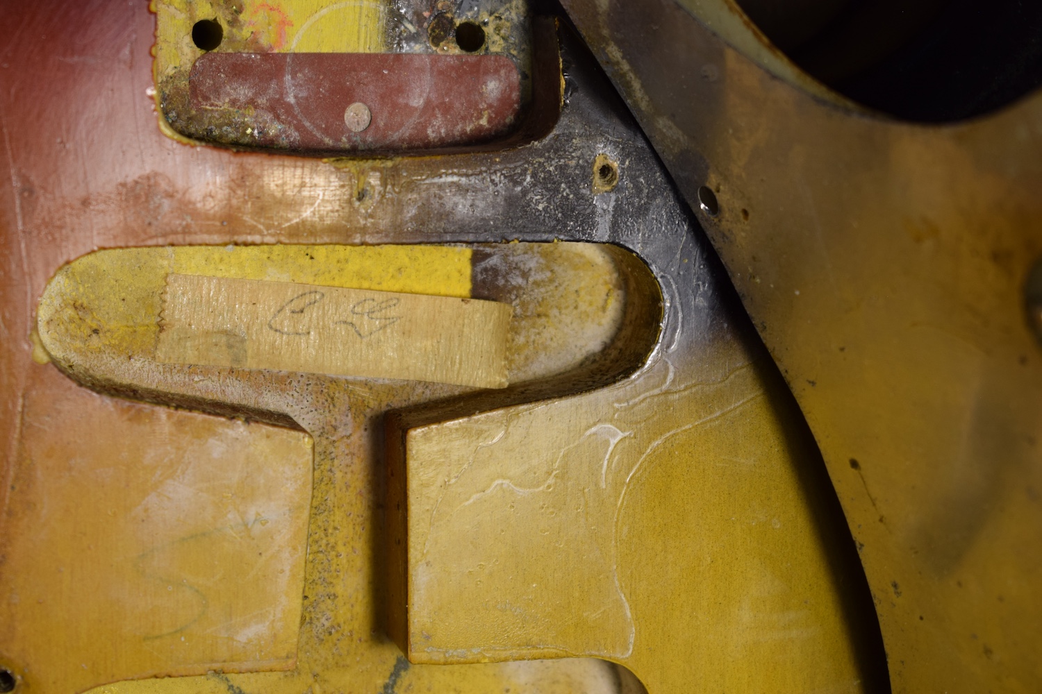 This guitar features all the 1964 specifications: green guard, grey-bottom pickups with Formvar copper wire. It truly dates from the transition period between 1964 and 1965, with a neck stamped November 1964 and three matching potentiometers dating to the 5th week of 1965. The pickups are also from early 1965 and hand-dated. Note the small piece of masking tape in the neck pickup cavity, bearing the initials of the worker who completed the instrument.