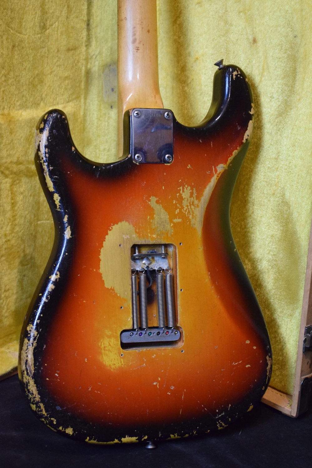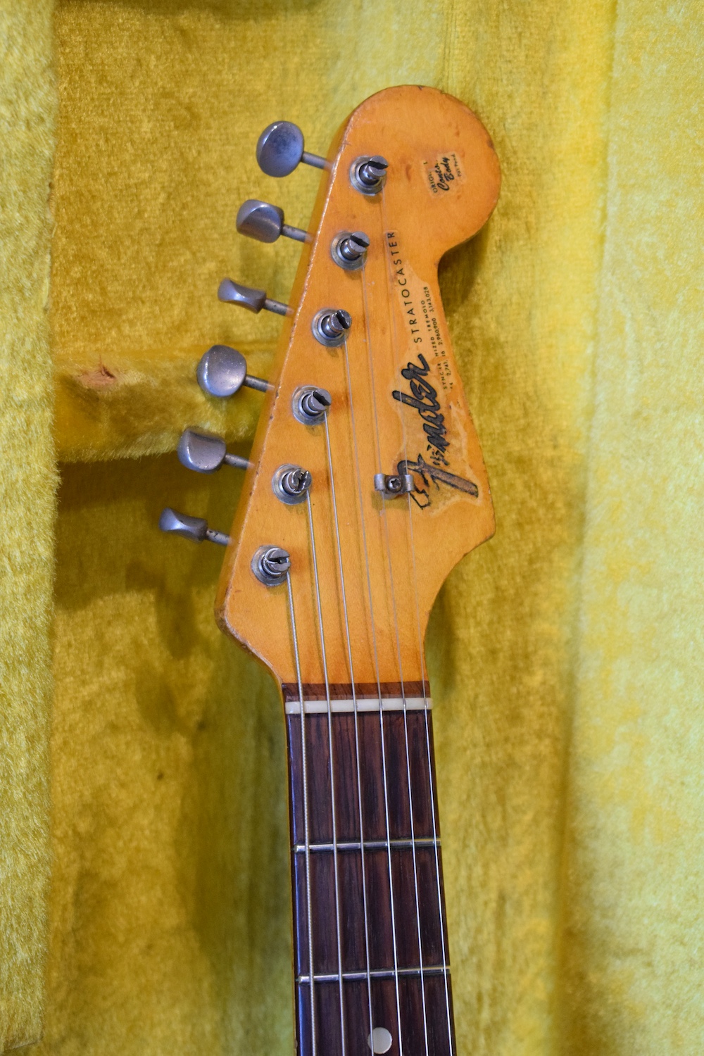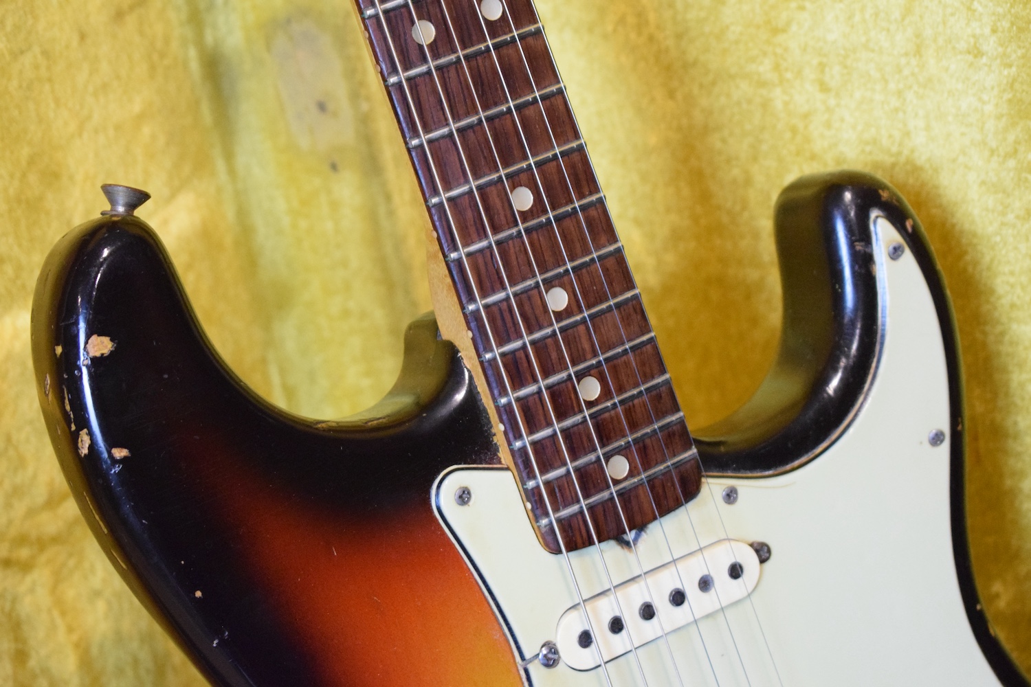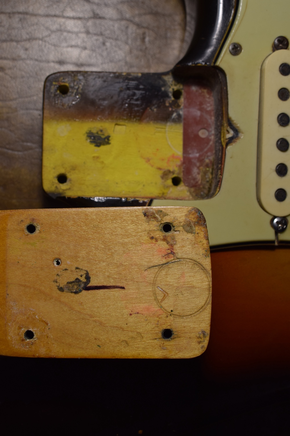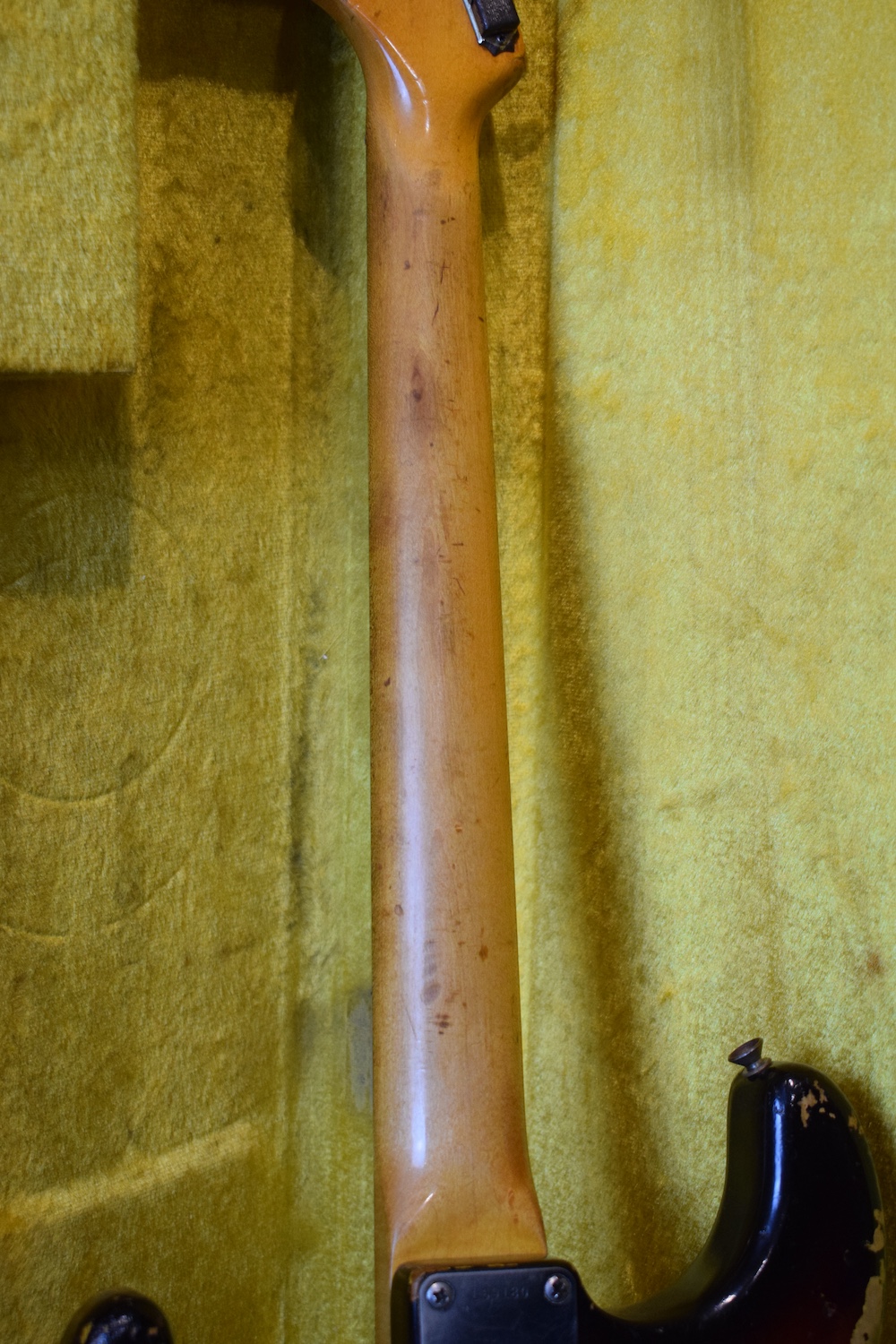 Over time, it has understandably received a 5-way selector switch and a refret (the original selector is included in the case, along with the back plate and a few screws). Let me tell you: this refret is outstanding. I have rarely encountered a Stratocaster this precise. At the 19th fret, there isn’t even a single hertz of deviation. It is perfectly in tune and sounds incredible in every pickup position. This is a truly great instrument. For the sake of completeness, the pickguard is cracked at the neck pickup—as is often the case—and also near the selector switch, where it has been stabilized.