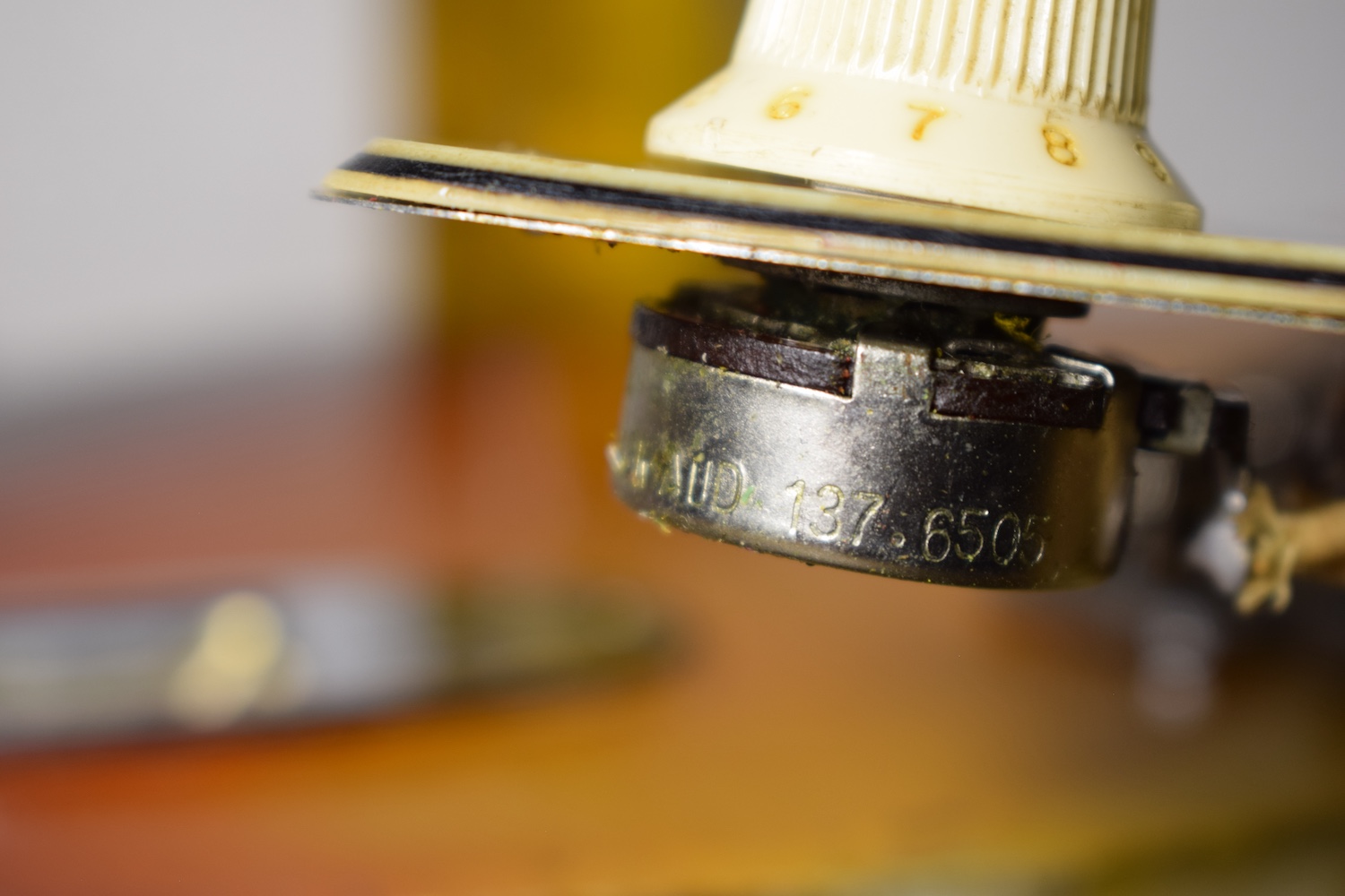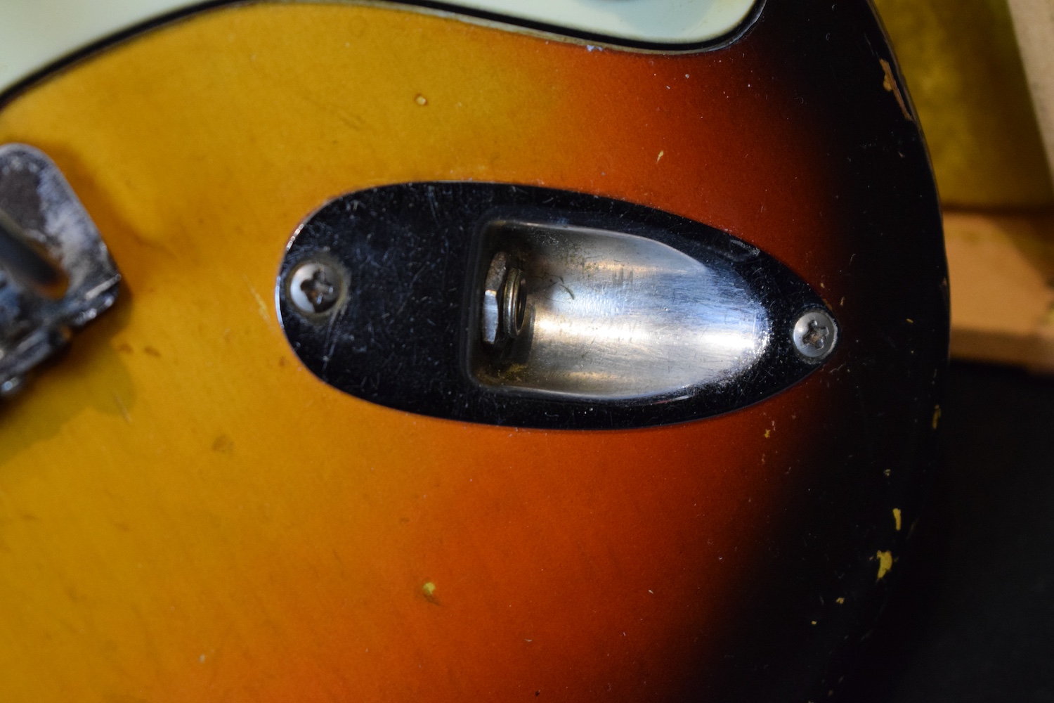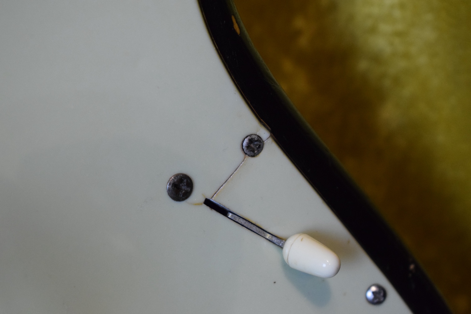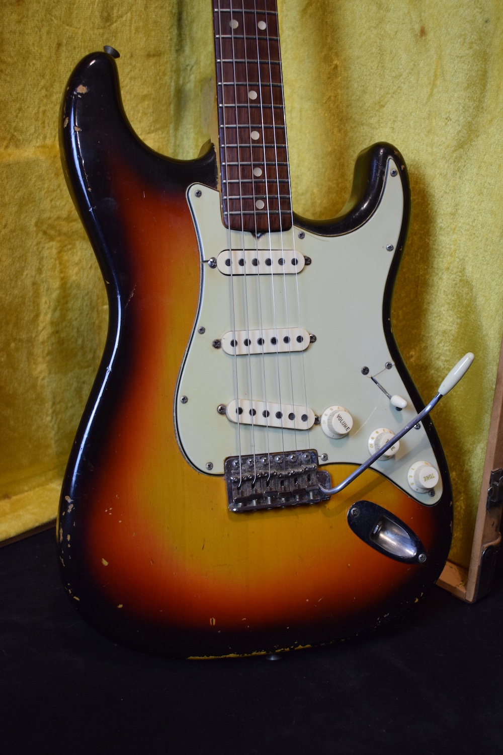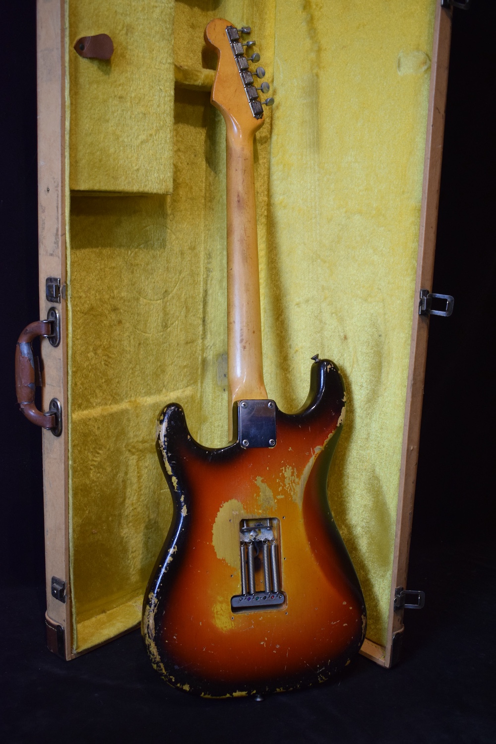 Over time, it has understandably received a 5-way selector switch and a refret (the original selector is included in the case, along with the back plate and a few screws). Let me tell you: this refret is outstanding. I have rarely encountered a Stratocaster this precise. At the 19th fret, there isn’t even a single hertz of deviation. It is perfectly in tune and sounds incredible in every pickup position. This is a truly great instrument. For the sake of completeness, the pickguard is cracked at the neck pickup—as is often the case—and also near the selector switch, where it has been stabilized.