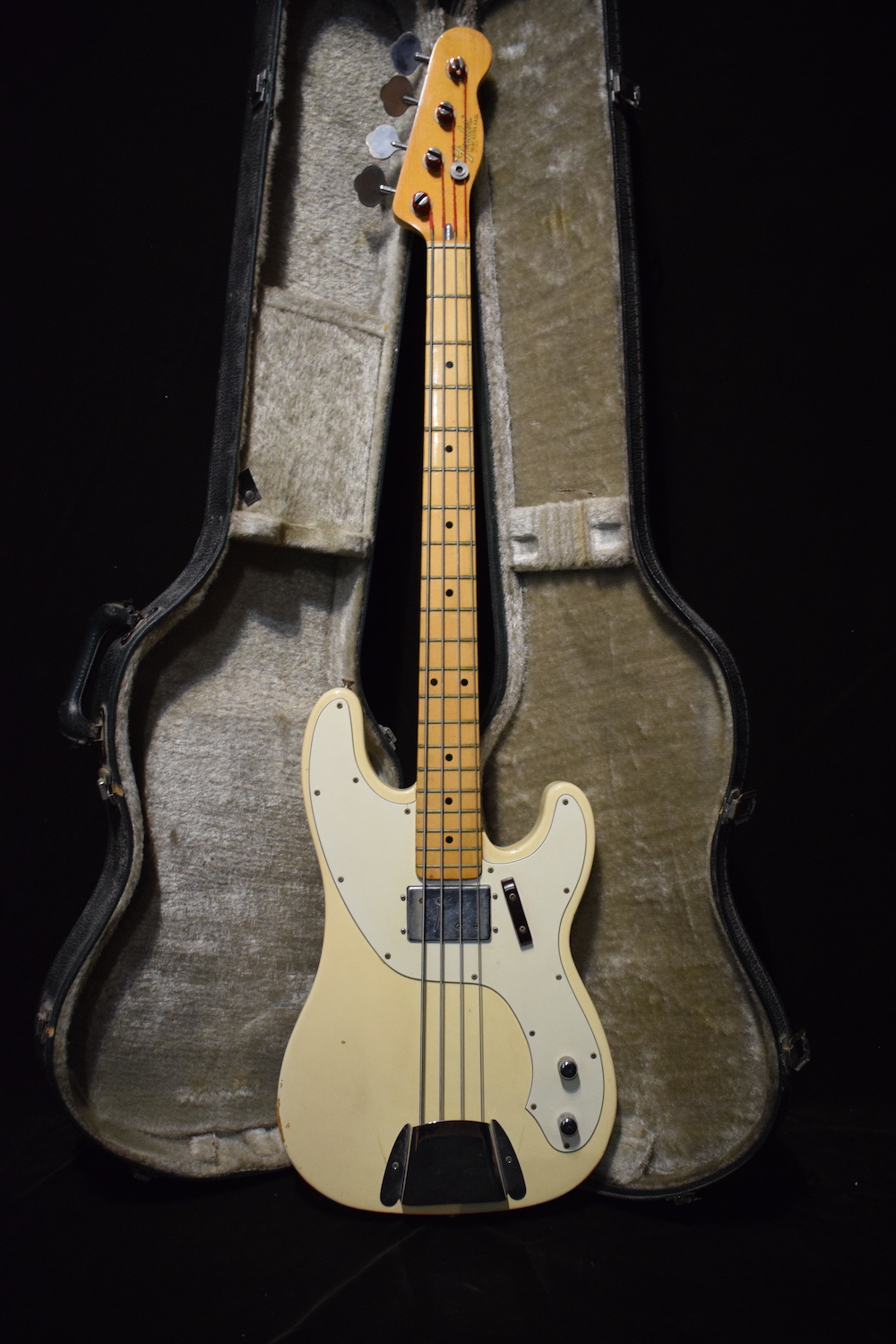 Inspired by the original Precision model of the 1950s the Telecaster Bass has had 2 versions, first with a single pickup in the center position, then it evolved into a design with a humbucker in the neck position. This particular model is in excellent original condition. The bass is set and ready to play. It sounds great, the electronics are working fine. 2 pots were changed. Original wide range pickup. It was refinished in Olympic White finish over Olympic White with shielding paint in the cavity. It used to be a professional instrument played in Egypt with a cool story. Comes in a vintage Japanese case in the correct size.