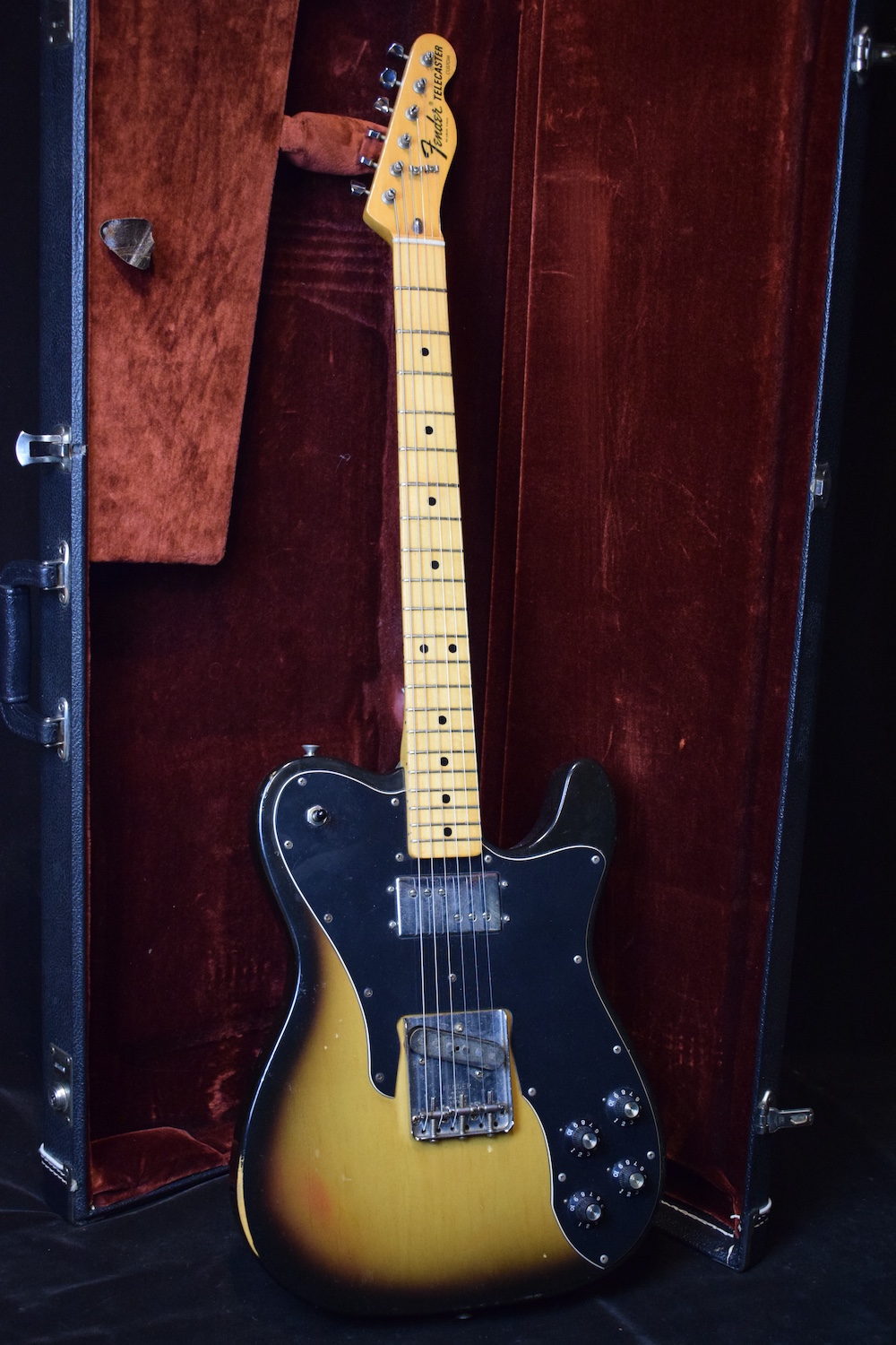Following recurring customizations of Telecasters by prominent players in the early 1970s, Fender hired Seth Lover, the inventor of the humbucker at Gibson, to develop a humbucker pickup and develop a range of specific instruments. With its humbucker pickup and witch hat knobs, it borrows heavily from Gibson models of the same era. The model presented here is in very good condition. Note that the red pigment has faded slightly on the front but remains intact on the back. No repairs, it is setup and ready to play. Comes in its original hardshell case.