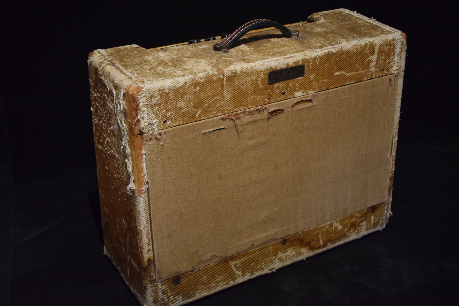 En voilà un qui m’en complètement retourné la tête. Cet ampli est incroyable. C’est un Twin de juillet 1953, sorti des ateliers Fender alors que la Stratocaster n’existait même pas encore. Il a été bien entretenu ce qui implique de remplacer des condensateurs et résistances hors valeur. Le transfo de sortie est un Mercury. Toujours en 110V, un câble d’alimentation avec prise de terre a été ajouté. Le tube chart est présent même s’il est écorné. Les 2 haut parleurs Jensen originaux et leurs cônes aussi. Le tweed a une certaine usure disons… mais quel look! Interdit de le retolexer on est bien d’accord.
