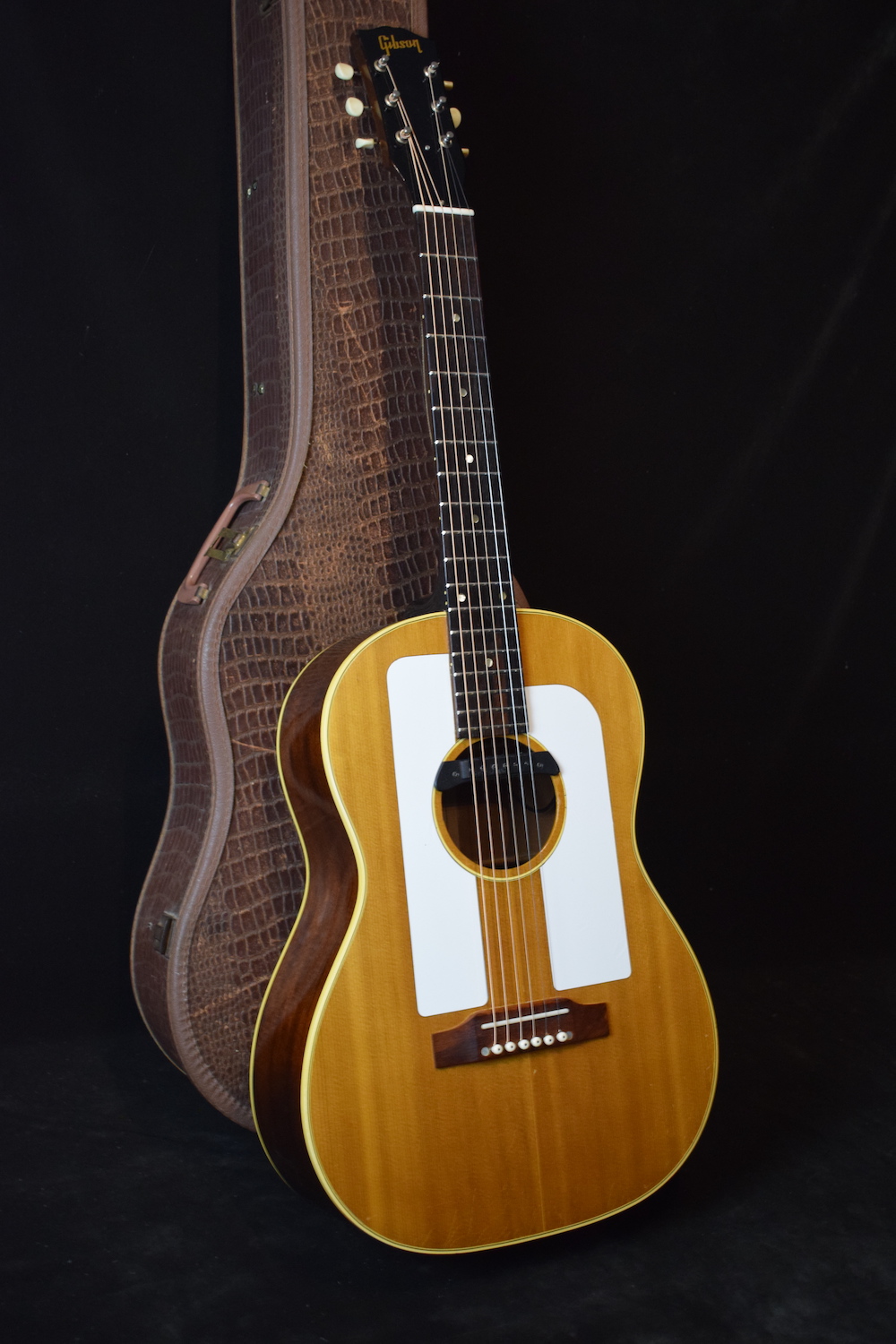 It’s a 12 fret Gibson with a 50mm wide neck at the nut. This is useful for picking, particularly by leaving a comfortable space between each string. It sounds like a very good Gibson, here we discover a really ample sound, with nice bass and very present mids, more elaborate than on models of similar sizes like the LG-2 or its contemporary the B25. This is, in my opinion, an instrument for any singer or instrumentalist who will find appeal in this wide neck. It is both an obstacle for some but for others it will be the main advantage. The guitar is in very good general condition without repair. The cellulose finish is weather checked overall, which could not be more normal for a guitar of this age.