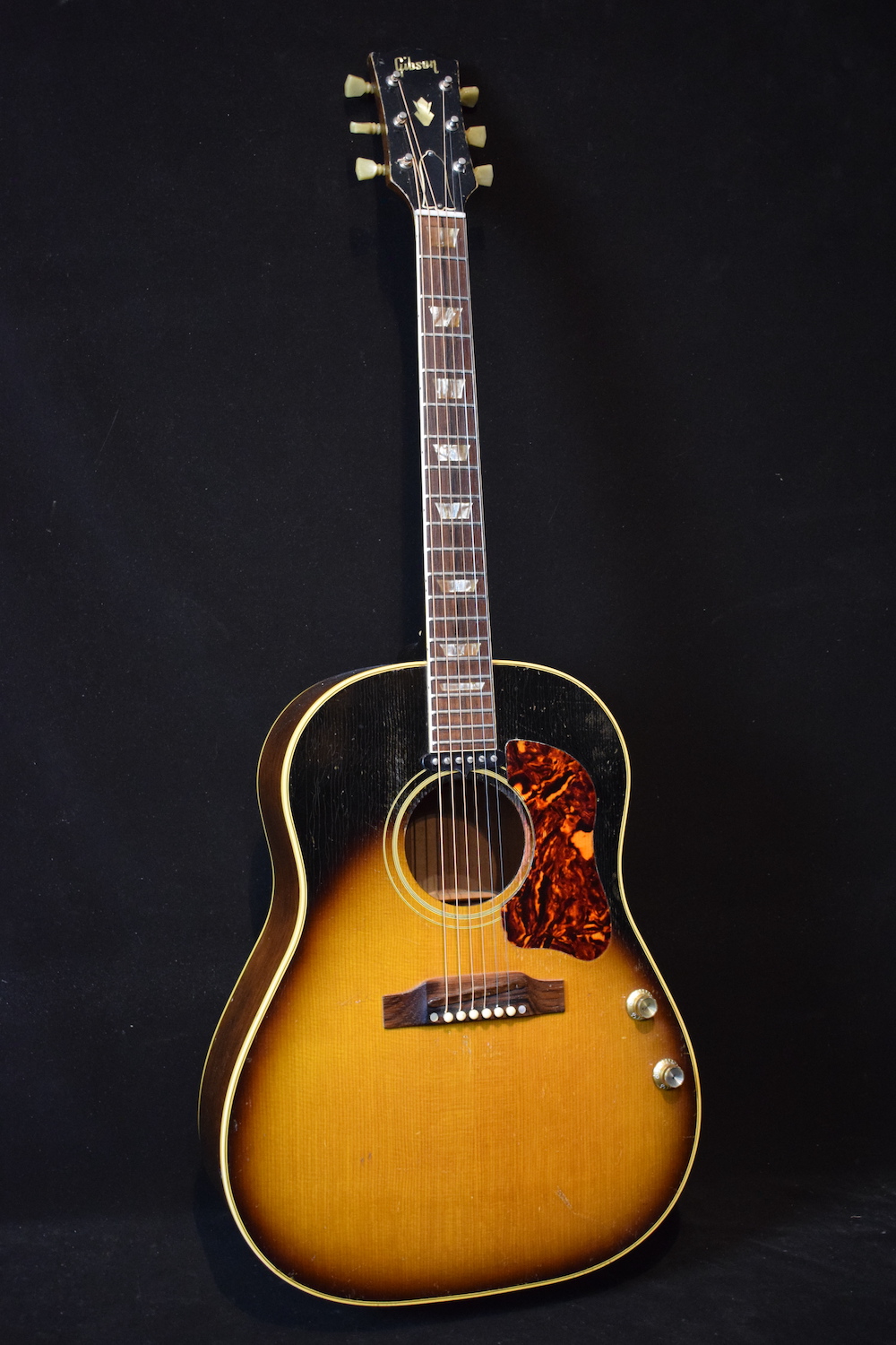 The 1964 Gibson J-160E is an iconic acoustic-electric guitar from the 1960s, and one that is clearly associated with the Beatles. It features a jumbo body with a spruce top and a mahogany body. Its distinctive feature is its single-coil pickup mounted directly on the top, near the fingerboard, which gives it a somewhat raw sound character, somewhere between acoustic and electric. Used by John Lennon and George Harrison, among others, it has become a cult guitar, with a simple, classic look: black pickguard, cream binding, and a beautiful rosewood fingerboard. Not flashy, but full of personality. This particular model is in good condition. It should be noted that the electronics were replaced a few years ago. It works perfectly and the playability is excellent. Comes with a hardshell case.