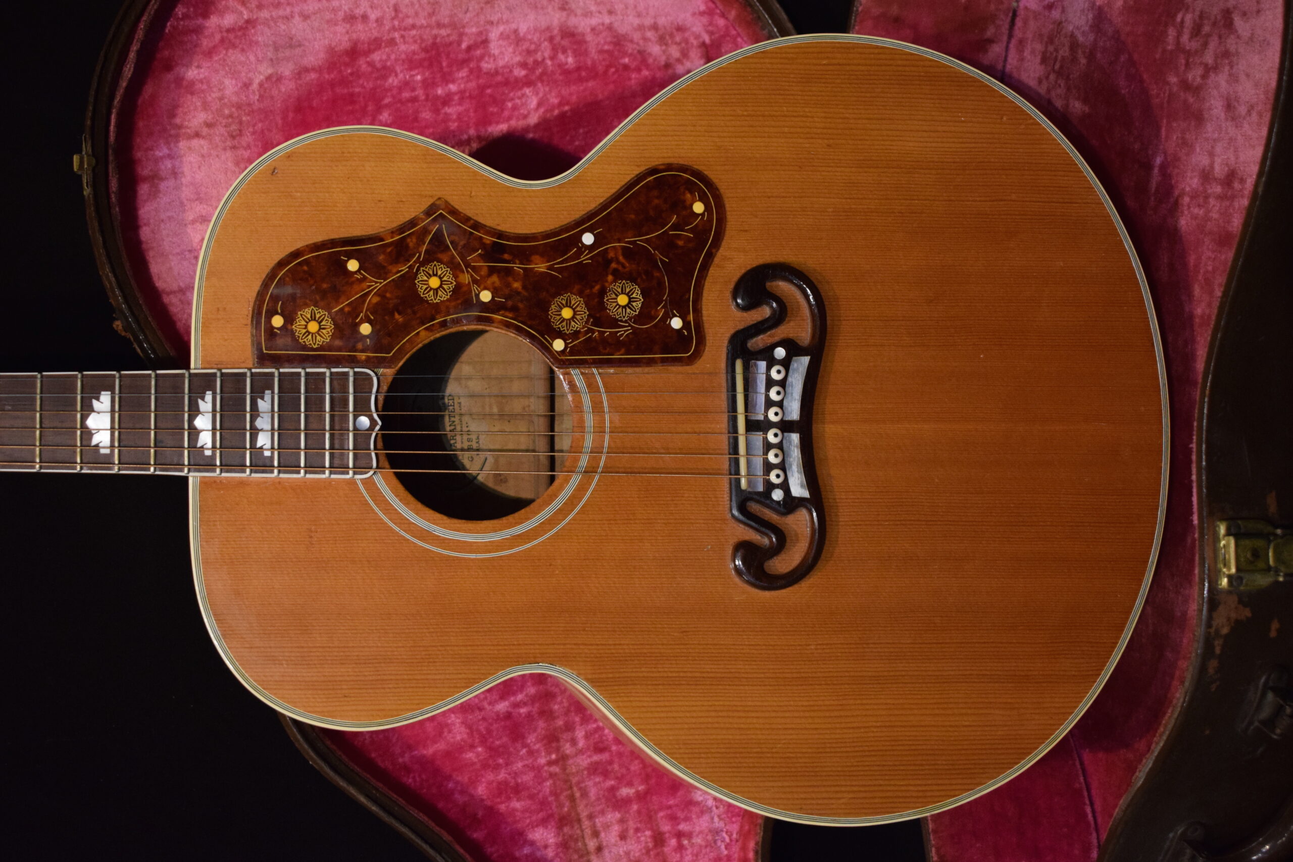 Amazing guitar with incredible tone. Just look at the woods ! Crazy. It is hands down the best playing and sounding J200 we ever had the chance to play. It was repaired on the side, and a crack was cleated on the back. As often the bridge was reglued. No top cracks. It rings like a bell and only weights 1,8kg !! Original Lifton case.
