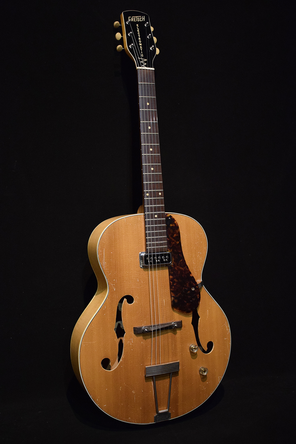 Nice old archtop, made in Brooklyn, NY in 1952. Very good condition. No break, no repairs. Scale length is 24,5″. Very hot and great sounding Dearmond Dynasonic pickup. A rock’n’ roll and rockabilly machine.