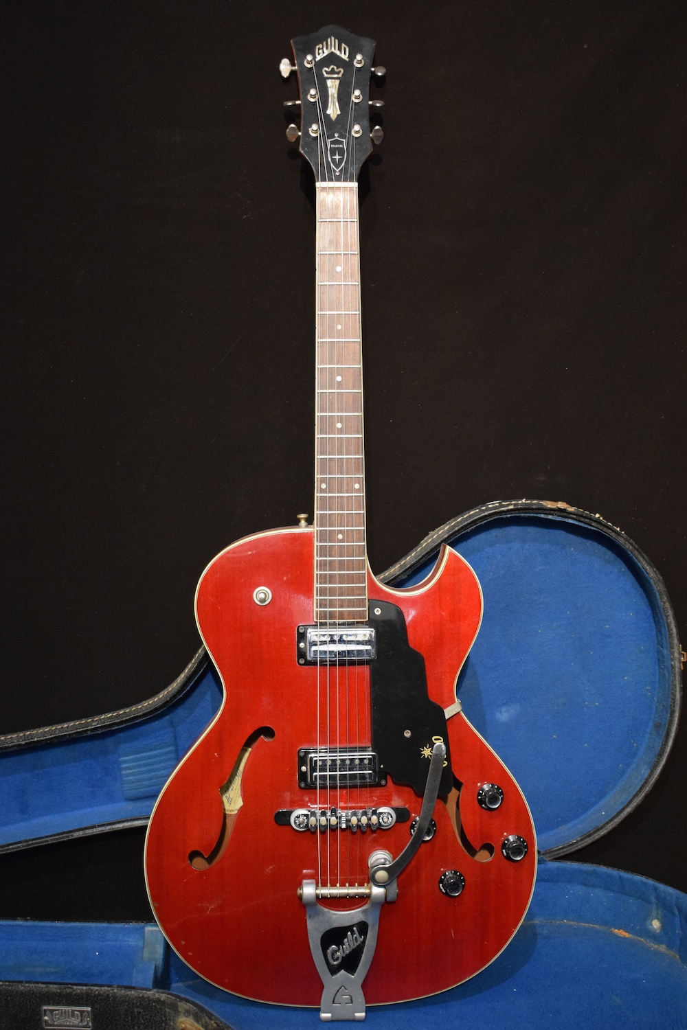 Very cool mid sixties hollowbody guitar. 2 humbuckers. Original factory bigsby. Melita bridge. Some wear on the back. Plays really well all the way up and down. No break, no repairs. OHSC.