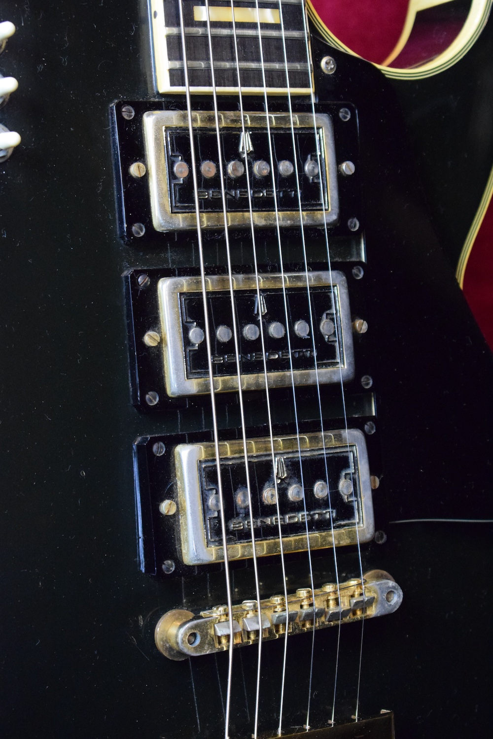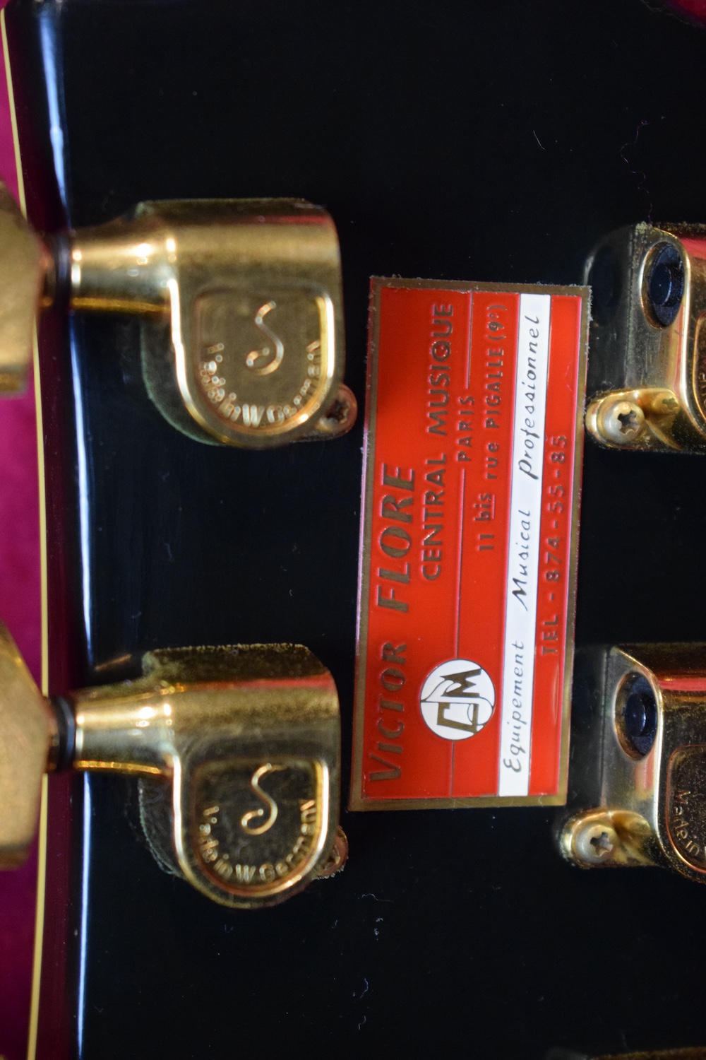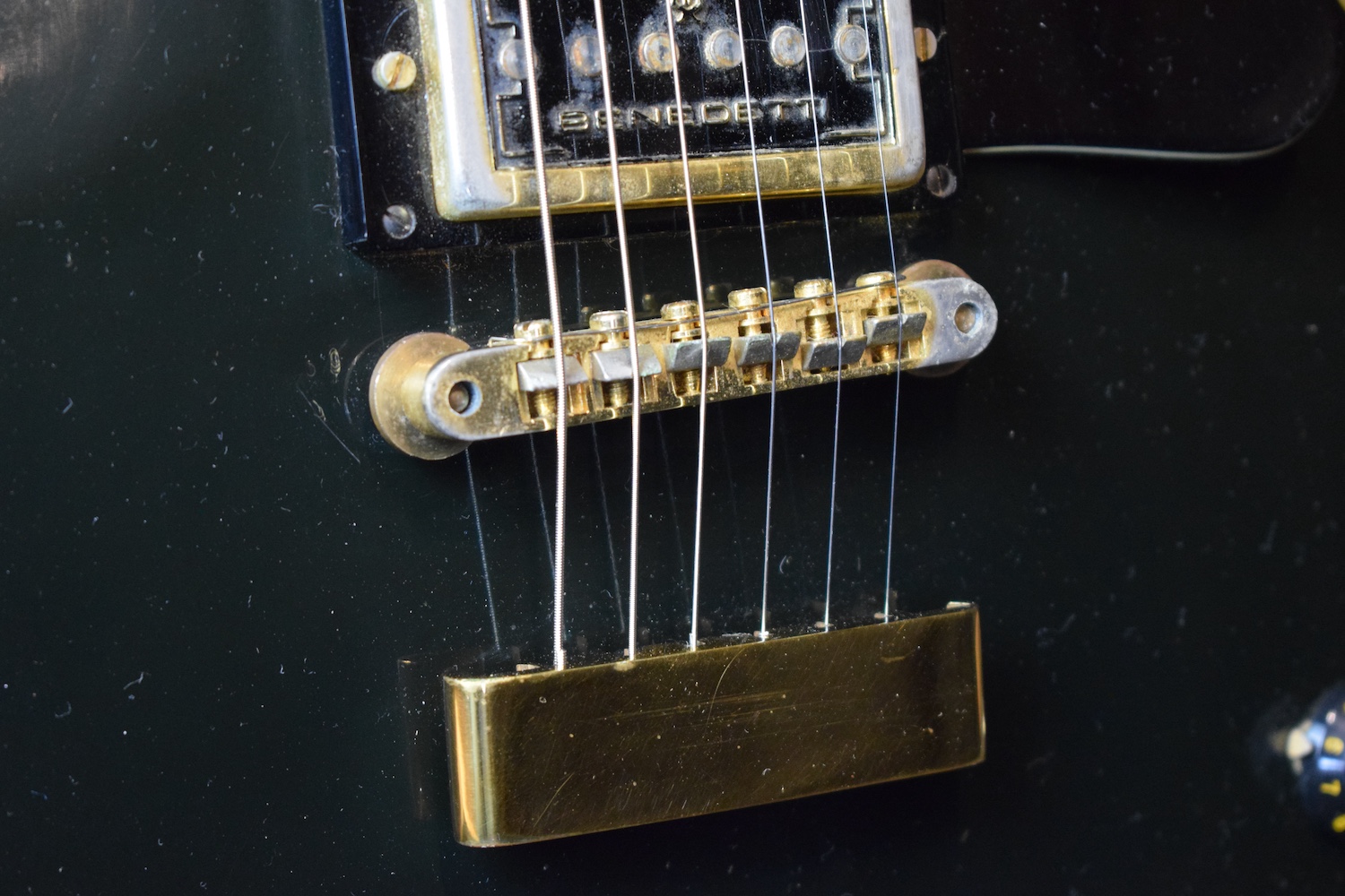 The most iconic model from the famed Parisian luthiers. The body features a glossy black finish in the spirit of the Les Paul Custom models of the period, with a natural patina consistent with its age and no repairs or modifications. The instrument is fitted with three Benedetti humbuckers, their second version, which allows the guitar to be dated to around 1971. Each pickup is controlled by its own independent mini-switch, making it possible to activate or mute each pickup individually and access all possible combinations. The control layout is completed by a master volume and a master tone, following a simple and efficient logic. The neck is comfortable and stable, with an immediate feel and a substantial profile. The guitar resonates well acoustically, a sign of careful lutherie, and responds with precision once plugged in. The original gold hardware, Tune-o-matic–style bridge, and matching tuners integrate perfectly with the overall design, clearly reflecting the strong Gibson influence that inspired this model. Weight is only 3,7kg. An original Paris Flore label can be found on the back of the headstock, the distributor that handled these guitars from the mid-1960s through the early 1970s.