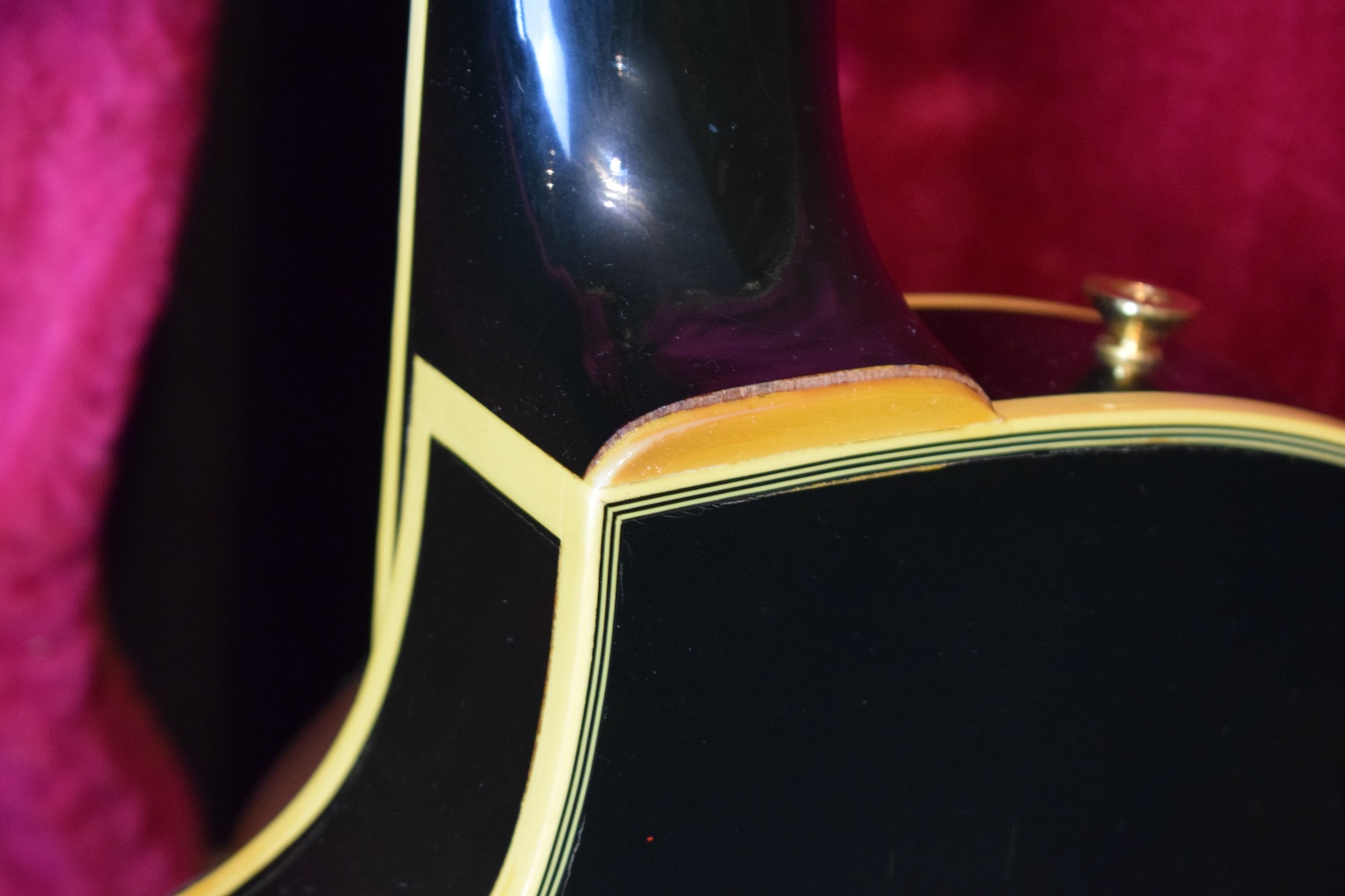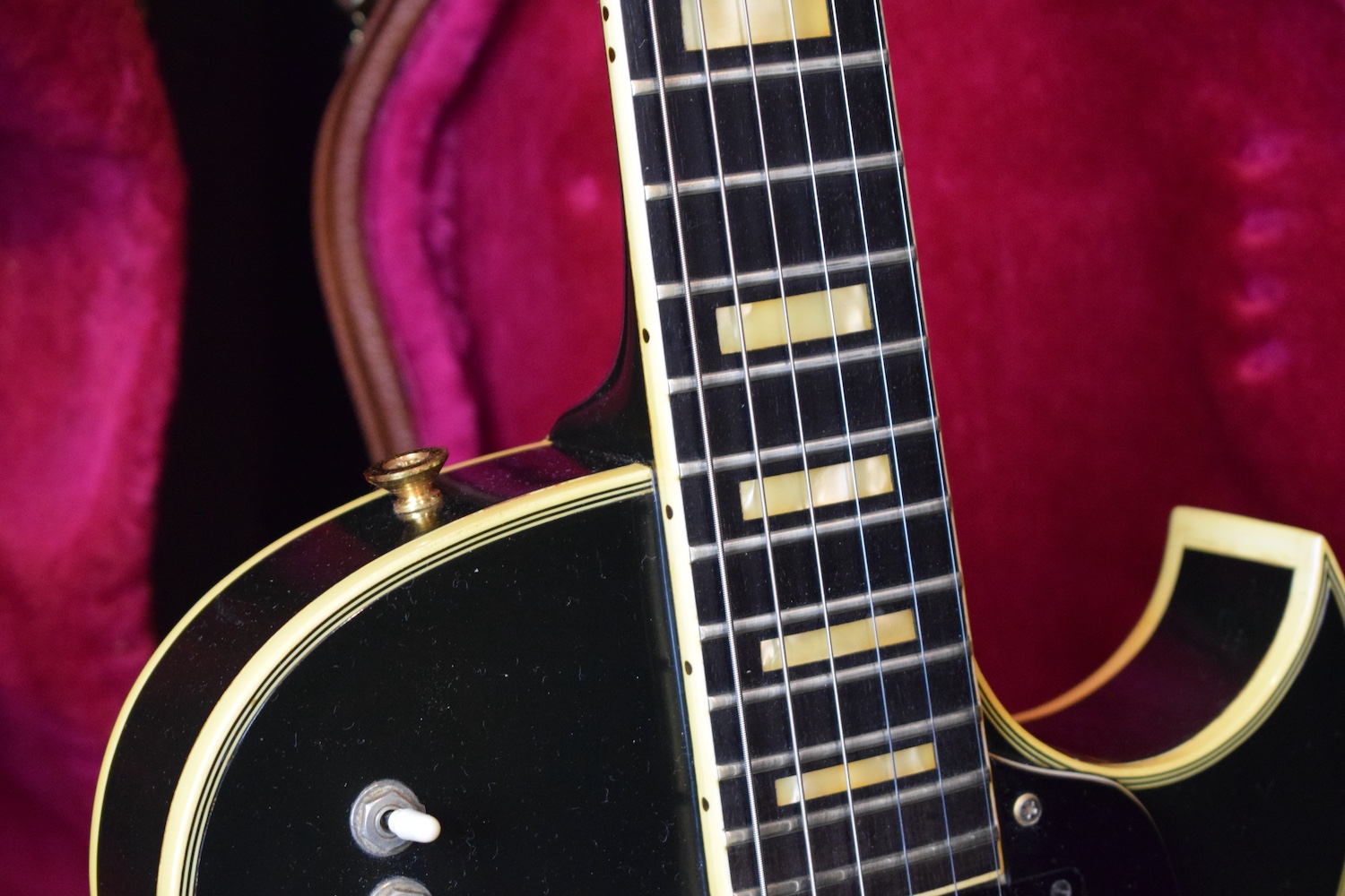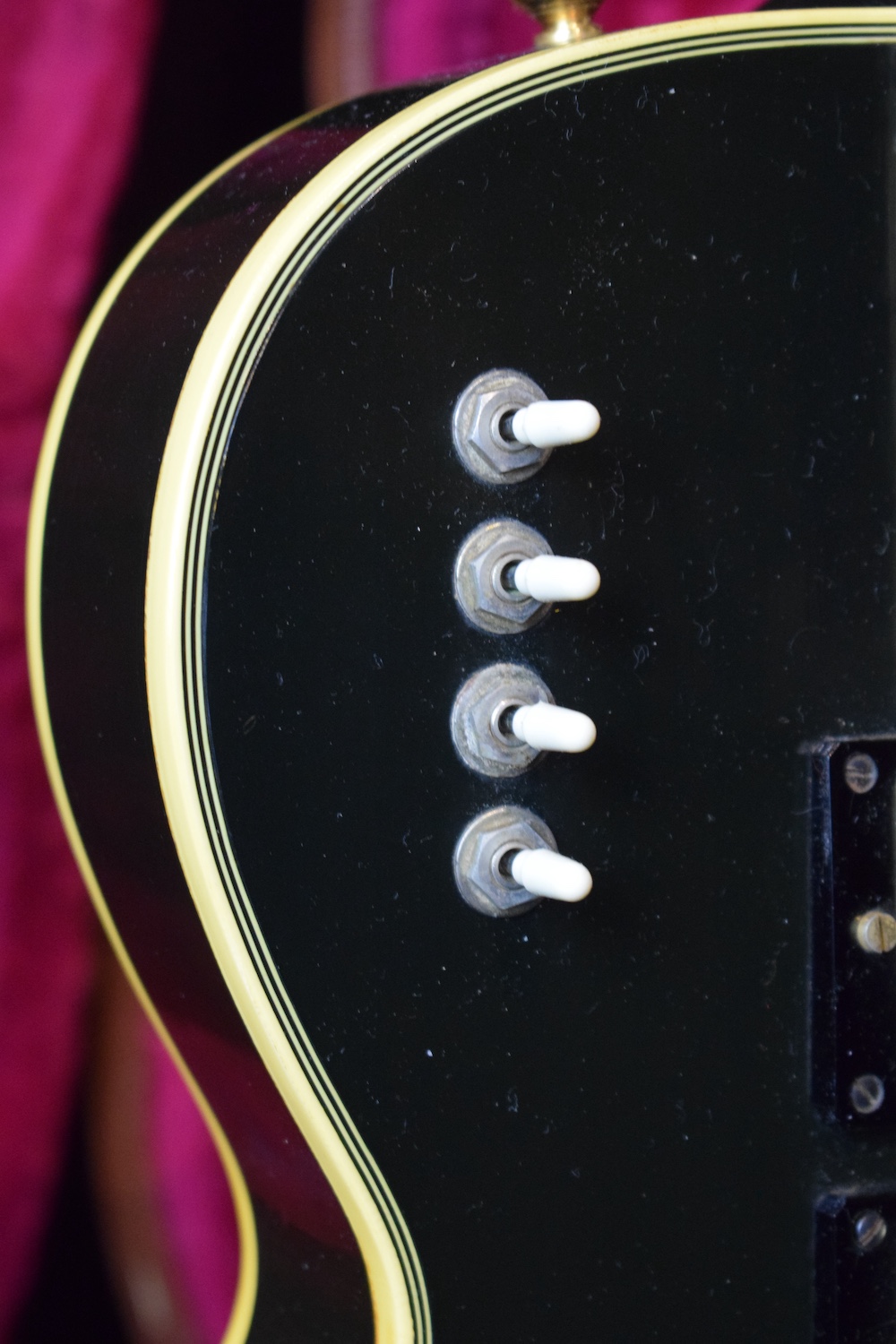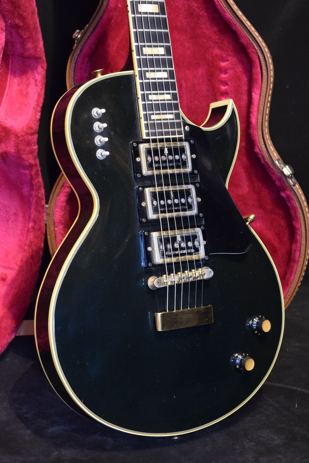 The most iconic model from the famed Parisian luthiers. The body features a glossy black finish in the spirit of the Les Paul Custom models of the period, with a natural patina consistent with its age and no repairs or modifications. The instrument is fitted with three Benedetti humbuckers, their second version, which allows the guitar to be dated to around 1971. Each pickup is controlled by its own independent mini-switch, making it possible to activate or mute each pickup individually and access all possible combinations. The control layout is completed by a master volume and a master tone, following a simple and efficient logic. The neck is comfortable and stable, with an immediate feel and a substantial profile. The guitar resonates well acoustically, a sign of careful lutherie, and responds with precision once plugged in. The original gold hardware, Tune-o-matic–style bridge, and matching tuners integrate perfectly with the overall design, clearly reflecting the strong Gibson influence that inspired this model. Weight is only 3,7kg. An original Paris Flore label can be found on the back of the headstock, the distributor that handled these guitars from the mid-1960s through the early 1970s.