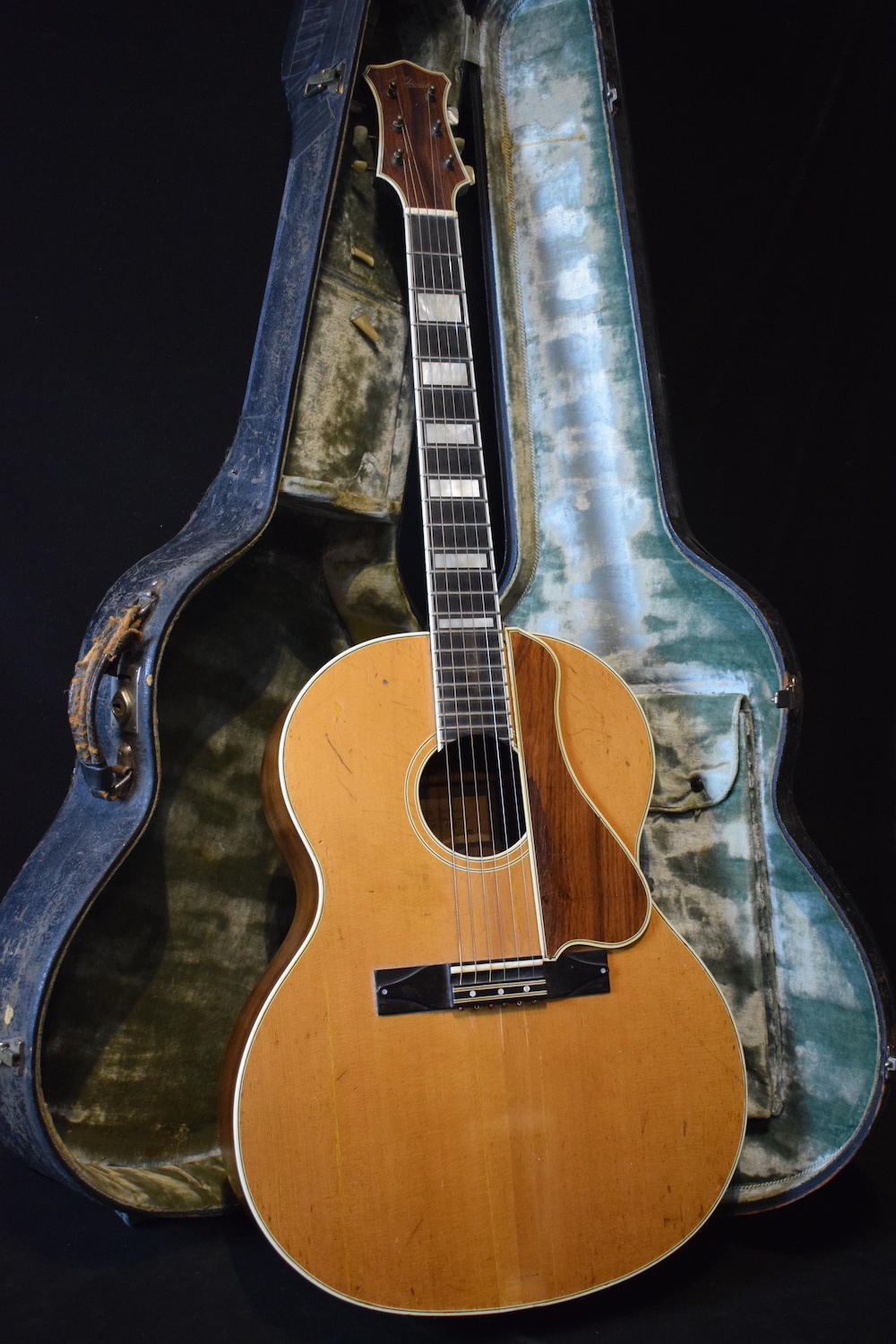 Guitare fabriquée à Vienne en 1936 par Anton Jirowsky luthier en violon, à l’origine d’une longue lignée de luthiers: Père d’Anton Jirowsky II, grand père d’Anton Jirowsky III. Cette jumbo au corps en palissandre de Rio possède une voix vraiment spectaculaire. Les graves sont hallucinants je n’avais encore jamais entendu ça. Le manche est large avec 49 mm au sillet. Pour autant la guitare n’est pas difficile à jouer, elle est très jouable avec un angle et une action parfaite. Ce sera certainement un des instruments qui m’aura le plus marqué cette année. Quelques fentes réparées sur la table mais l’état général est plutôt bon. Une clé permet de sortir le manche. Le pickguard est en Rio. Chevalet en ébène joliment travaillé. Mécaniques originales individuelles. En étui rigide original avec intérieur en velours.