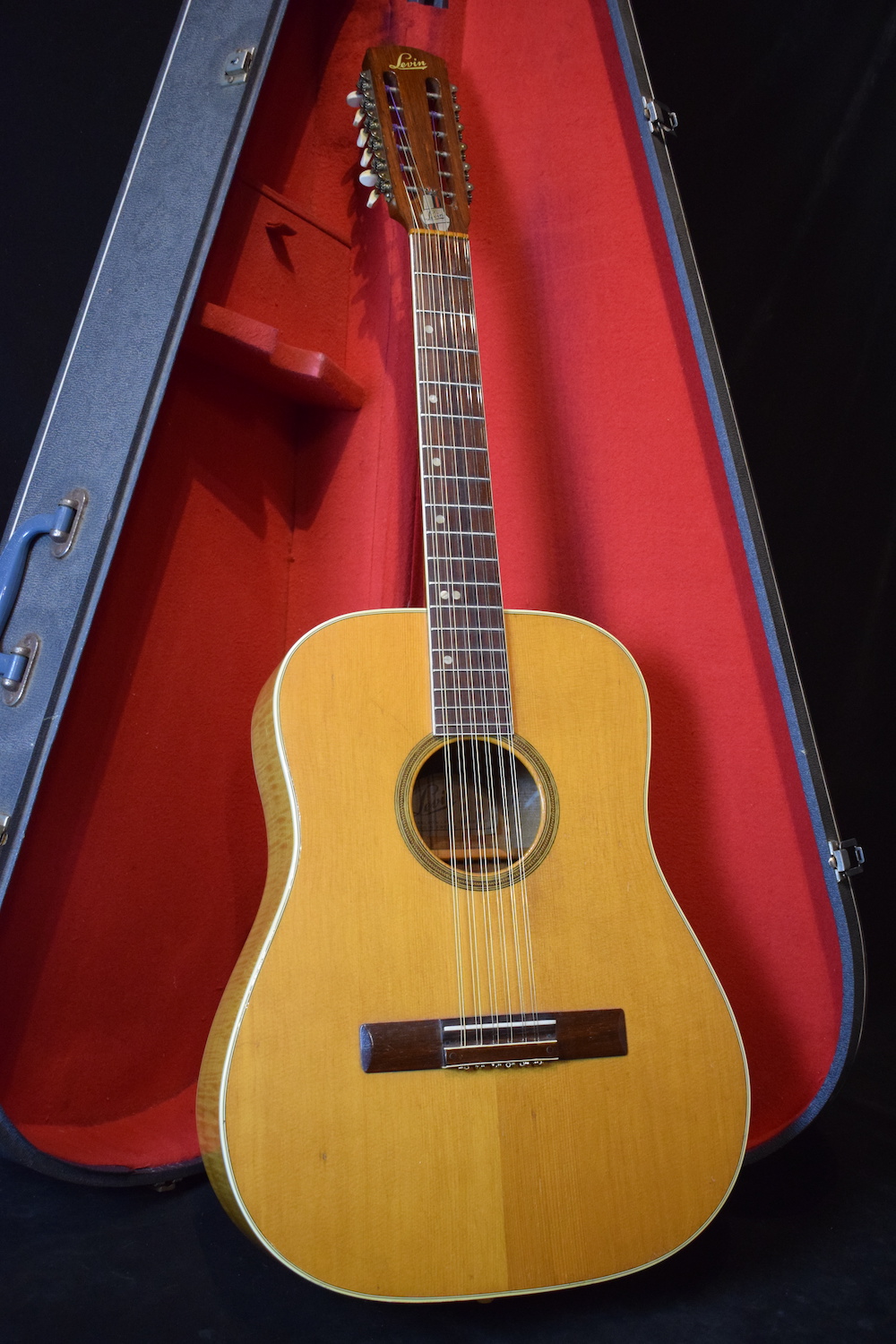 Levin is a Swedish brand that produced simple but quality instruments from the beginning of the twentieth century. The brand also exported under the name Goya to the USA in the 1950s and 1960s. The twelve-string presented here is a well-made model with a mahogany neck, a beautiful spruce top and flamed maple sides and back. The neck is straight and well playable all the way, it’s even comfortable as much as a twelve can be. The guitar is in good condition, without repair, we will simply note that the original tuners have been replaced by others from the same period. Comes with its Polverini case.