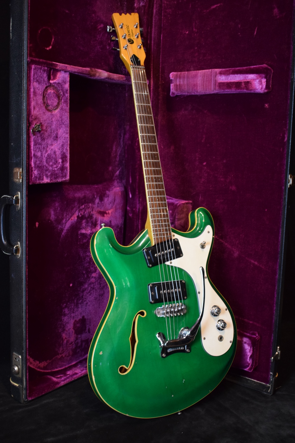 I searched extensively and couldn’t find any other examples of a green Mosrite Combo. It may not be the only one; not everything is on the internet or in books, but in any case, finding another one won’t be easy. It’s therefore a unique collector’s item, especially since it’s in very nice condition and entirely original. The neck is very straight. It still has its original metal nut. The vibrato works well, and the two pickups deliver a powerful sound, a bit like a P90. It’s an instrument with a distinct acoustic dimension, a bit like a Gretsch, but with its own personality due to its solid carved top. It’s very playable and has just been setup. Supplied in its original hardshell case.