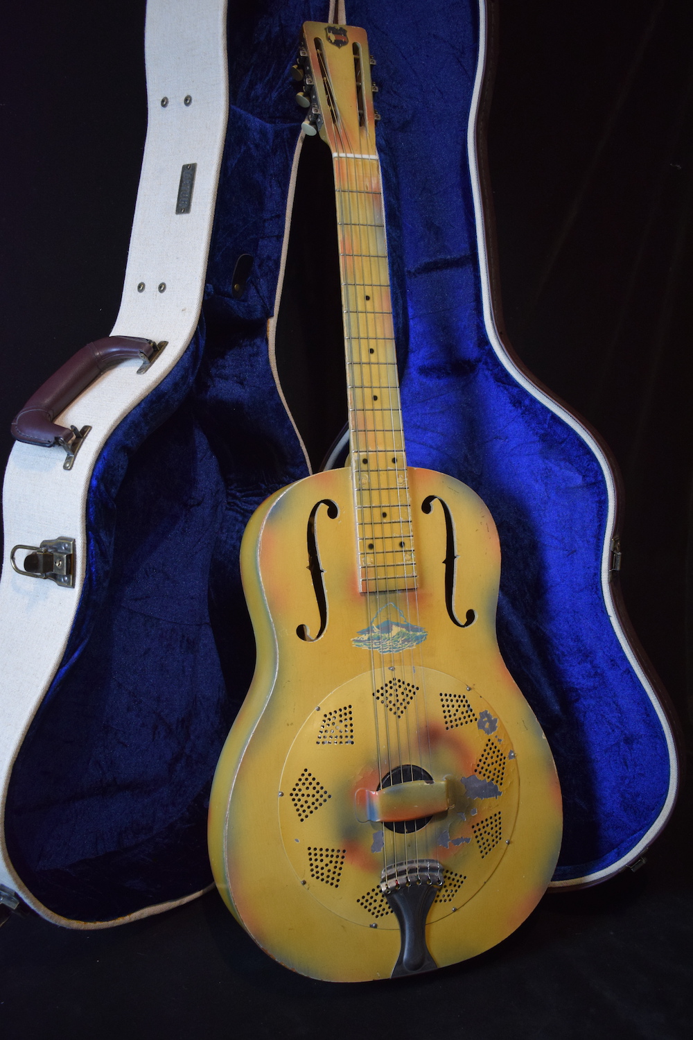 Sublime Triolian from 1929 in excellent condition. In all these years that I have been offering you Nationals and Dobros, this is the first time that I have been able to offer you a Triolian with the wood body. One of the very first ever made. This little beauty passed through Mike Lewis’ workshop some time ago, so the setup is perfect, intermediate fingers/bottleneck as usual. Original cone, tuners and original tailpiece as well. It sounds excellent, it’s beautiful, there’s nothing to complain about really, it’s such a nice piece. Coems in a white tweed Gator case that fits very well.