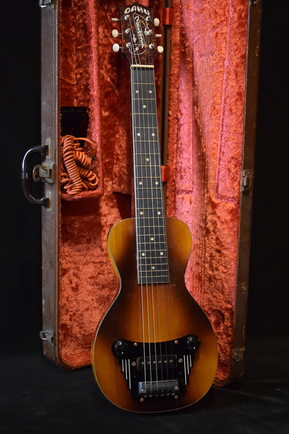 Very nice lap steel. Complete with its case and its cover which is stored in the case. Absolutely amazing and original pickup. Works very well, no break or repair. In original hard case.