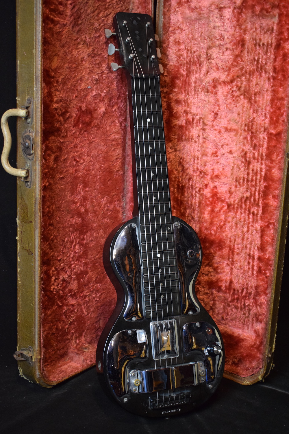 A couple of decades before the Beatles, Rickenbacker was already making fantastic instruments. This model from the golden age of the brand is equipped with the famous horse shoe pickup. In my humble opinion one of the best and hottest pickup ever designed. The instrument has had some modifications to the electronics which are visible on the chrome plates. However, the original elements have fortunately been preserved and it is today in its original configuration. The tuners have been modified but work well. The knob is a newer Rickenbacker. It’s a player and what a player! If you are looking for a good lap this one is simply the best you can find, again this is only my opinion, but being a lap player myself for almost 30 years I have never found better than these models, including Gibson. In a period case with a nice little wooden handle.