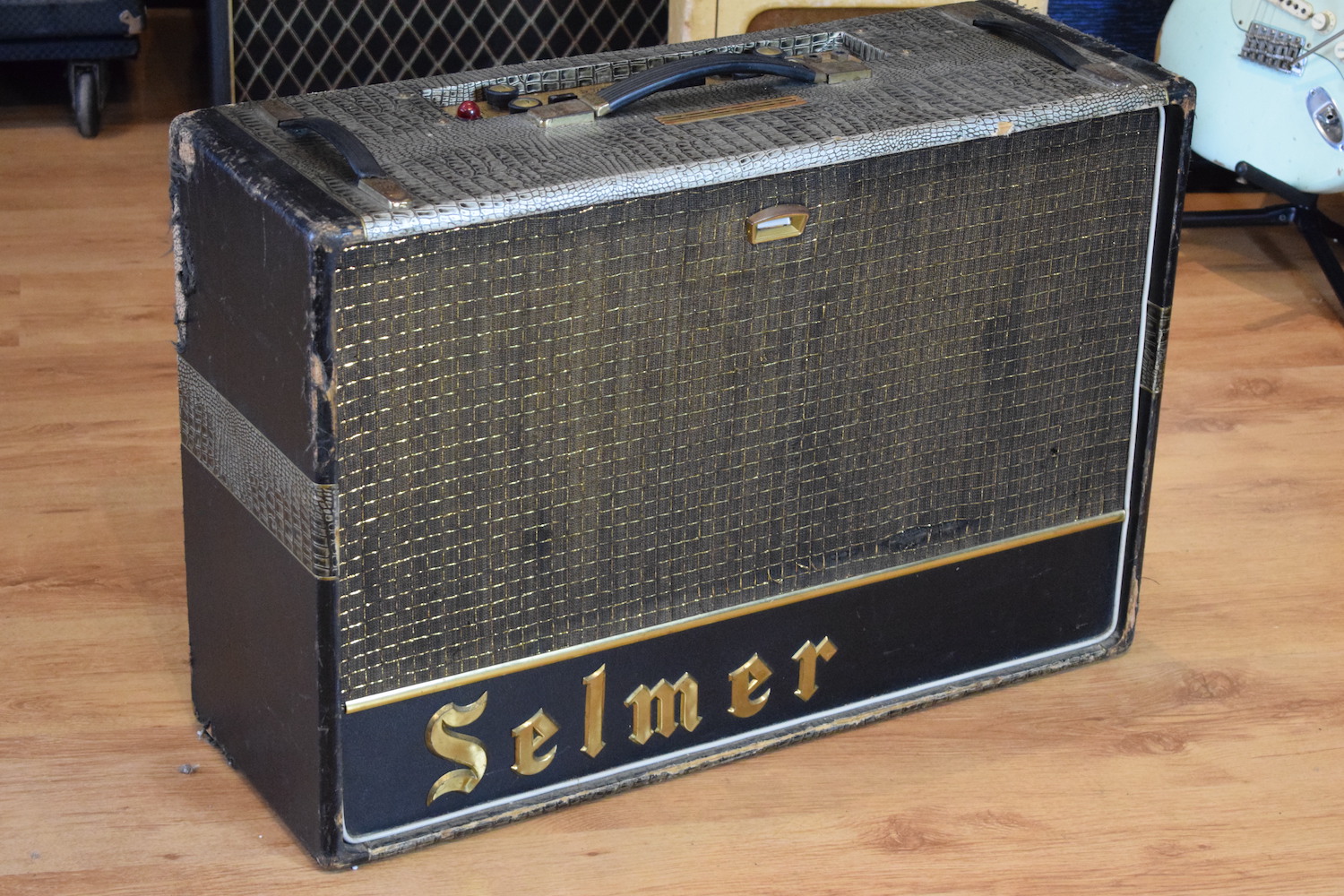 One of my favorite amps. This is the 30-watt version of the Zodiac with its two original Celestion G12s. It has two channels, as always on the Zodiac: one with just one volume and one tone, great to get that organic saturation. The other channel has a rotary and push-buttons tone control, a bit like an ES345, with filters ranging from high to low, including out-of-phase. On this same channel, you’ll also find what, to my ears, is the most beautiful tremolo of this era. The overall condition is good, with a few scuffs on the sides, but the grill is in good condition, as is the log. The knobs are original. It has its original footswitch. One of the best amp used in the British Invasion.