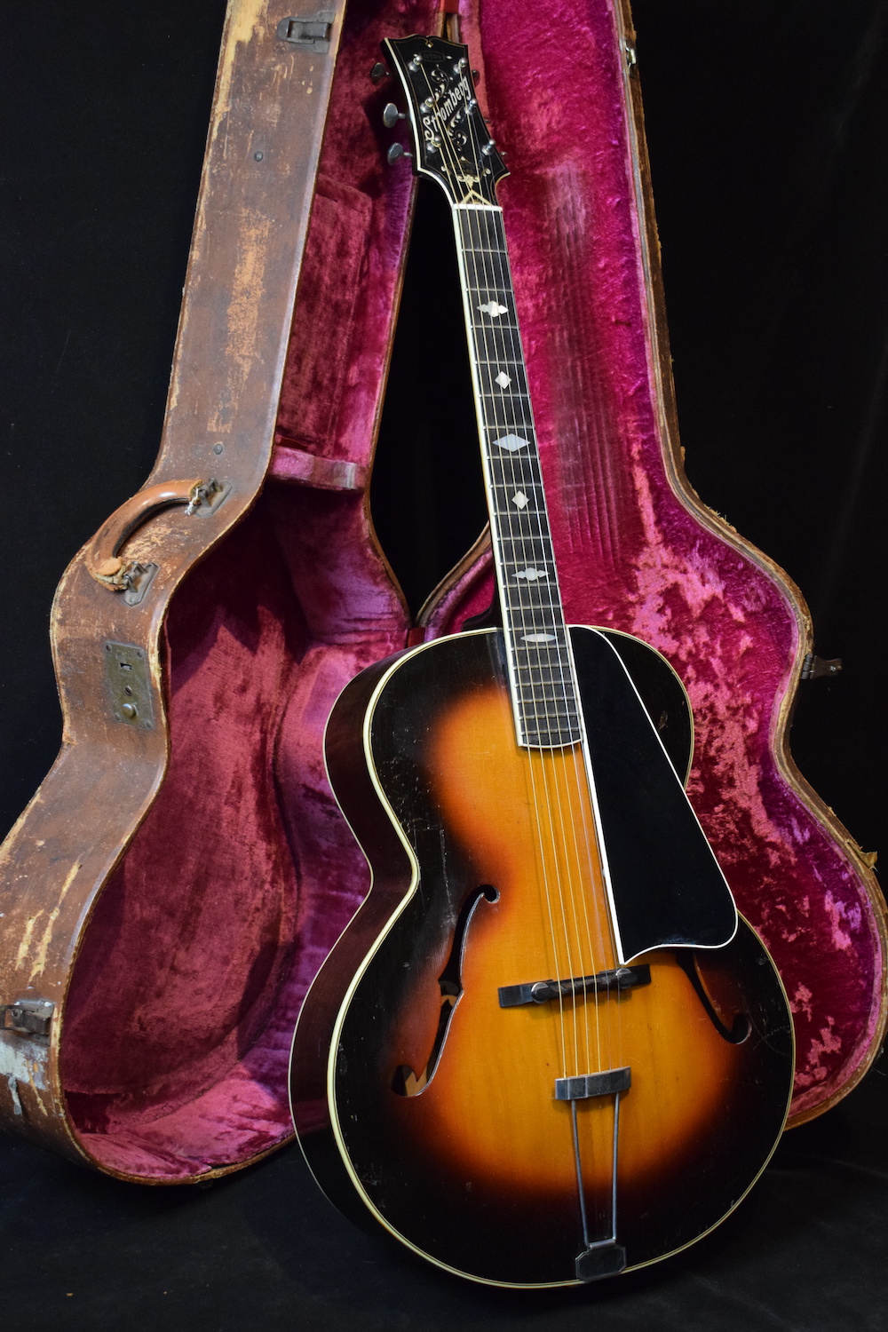 Stromberg, a family that has left its mark on the history of jazz and North American lutherie. Founded by Charles Stromberg in 1906, they produced only about 600 instruments until 1955. They helped shape jazz as we know it today. Their guitars are highly prized by collectors today, as well as players, for their exceptional sound quality. The G-100 model presented here, for example, features double tone bar bracing, a design developed by Elmer, the youngest son of Charles Stromberg, recognized as the most gifted luthier in the family and certainly one of the best of his time. This guitar features a spruce top with a beautiful, tight grain, and laminated maple back and sides. The finely engraved headstock features Stromberg’s delicate signature, surrounded by small decorations, as well as a banner indicating the “G100” model. The fingerboard is bound with binding and adorned with large mother-of-pearl block markers, in the style of high-end archtops like the Gibson L-5 or certain luxury Epiphone models. And it’s essentially the same type of feel and sound as on this kind of high-end prewar model. A very powerful, straight yet enveloping sound, rich in harmonics. The sustain is pretty incredible, I think, and very precise too. The pickguard and bridge have been replaced, a common feature of these old archtops. A crack at the F-hole on the lower side has been repaired; it has been stable for a long time. The playability is perfect, the action is very low, no fretting, the neck is straight, and the frets are of a very good level. Comes with a vintage Lifton case. It deserves it.