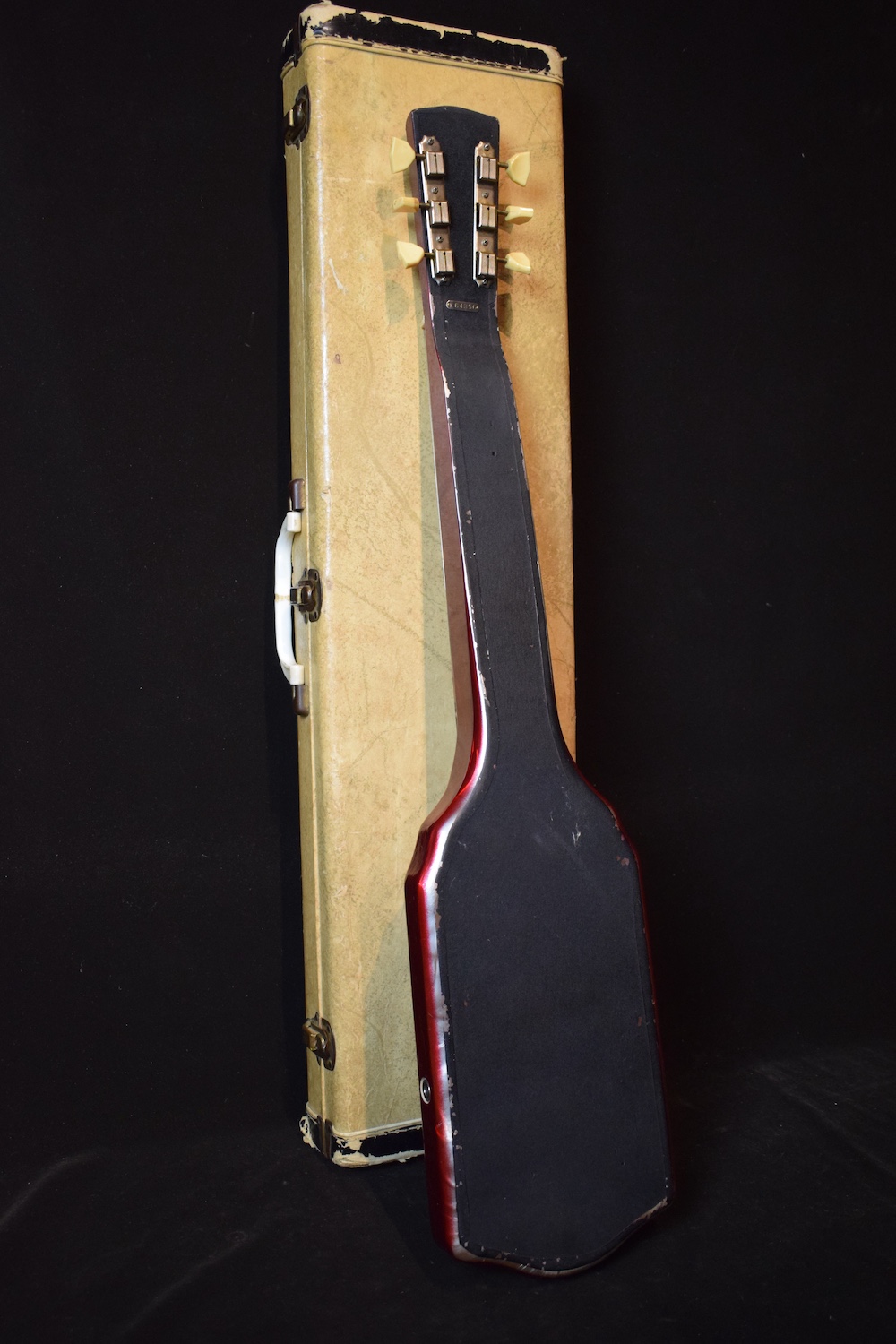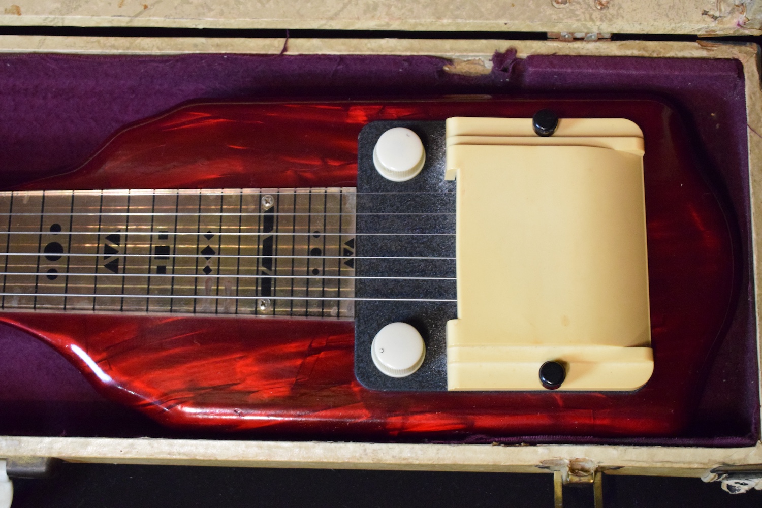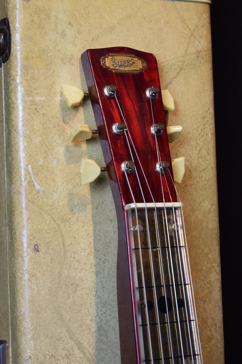 Beautiful lap steel guitar with a pearloid red finish, reminiscent of an accordion. This color is typical of Supro guitars from the 1950s, a time when these very popular instruments were mass-produced by Valco in Chicago. The serial number on the small plate on the back of the headstock allows for fairly precise dating. This is an original instrument with its Kluson tuners featuring large tulip-shaped buttons. Its pickup and potentiometers are also original. Perfect for the beaches of Hawaii, Texas country, or Delta blues. It comes with its original hard case.
