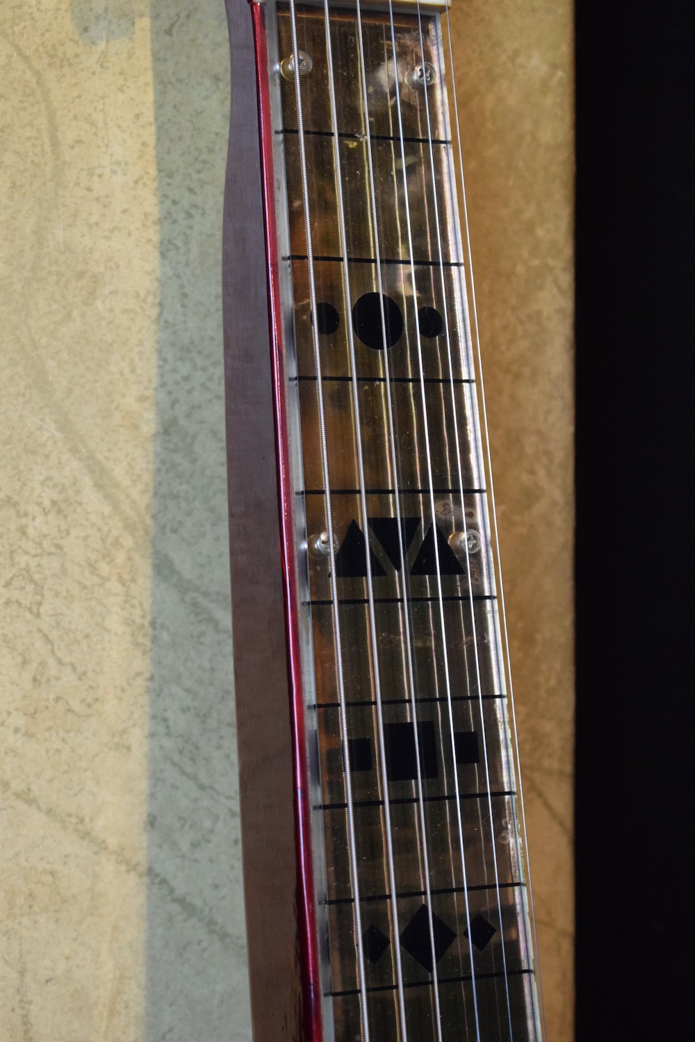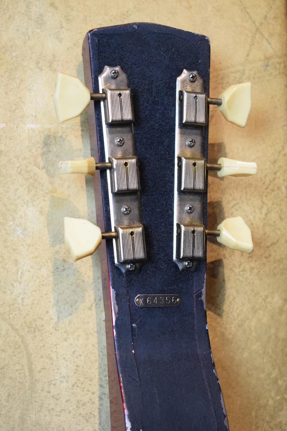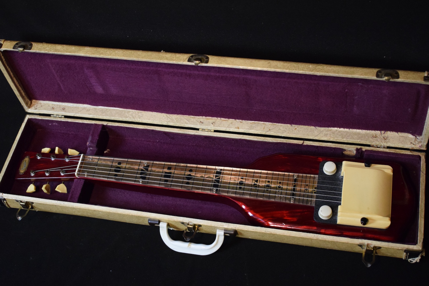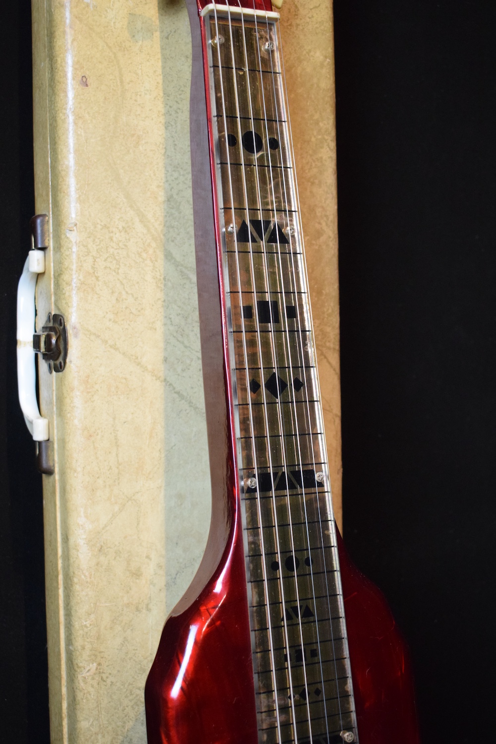 Beautiful lap steel guitar with a pearloid red finish, reminiscent of an accordion. This color is typical of Supro guitars from the 1950s, a time when these very popular instruments were mass-produced by Valco in Chicago. The serial number on the small plate on the back of the headstock allows for fairly precise dating. This is an original instrument with its Kluson tuners featuring large tulip-shaped buttons. Its pickup and potentiometers are also original. Perfect for the beaches of Hawaii, Texas country, or Delta blues. It comes with its original hard case.