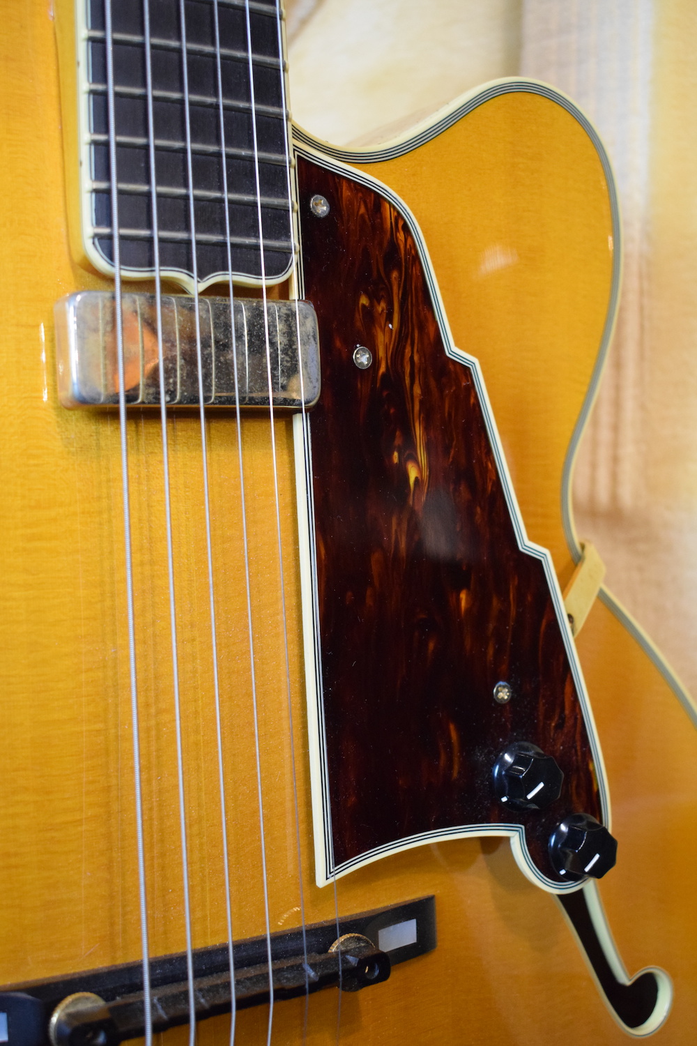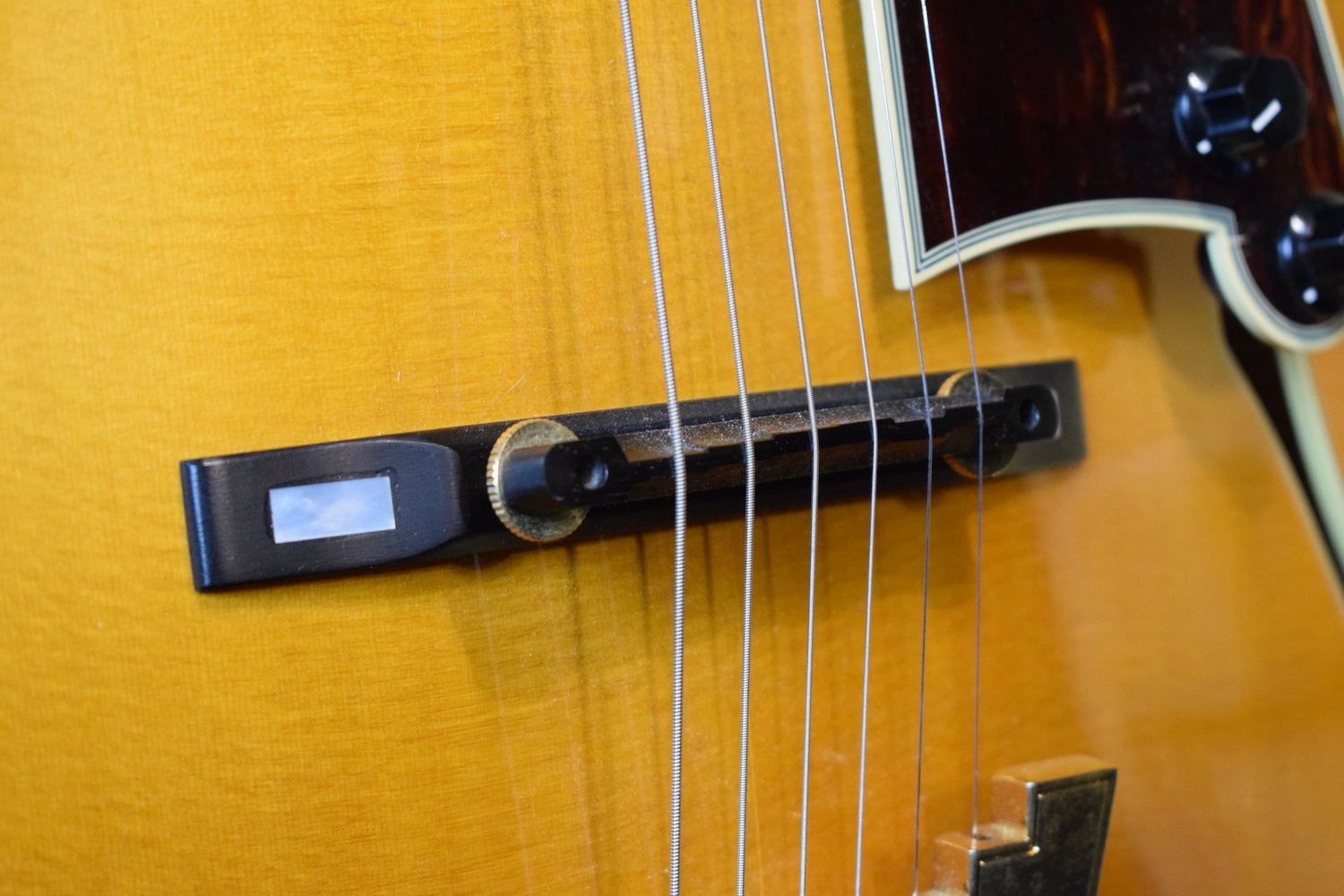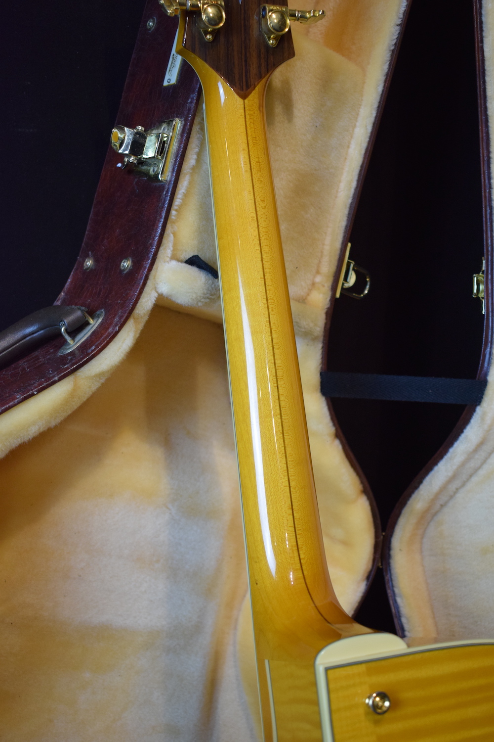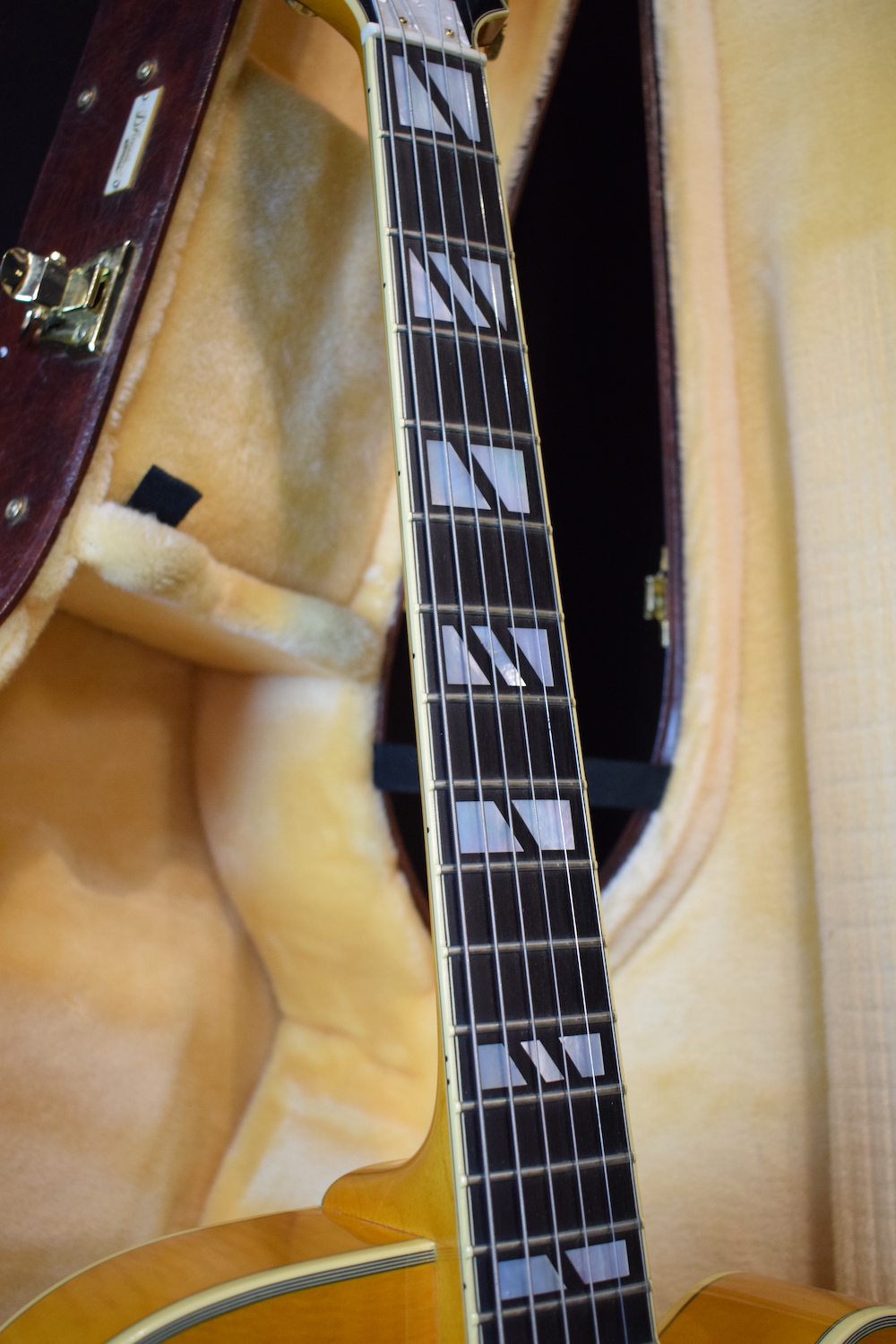Cet instrument fait partie de la brève série fabriquée par Vestax , au Japon au début des années 2000, et qui s’est déjà taillée une belle réputation auprès des amoureux du jazz, des archtops et de la belle lutherie. Ce modèle est en excellent état, sans réparation. La guitare est monté avec un micro de type Johnny Smith récent et fourni avec le micro original qui est dans l’étui. Très facile à remonter, juste un point de soudure si besoin. La guitare est parfaitement jouable et sonne déjà très bien à vide. Elle est fournie avec son certificat d’authenticité et son étui d’origine lui aussi en très bel état.