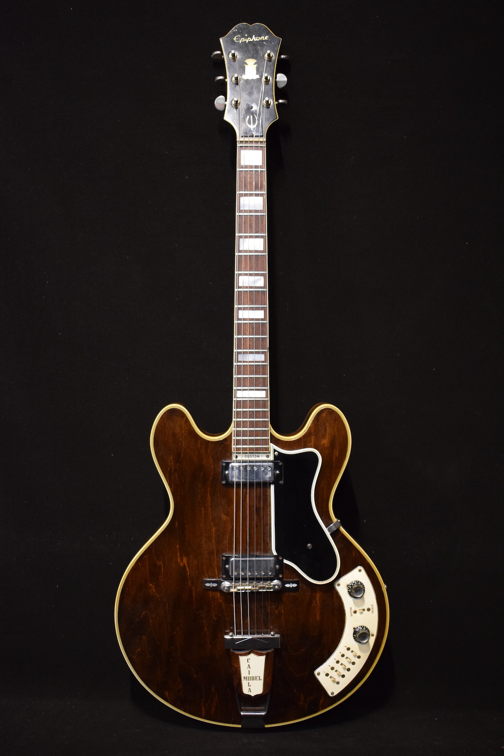 Et voilà encore une Al Caiola custom. Et oui il y en a 2 à la boutique. J’adore ces modèles, tellement agréables à jouer. Un diapason de 25,5″, un poil plus long que d’habitude. Une largeur de manche idéale avec 42,8mm au sillet, comme sur les belles Gibson d’avant 65. Une résonance à vide assez importante, mais pas d’ouïes, donc aucun feedback. Un panel de filtres très efficaces, et surtout combinables, ce qui n’est pas possible sur une 345 avec varitone par exemple. Un outil redoutable pour le studio. Ce modèle en particulier est en bon état avec des marques de jeu assez prononcées au dos mais il n’ a subi aucune casse ou réparation. On peut également voir, mais uniquement à contre jour que quelques mots d’une setlist se sont imprimés sur le vernis. L’encre du marqueur a réagi avec le vernis, classique. La guitare est fournie avec un étui Hiscox qui la protège bien.