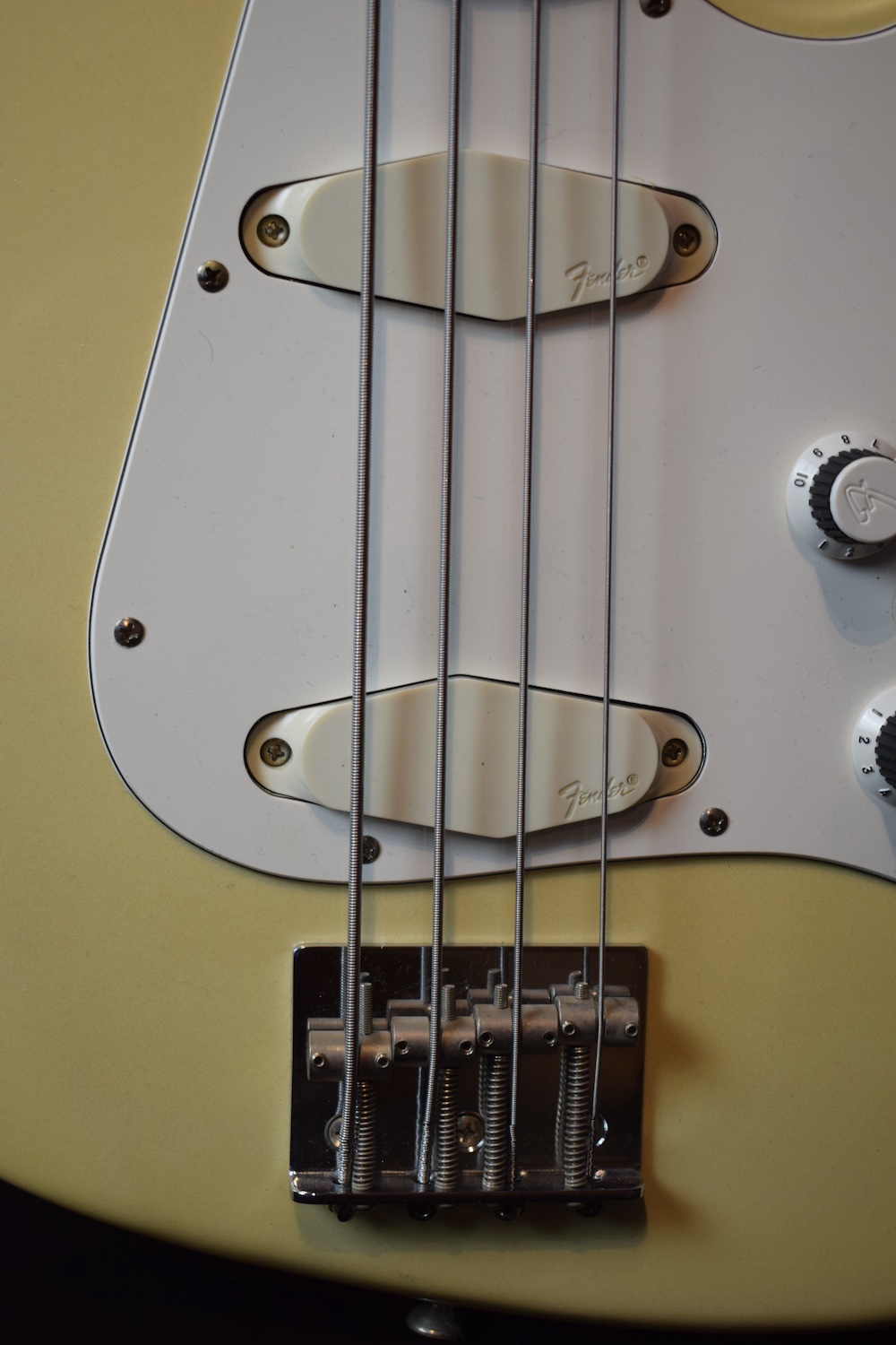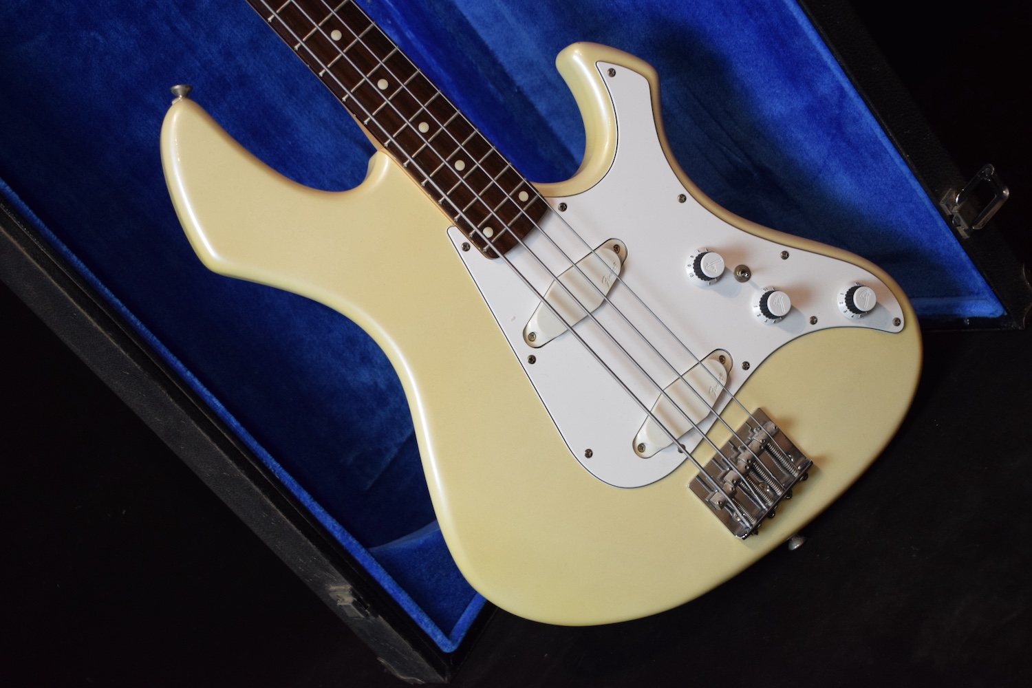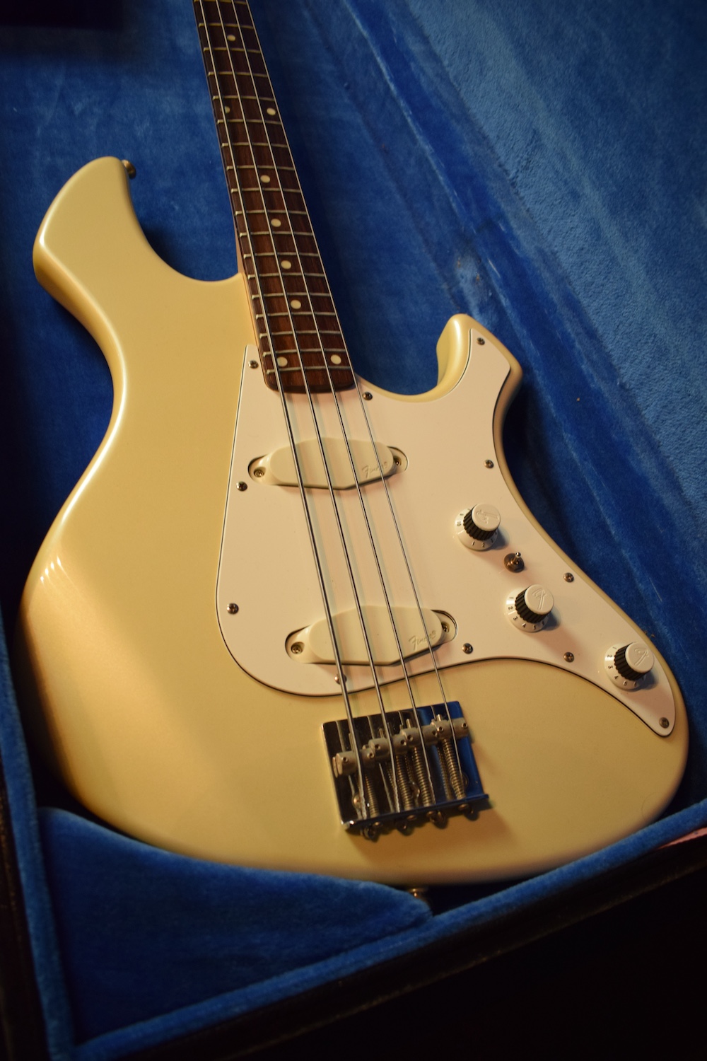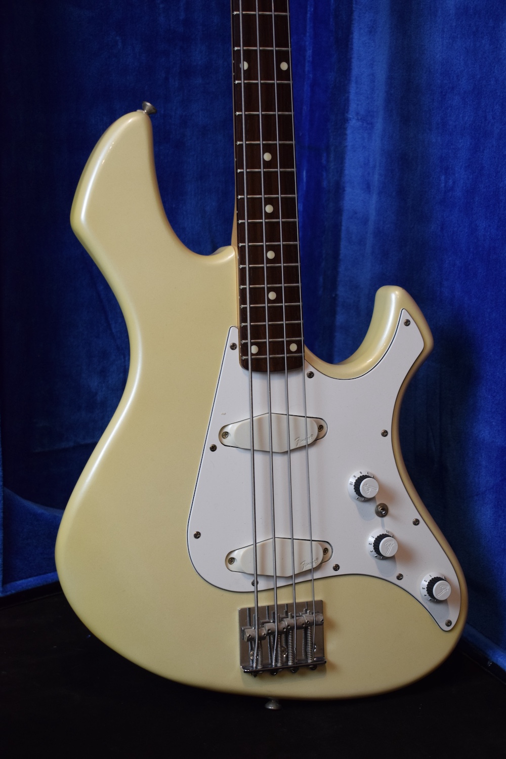 Voici une basse intéressante que je n’avais encore jamais eu l’occasion de vous présenter. La série Performer fut brièvement produite au Japon au milieu des années 80, une période réputée pour sa qualité de fabrication au pays du soleil levant. Ce modèle très peu courant fait partie des tentatives de Fender pour entrer sur le marché des instruments modernes typés rock à l’époque, avec un design et des spécifications radicalement différents des Precision ou Jazz Bass traditionnelles. Elle a un niveau de sortie très important avec beaucoup de punch et possède un manche 24 frettes choses rare chez Fender.