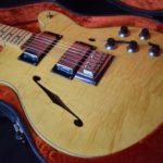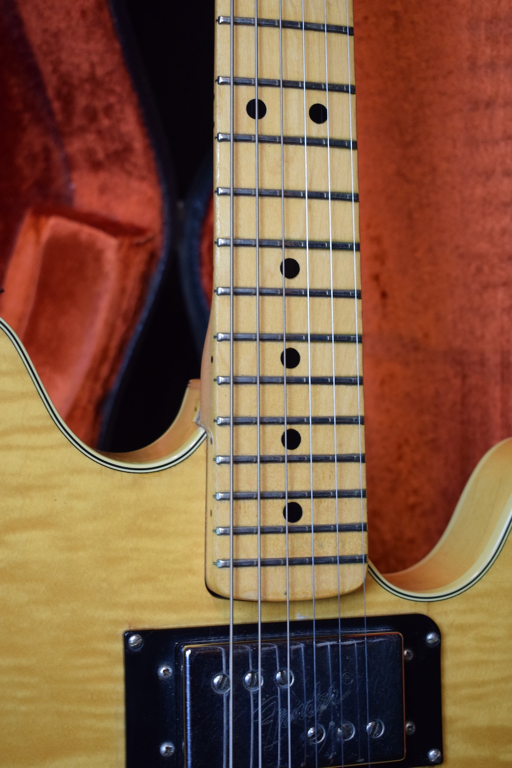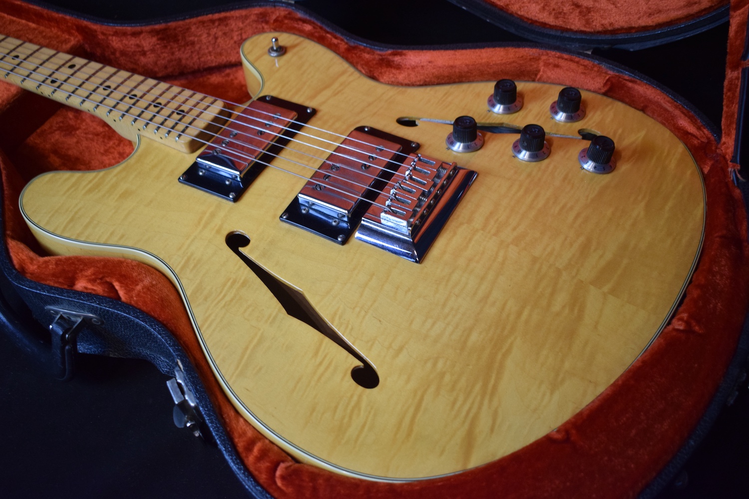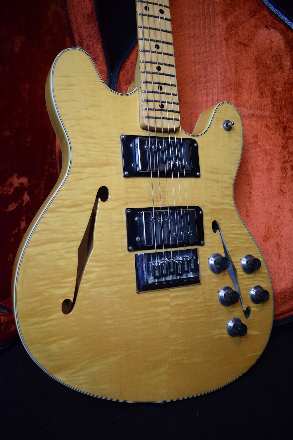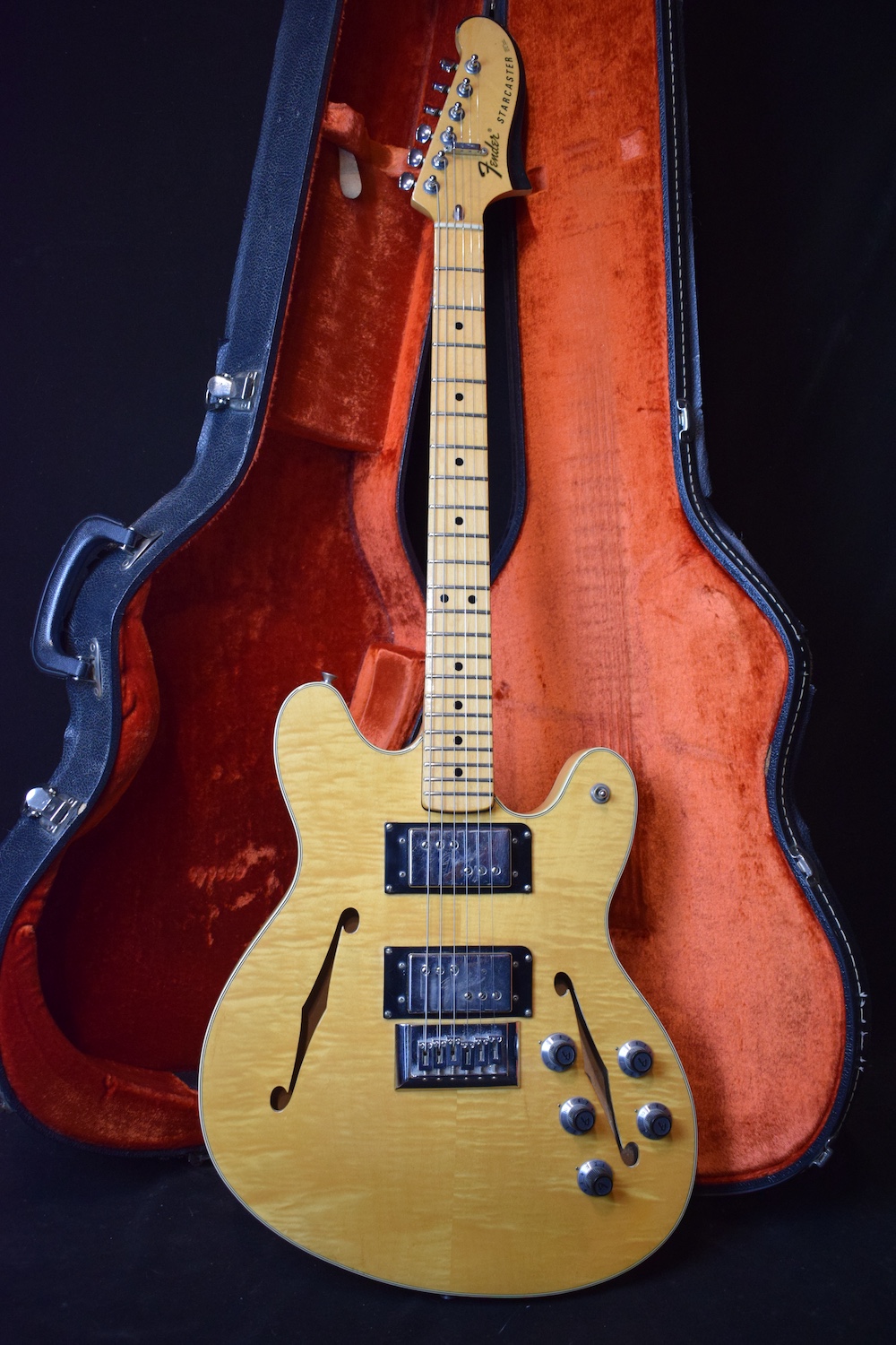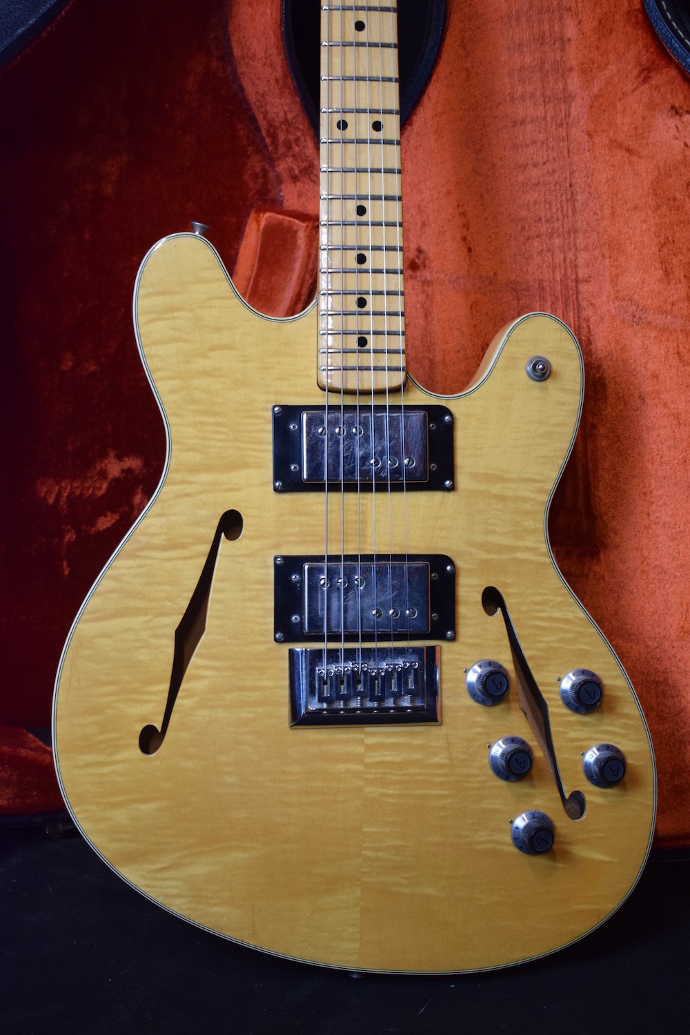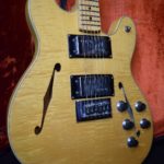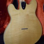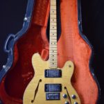 La Starcaster à mon sens illustre très bien la capacité de Fender à fabriquer d’excellents instruments au sein des années 70. Elle était conçue comme un instrument haut de gamme, une offset semi hollowbody, sorte de réponse à la toute aussi excellente Gibson Les Paul Signature qui était sa contemporaine. Fender n’était clairement pas connu pour ses semi-hollowbody et ils ont pourtant réussi leur pari à mon sens. La lutherie est impeccable, y compris la défonce du corps pour accueillir le manche qui peut être assez peu ajustée sur d’autres modèles, à cette époque, est ici parfaite. Les essences sont très bien choisies et absolument magnifiques, surtout comme ici dans sa version naturelle. Le pickguard manquant pourrait même être un choix esthétique cohérent tant l’érable est beau. Elle est équipée de 2 micros humbuckers wide range conçus par Seth Lover, tout simplement l’inventeur du micro double s’il vous plait. Un homme à qui la guitare électrique moderne doit beaucoup. Cet instrument joue à la perfection. On retrouve beaucoup la Starcaster depuis quelques décennies dans des groupes rocks majeurs tels que Radiohead, notamment sur OK computer, ou chez Artic Monkeys. Elle a également été occasionnellement utilisée en jazz fusion même si ce n’est pas pour cela qu’elle est connue du grand public, c’est une guitare capable de beaucoup de choses.