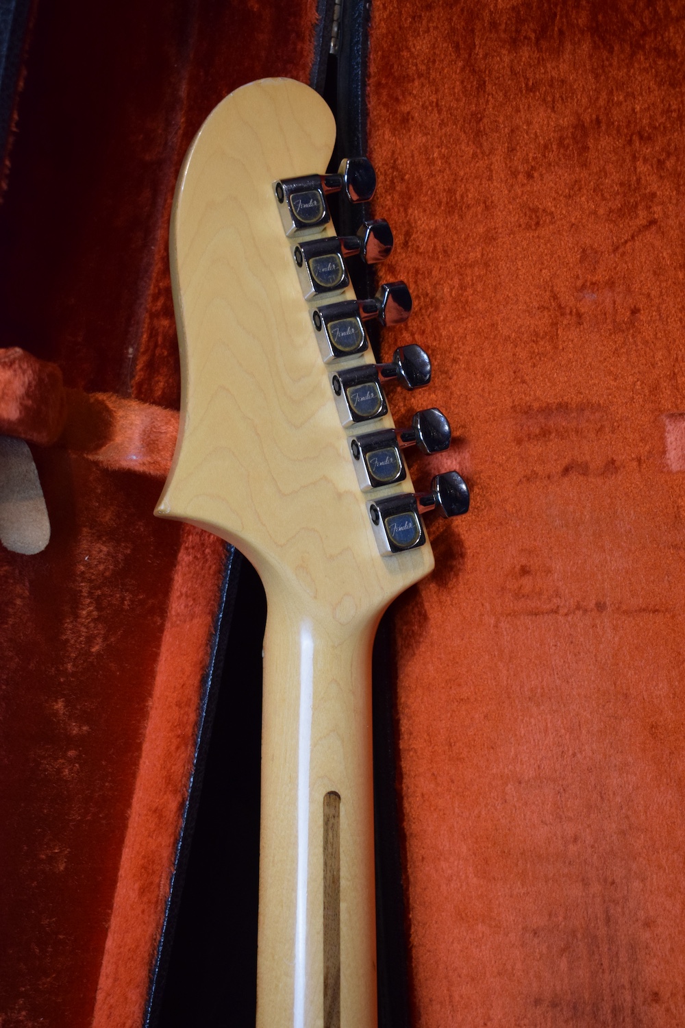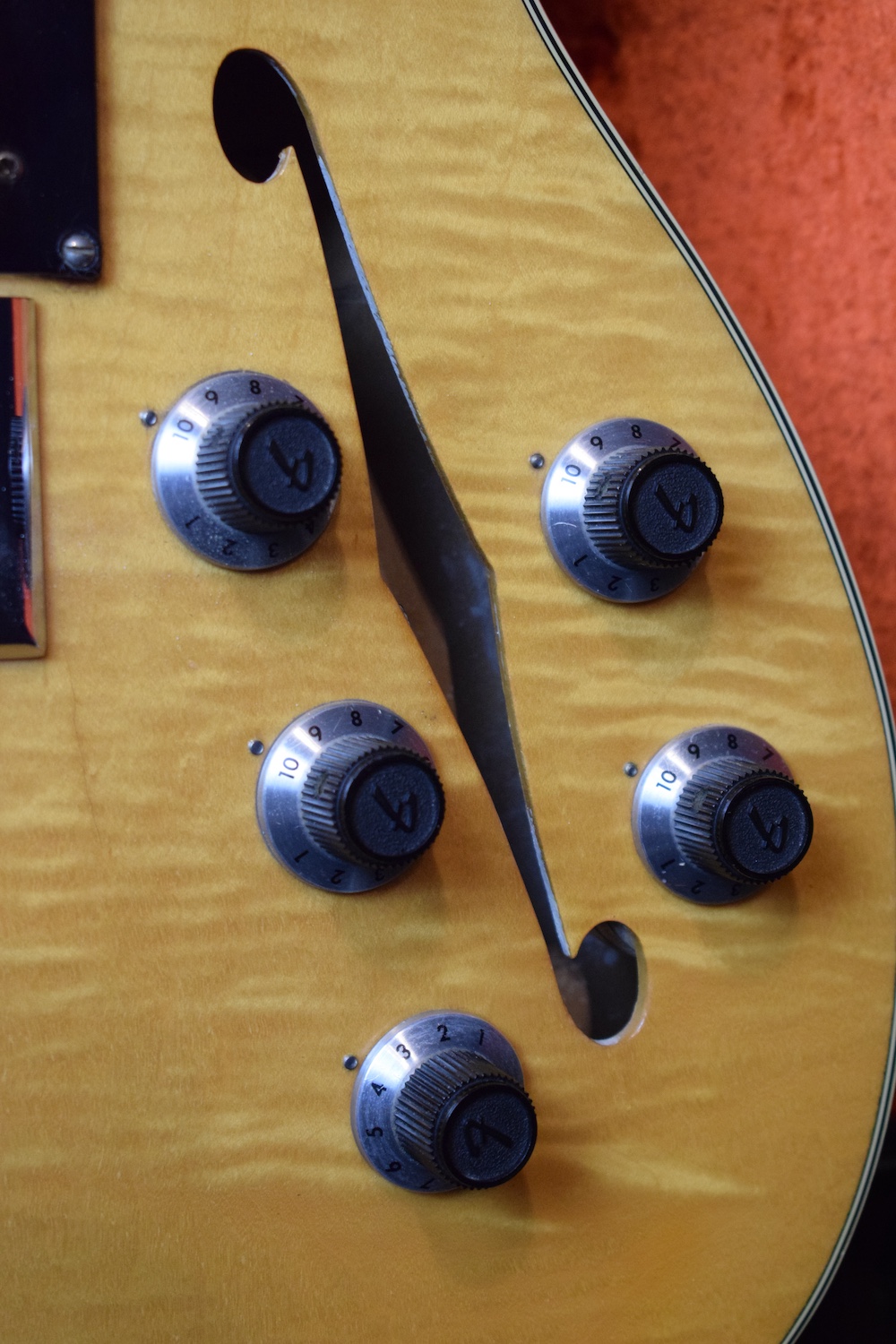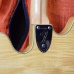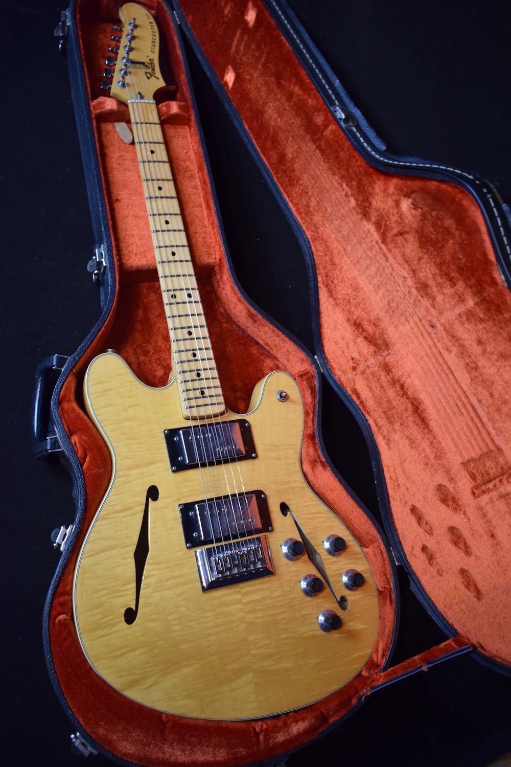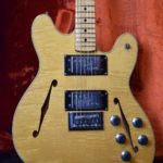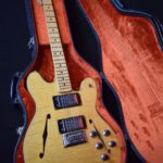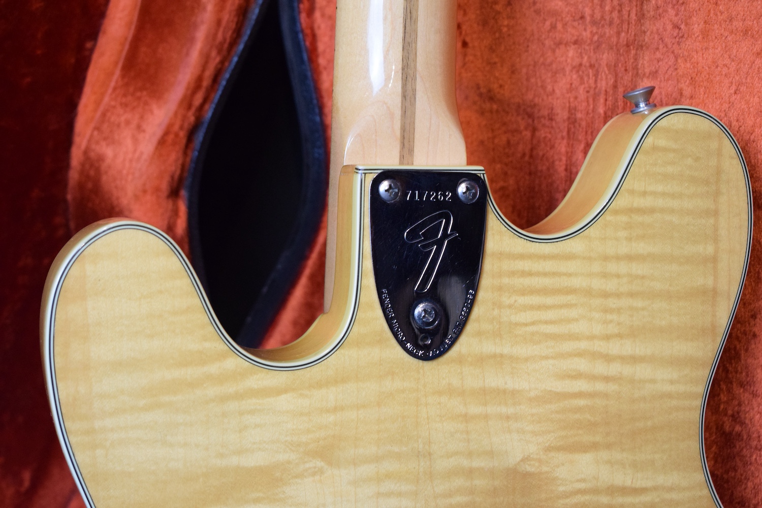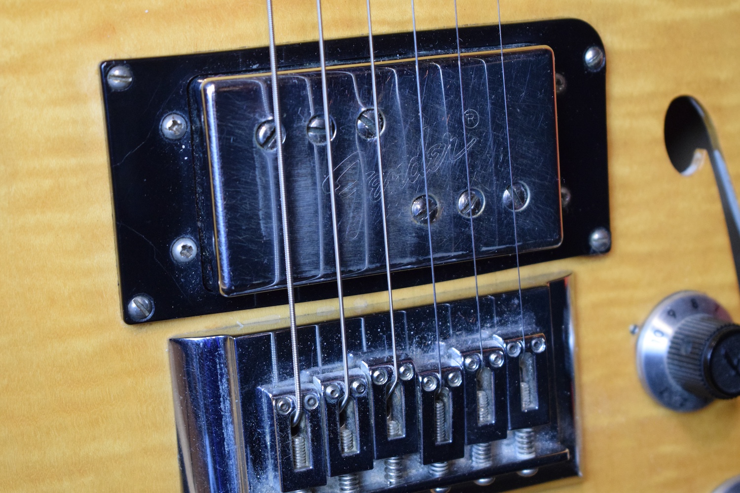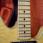 La Starcaster à mon sens illustre très bien la capacité de Fender à fabriquer d’excellents instruments au sein des années 70. Elle était conçue comme un instrument haut de gamme, une offset semi hollowbody, sorte de réponse à la toute aussi excellente Gibson Les Paul Signature qui était sa contemporaine. Fender n’était clairement pas connu pour ses semi-hollowbody et ils ont pourtant réussi leur pari à mon sens. La lutherie est impeccable, y compris la défonce du corps pour accueillir le manche qui peut être assez peu ajustée sur d’autres modèles, à cette époque, est ici parfaite. Les essences sont très bien choisies et absolument magnifiques, surtout comme ici dans sa version naturelle. Le pickguard manquant pourrait même être un choix esthétique cohérent tant l’érable est beau. Elle est équipée de 2 micros humbuckers wide range conçus par Seth Lover, tout simplement l’inventeur du micro double s’il vous plait. Un homme à qui la guitare électrique moderne doit beaucoup. Cet instrument joue à la perfection. On retrouve beaucoup la Starcaster depuis quelques décennies dans des groupes rocks majeurs tels que Radiohead, notamment sur OK computer, ou chez Artic Monkeys. Elle a également été occasionnellement utilisée en jazz fusion même si ce n’est pas pour cela qu’elle est connue du grand public, c’est une guitare capable de beaucoup de choses.