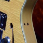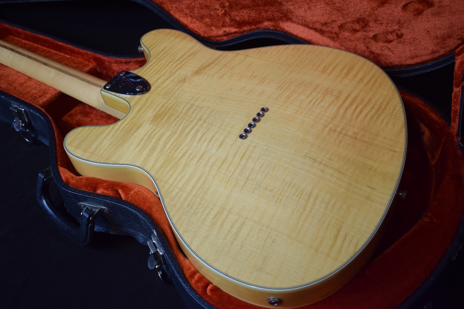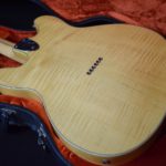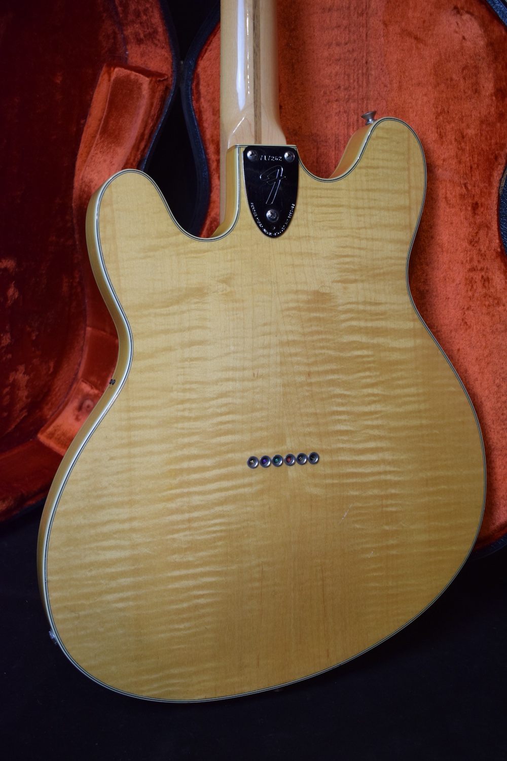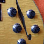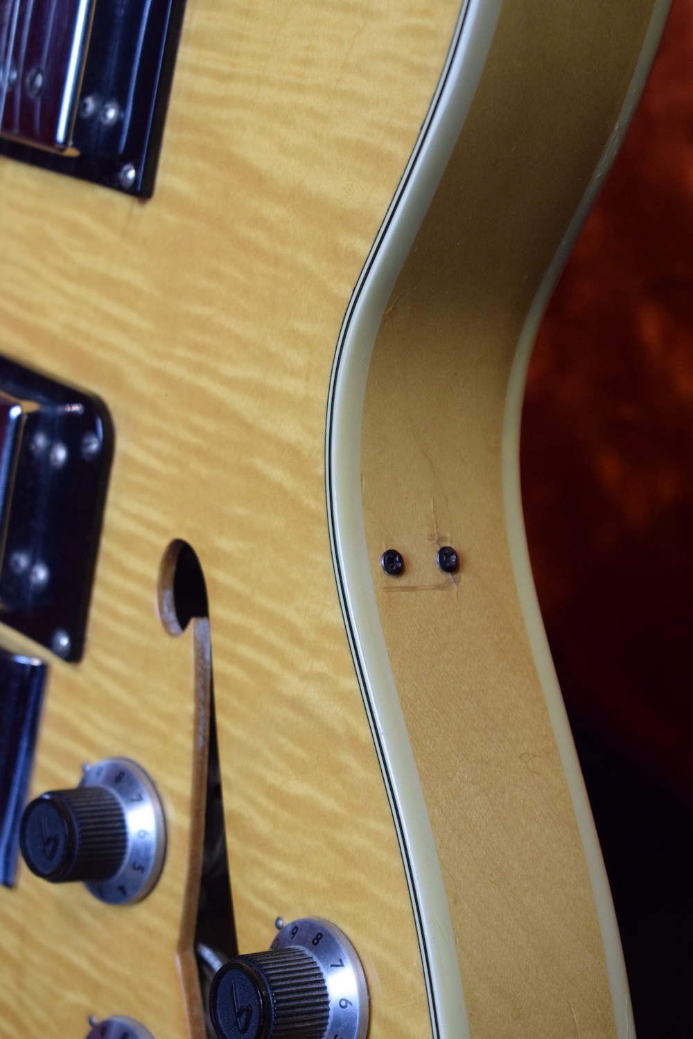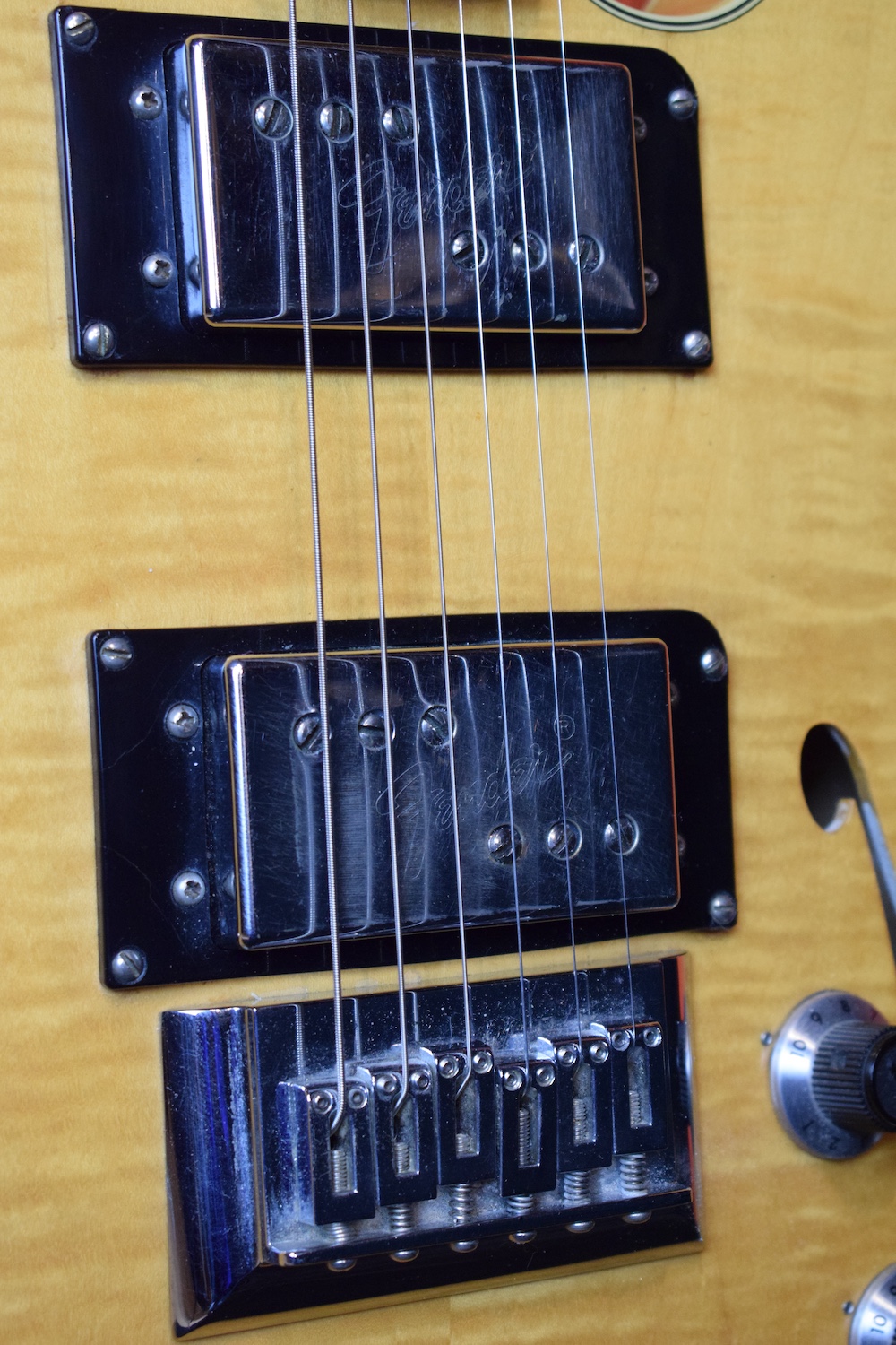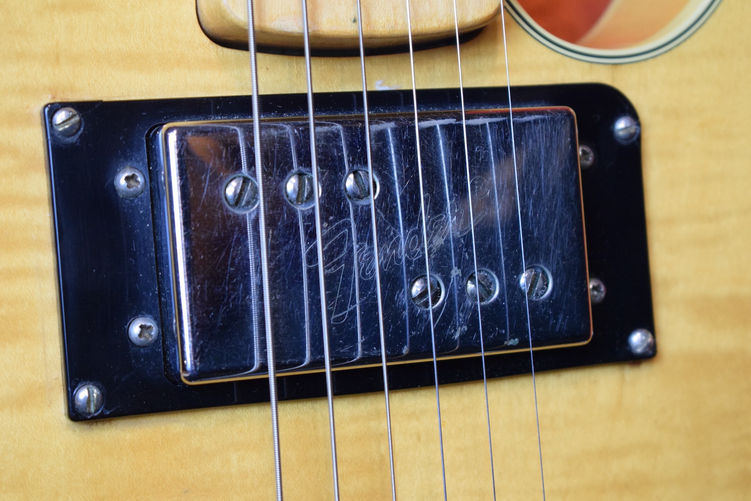 La Starcaster à mon sens illustre très bien la capacité de Fender à fabriquer d’excellents instruments au sein des années 70. Elle était conçue comme un instrument haut de gamme, une offset semi hollowbody, sorte de réponse à la toute aussi excellente Gibson Les Paul Signature qui était sa contemporaine. Fender n’était clairement pas connu pour ses semi-hollowbody et ils ont pourtant réussi leur pari à mon sens. La lutherie est impeccable, y compris la défonce du corps pour accueillir le manche qui peut être assez peu ajustée sur d’autres modèles, à cette époque, est ici parfaite. Les essences sont très bien choisies et absolument magnifiques, surtout comme ici dans sa version naturelle. Le pickguard manquant pourrait même être un choix esthétique cohérent tant l’érable est beau. Elle est équipée de 2 micros humbuckers wide range conçus par Seth Lover, tout simplement l’inventeur du micro double s’il vous plait. Un homme à qui la guitare électrique moderne doit beaucoup. Cet instrument joue à la perfection. On retrouve beaucoup la Starcaster depuis quelques décennies dans des groupes rocks majeurs tels que Radiohead, notamment sur OK computer, ou chez Artic Monkeys. Elle a également été occasionnellement utilisée en jazz fusion même si ce n’est pas pour cela qu’elle est connue du grand public, c’est une guitare capable de beaucoup de choses.