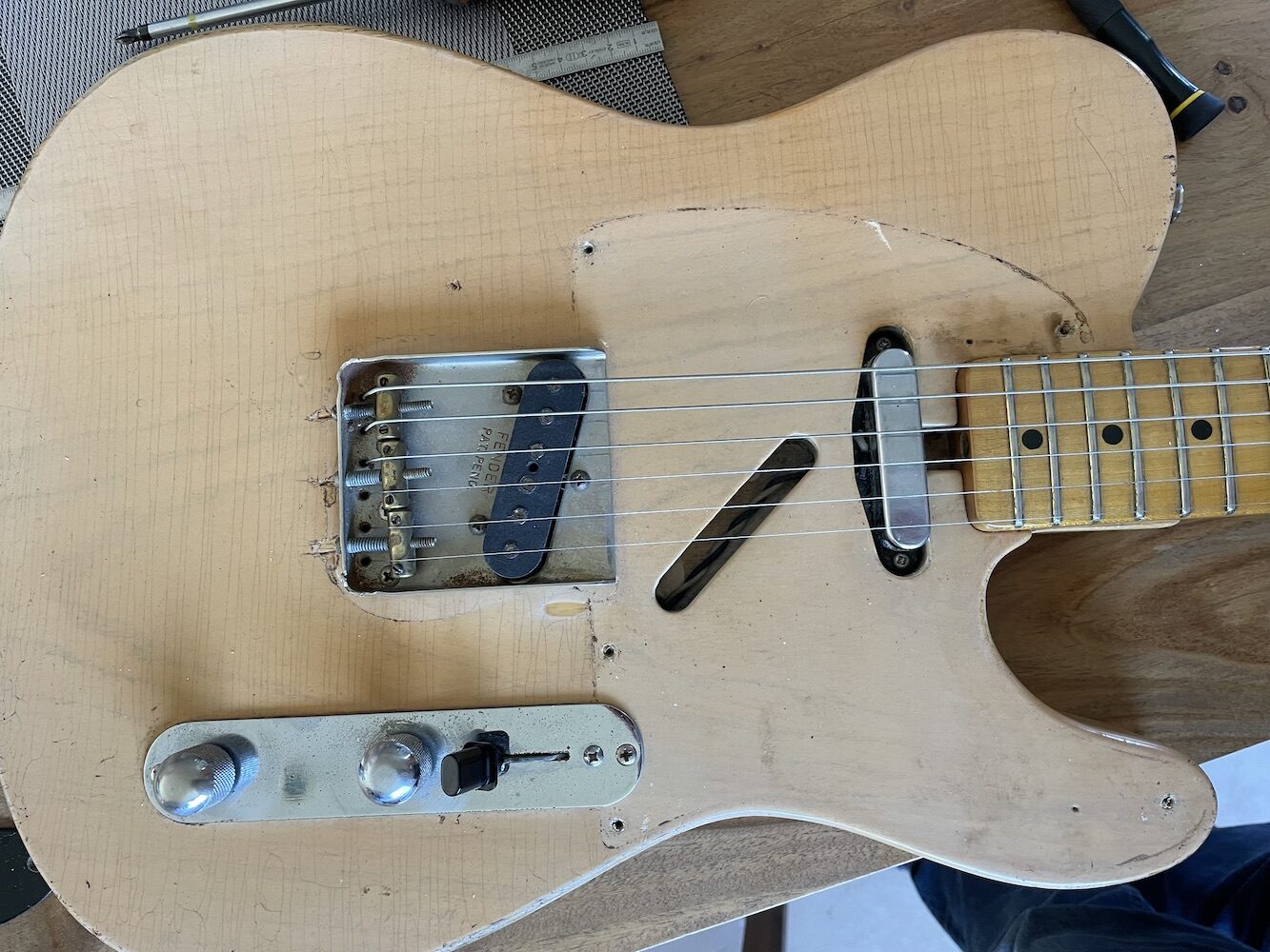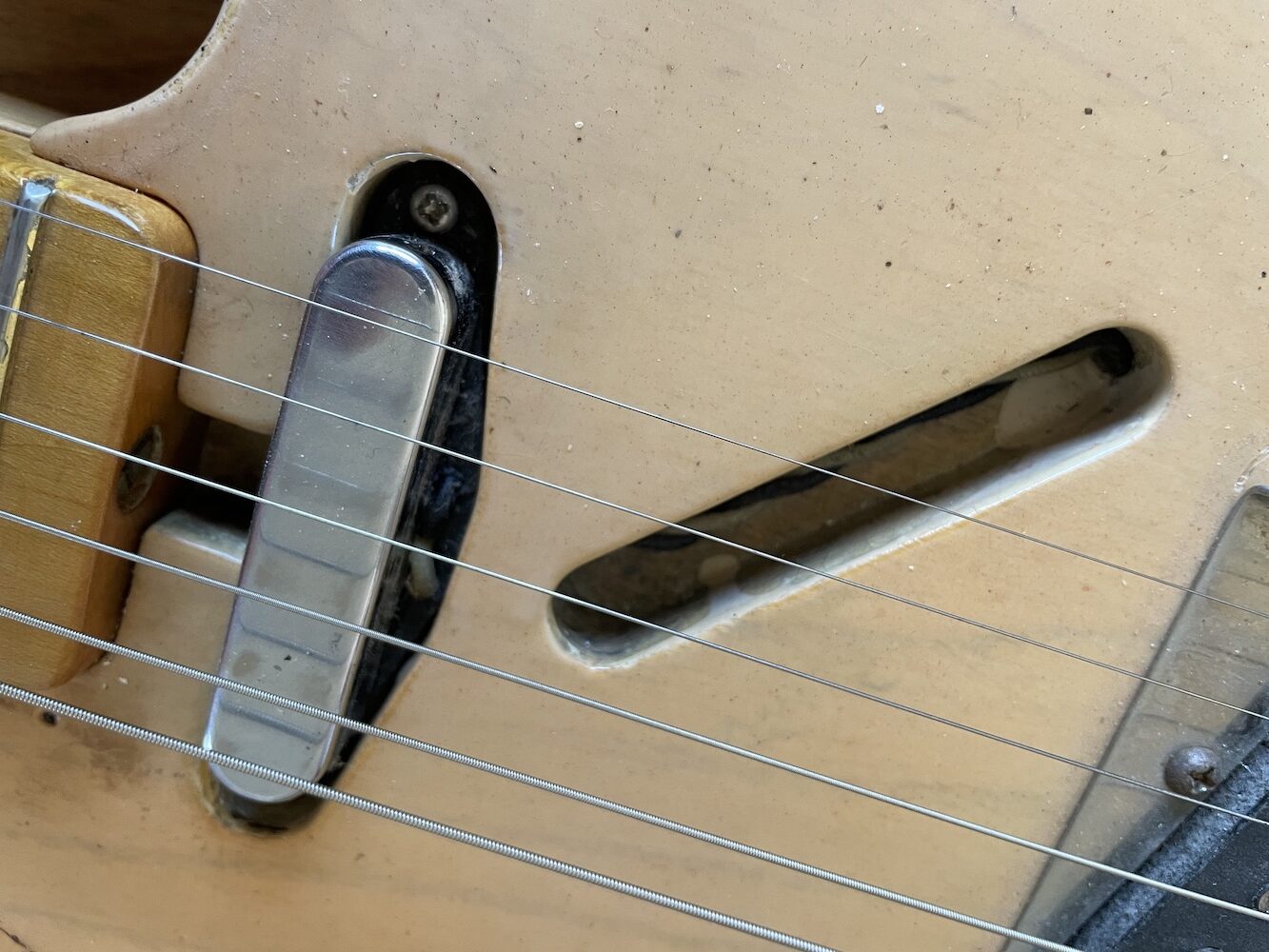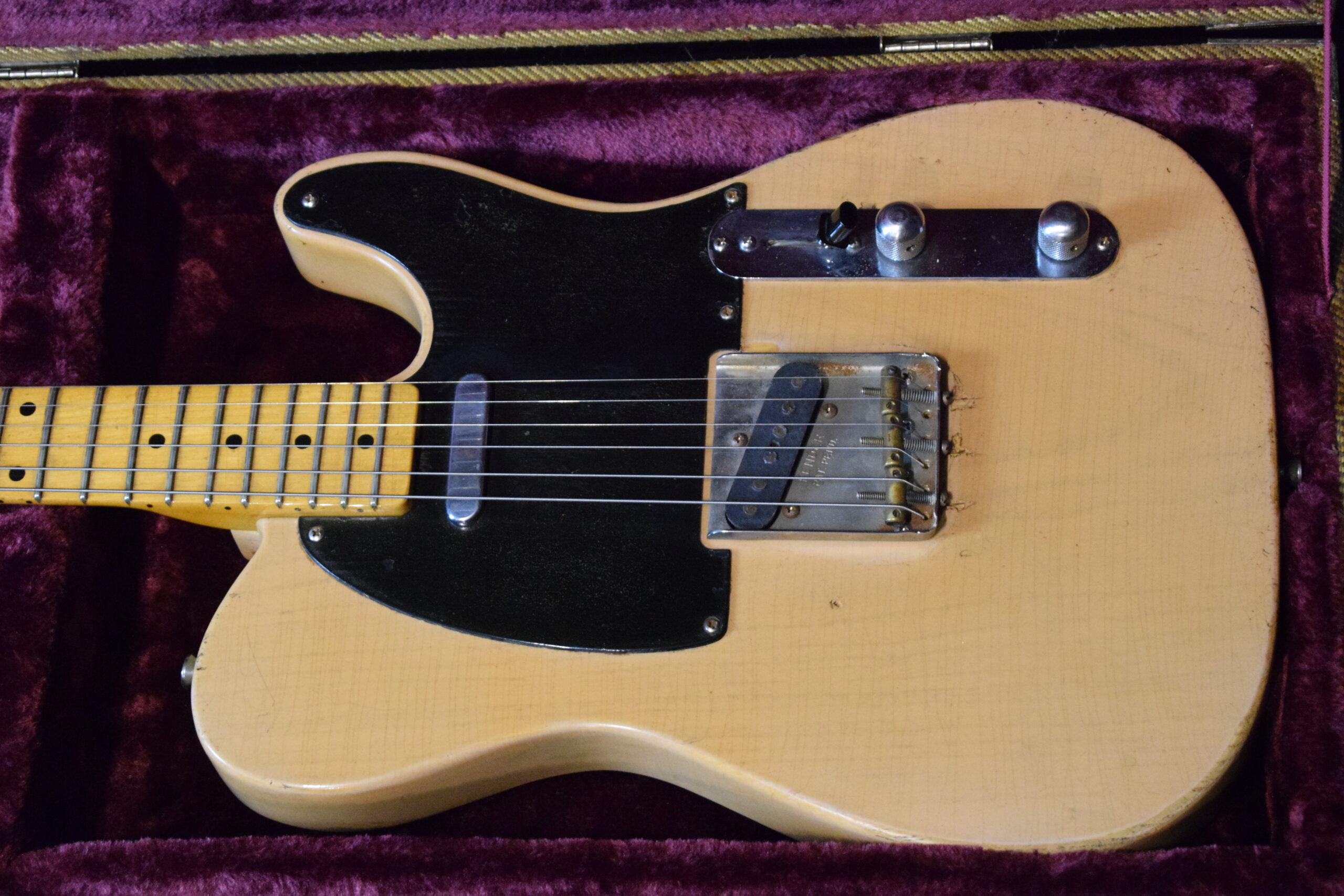 Soyons direct cette Tele est fantastique. Elle a été blackguardisée, par Nacho Banos, l’homme derrière les Nachocaster et bien entendu le livre de référence sur les blackguards. J’ai échangé quelques emails avec lui récemment, en plus d’être un homme charmant Nacho est la référence mondiale en ce qui concerne les Telecaster. Il a pu me confirmer qu’il avait bien vendu cette Telecaster à l’époque de son magasin Texmex à Valencia et que c’est effectivement une 1959 revernie. Les micros sont originaux et l’instrument a été reverni dans son ensemble. Nouveau logo donc. La plaque a été changée pour une noire bien sûr, avec un petite dédicace au passage, les mécaniques sont un assemblage de plusieurs set vintages, le chevalet est original ainsi que la plaque de contrôle et ses boutons à dôme. Le condensateur de tonalité est toujours là. C’est un instrument player à ne pas rater ce genre d’instrument est extrêmement difficile à trouver.