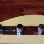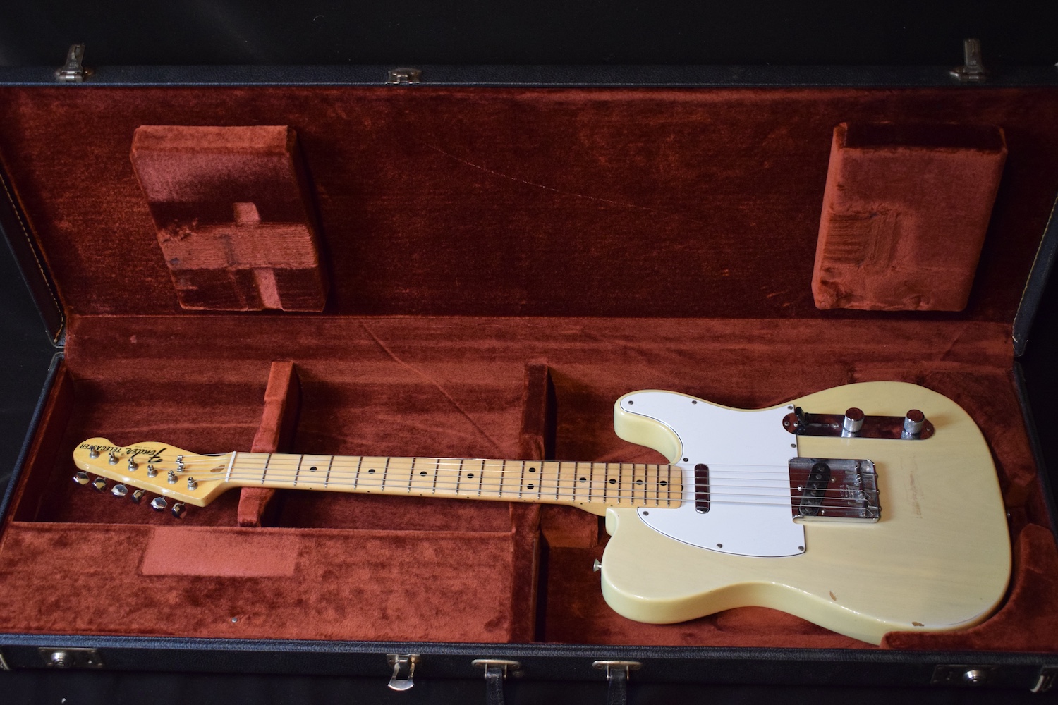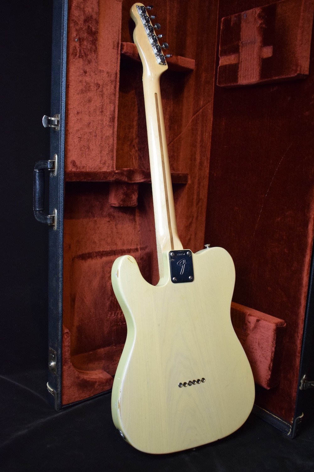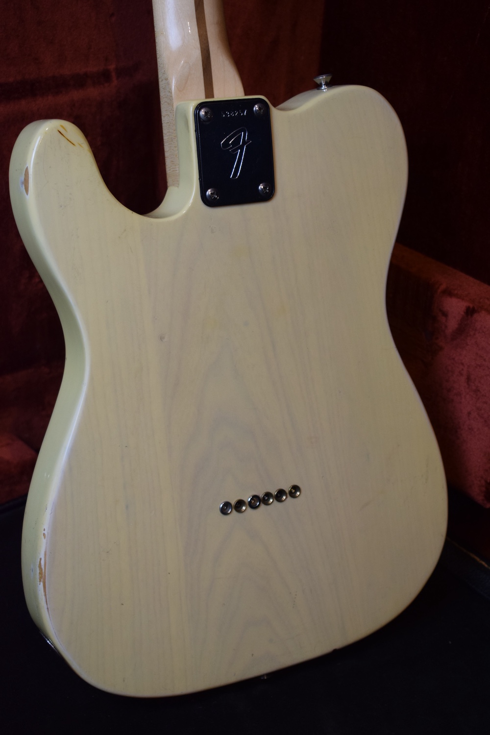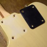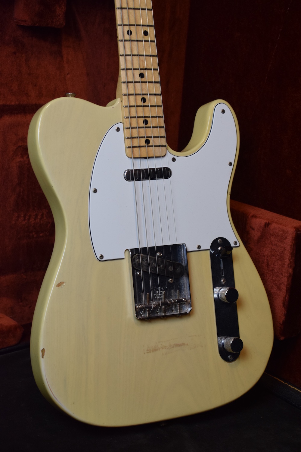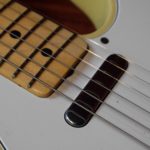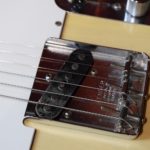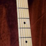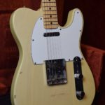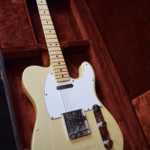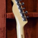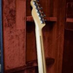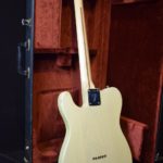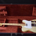A la manière des Telecasters de la deuxième moitié des années 50, celle-ci est en frêne avec une peinture blonde translucide et complétée par un pickguard blanc. Si le frêne est souvent un peu plus dense que l’aulne, celle-ci n’est pas lourde puisqu’elle fait pile 4kg. C’est un instrument très bien conservé avec toutes ses pièces d’origine. La peinture originale est bien préservée. Elle sonne très bien, elle est facile à jouer, les frettes sont d’un bon niveau, l’action est basse et l’instrument réglé. C’est un bon numéro. Elle est fournie avec son étui rigide original.