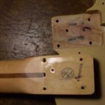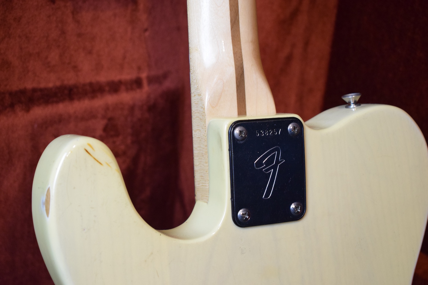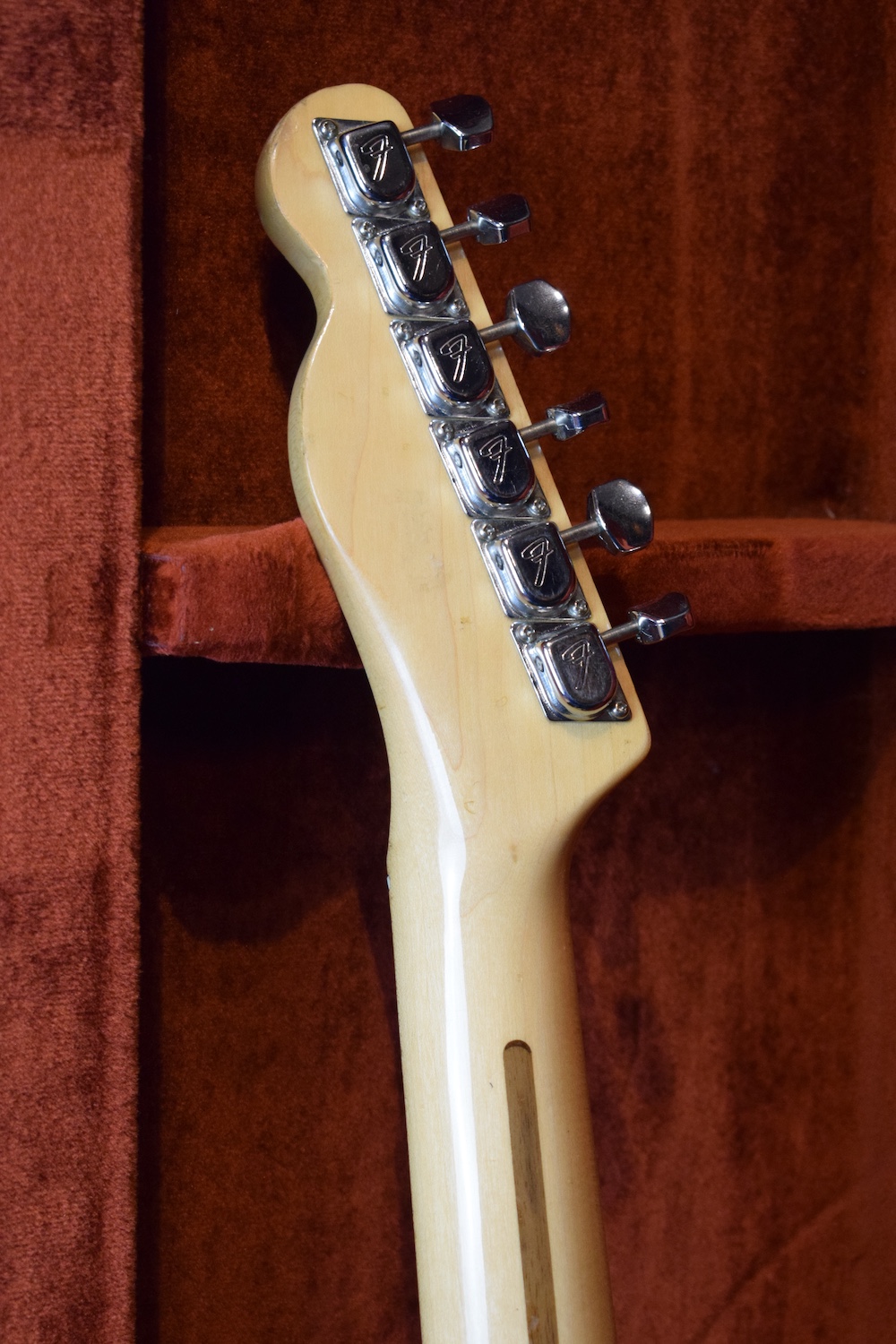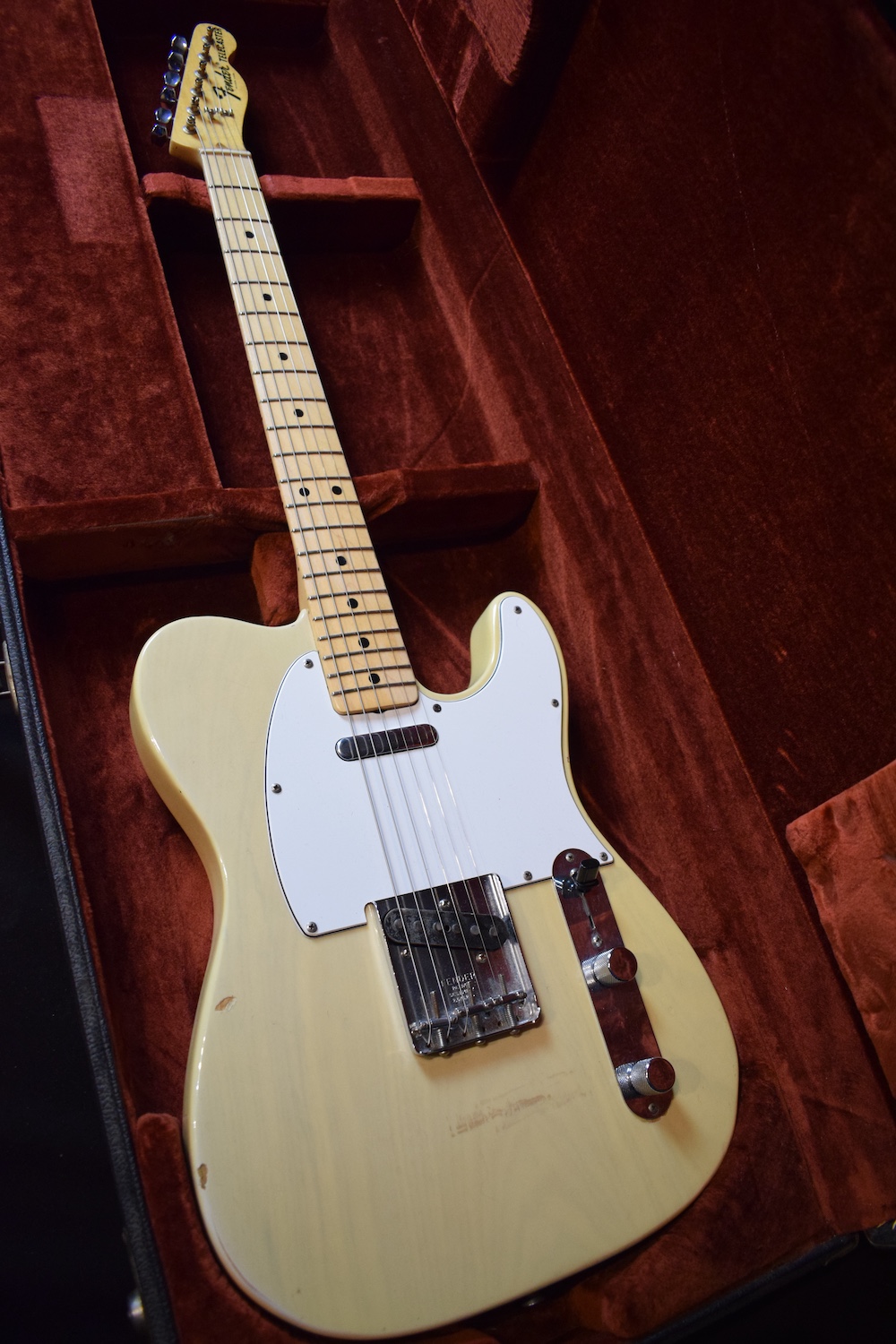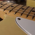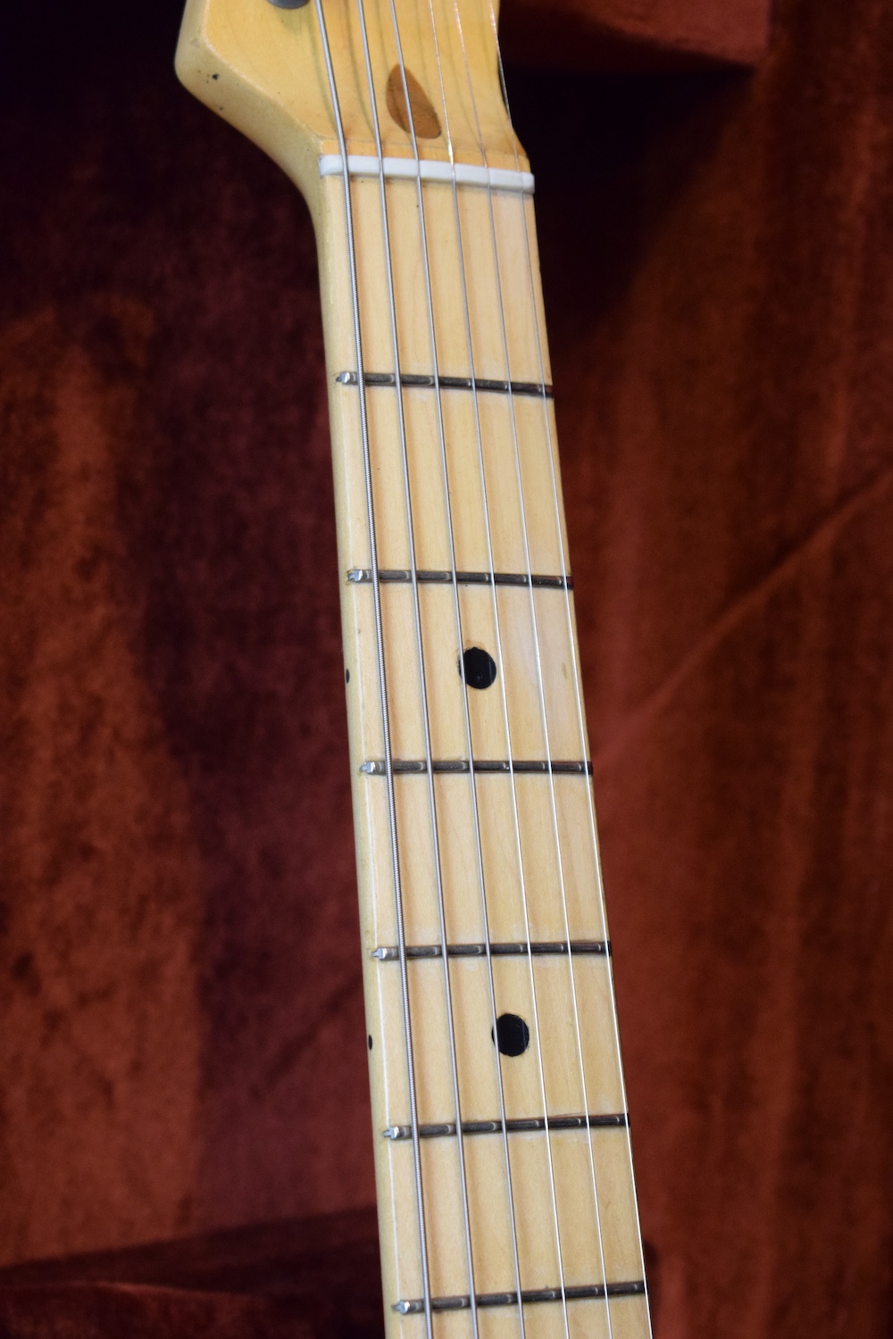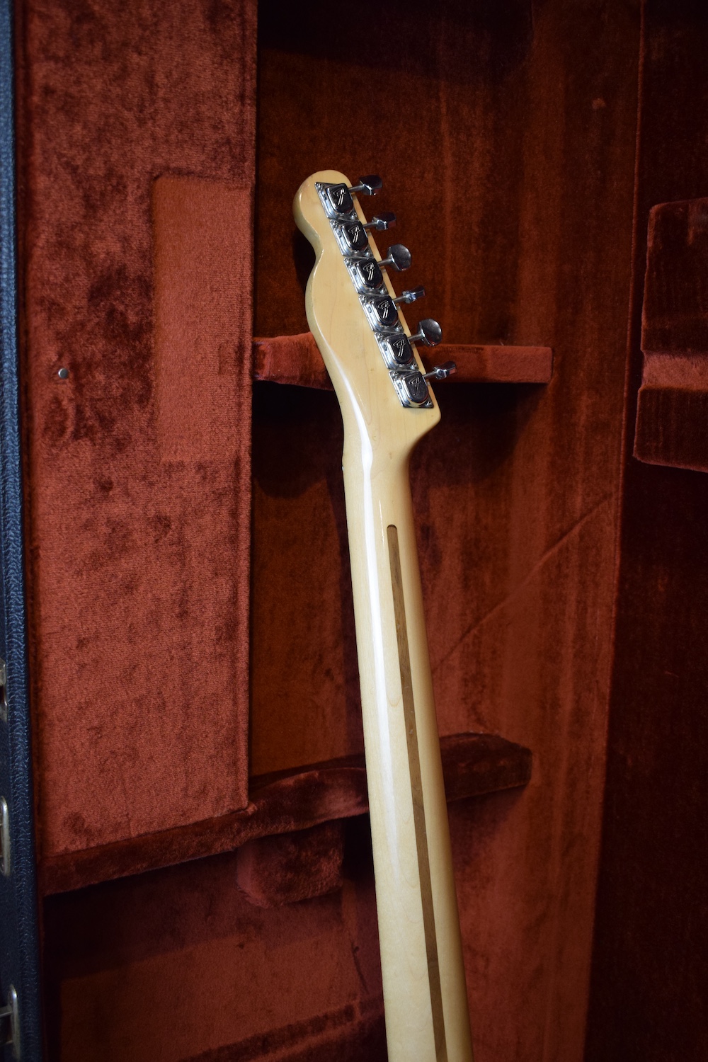 A la manière des Telecasters de la deuxième moitié des années 50, celle-ci est en frêne avec une peinture blonde translucide et complétée par un pickguard blanc. Si le frêne est souvent un peu plus dense que l’aulne, celle-ci n’est pas lourde puisqu’elle fait pile 4kg. C’est un instrument très bien conservé avec toutes ses pièces d’origine. La peinture originale est bien préservée. Elle sonne très bien, elle est facile à jouer, les frettes sont d’un bon niveau, l’action est basse et l’instrument réglé. C’est un bon numéro. Elle est fournie avec son étui rigide original.