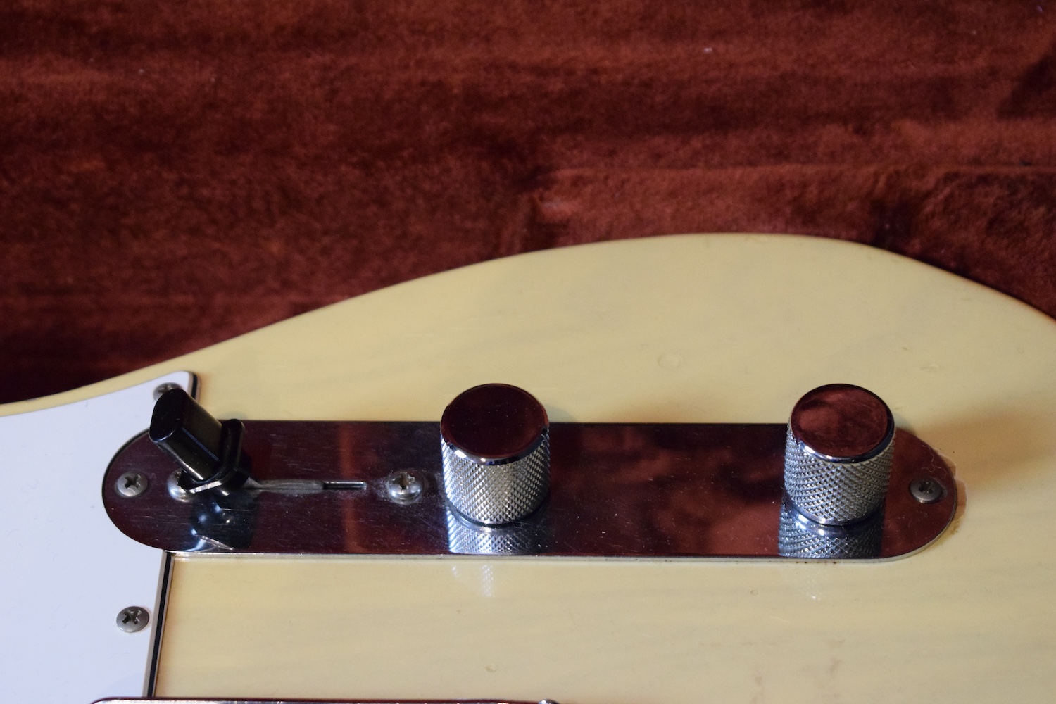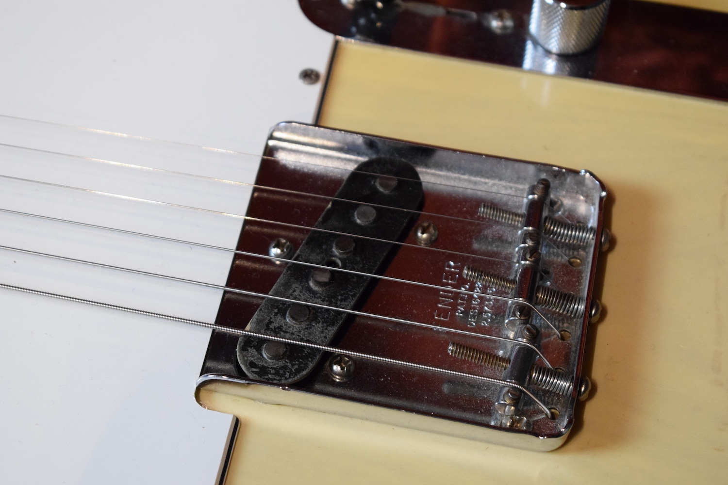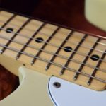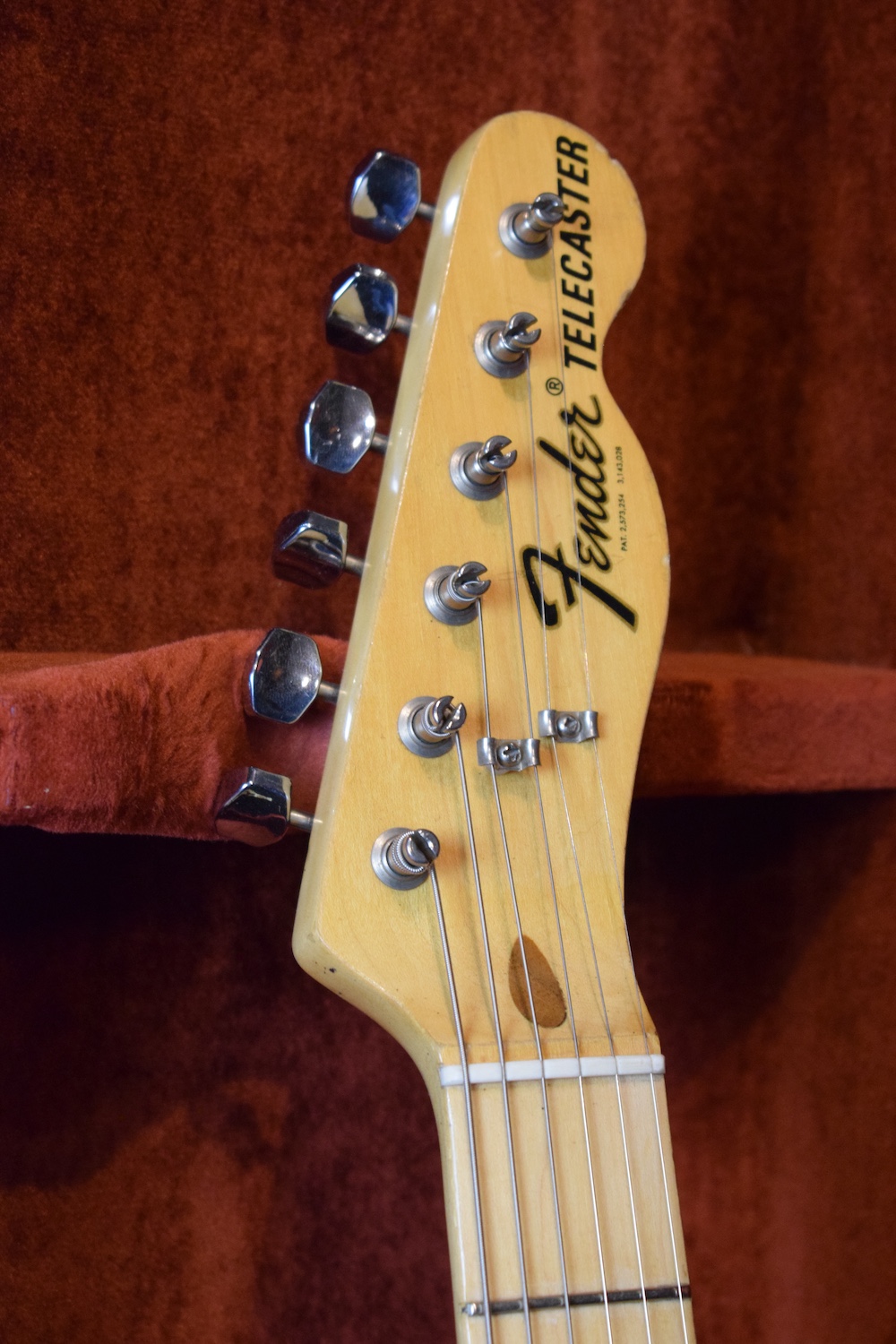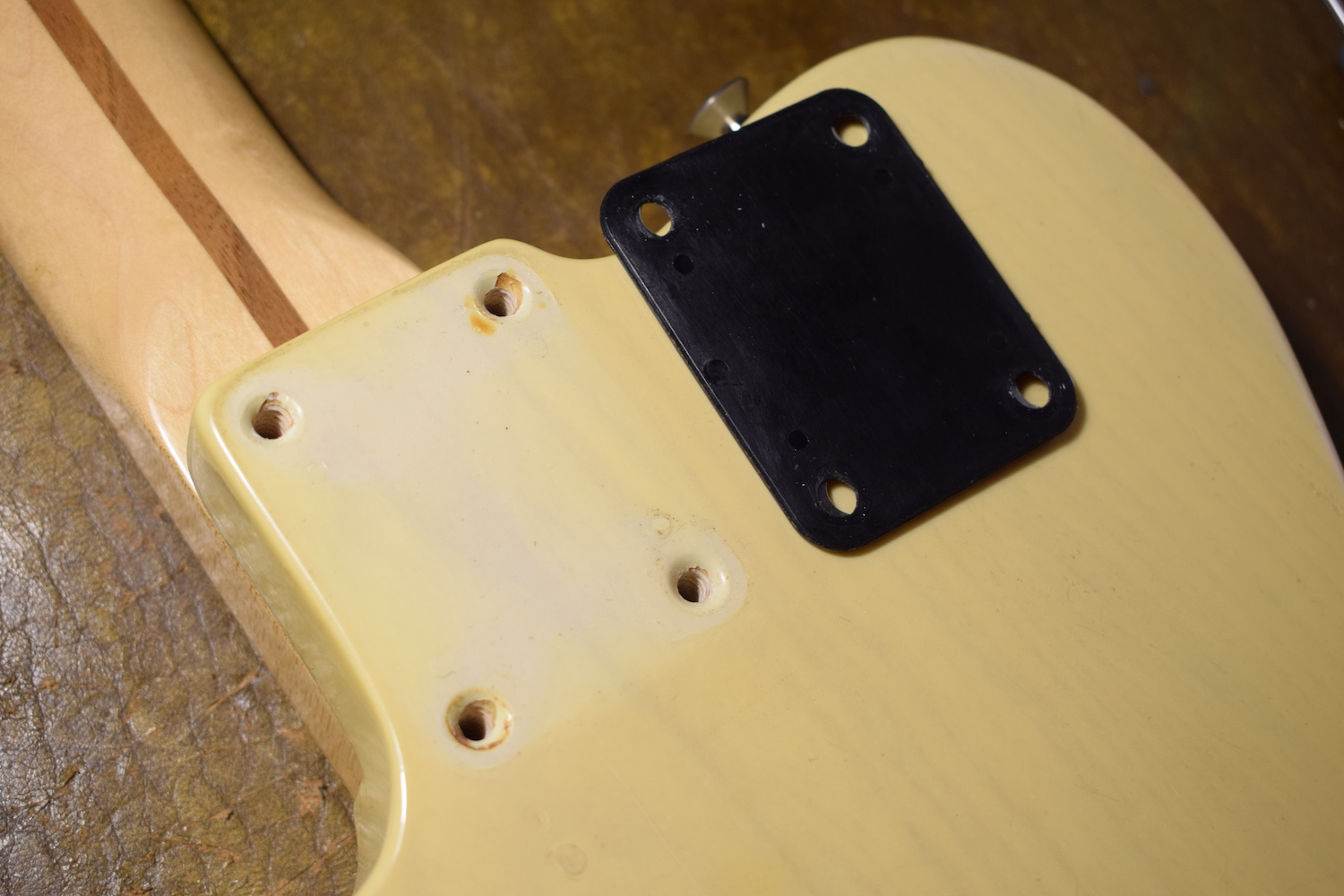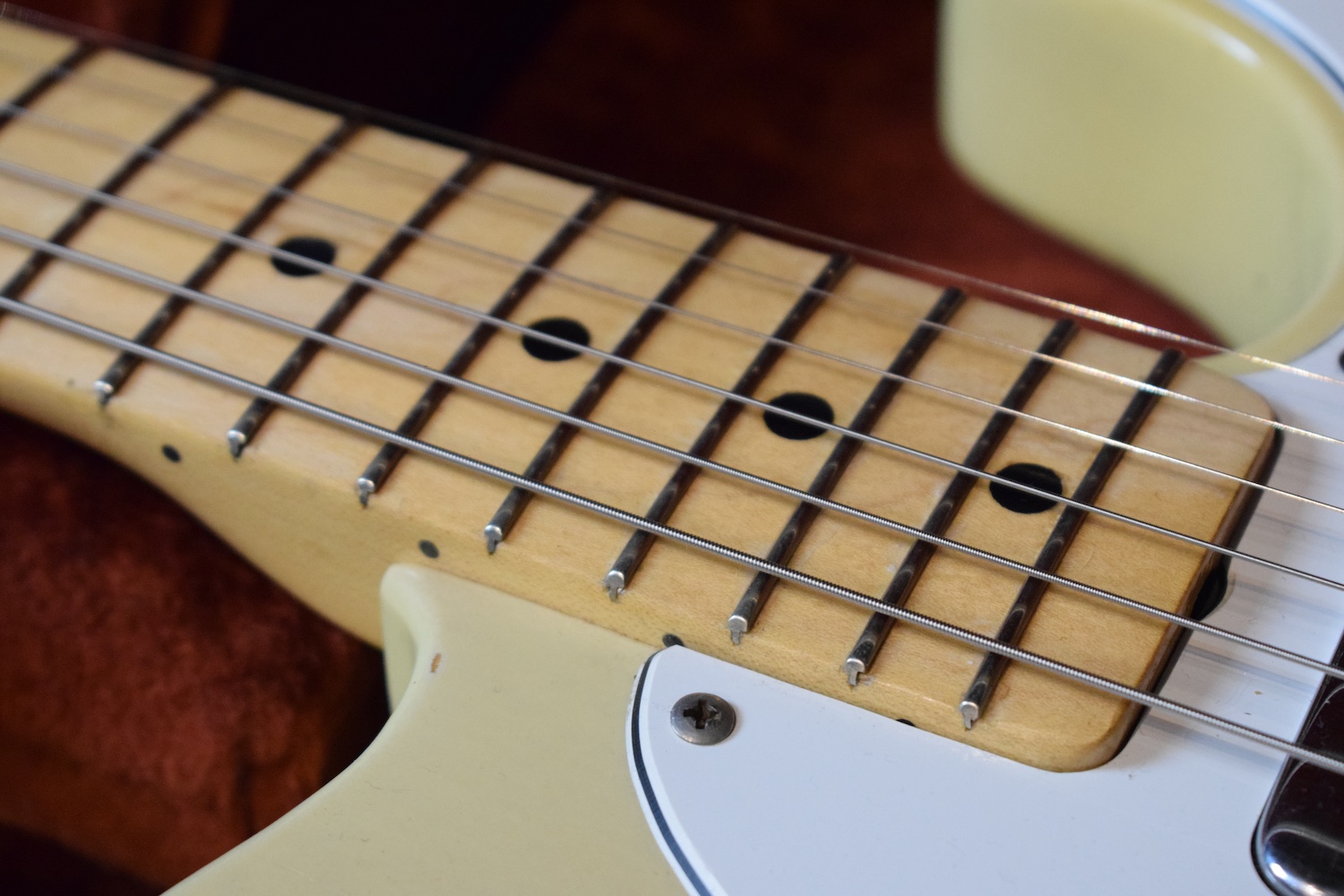 A la manière des Telecasters de la deuxième moitié des années 50, celle-ci est en frêne avec une peinture blonde translucide et complétée par un pickguard blanc. Si le frêne est souvent un peu plus dense que l’aulne, celle-ci n’est pas lourde puisqu’elle fait pile 4kg. C’est un instrument très bien conservé avec toutes ses pièces d’origine. La peinture originale est bien préservée. Elle sonne très bien, elle est facile à jouer, les frettes sont d’un bon niveau, l’action est basse et l’instrument réglé. C’est un bon numéro. Elle est fournie avec son étui rigide original.