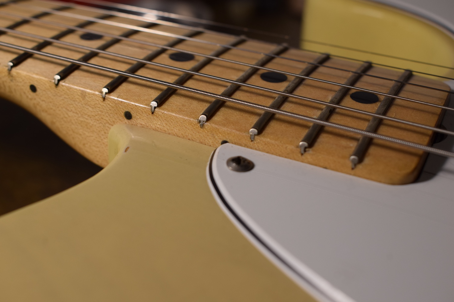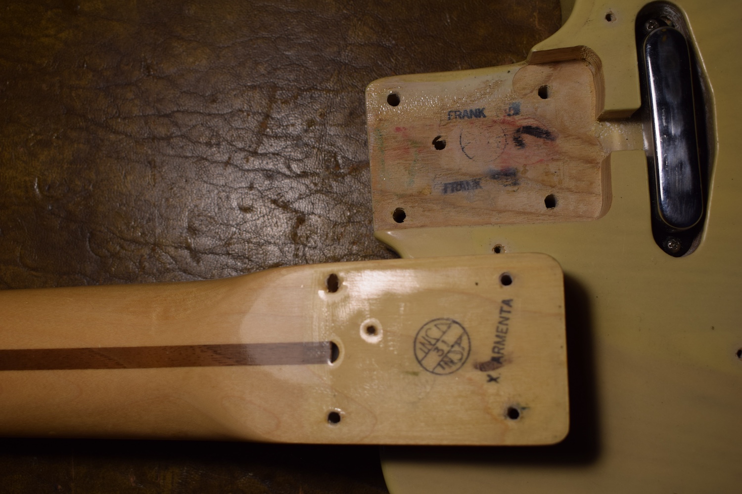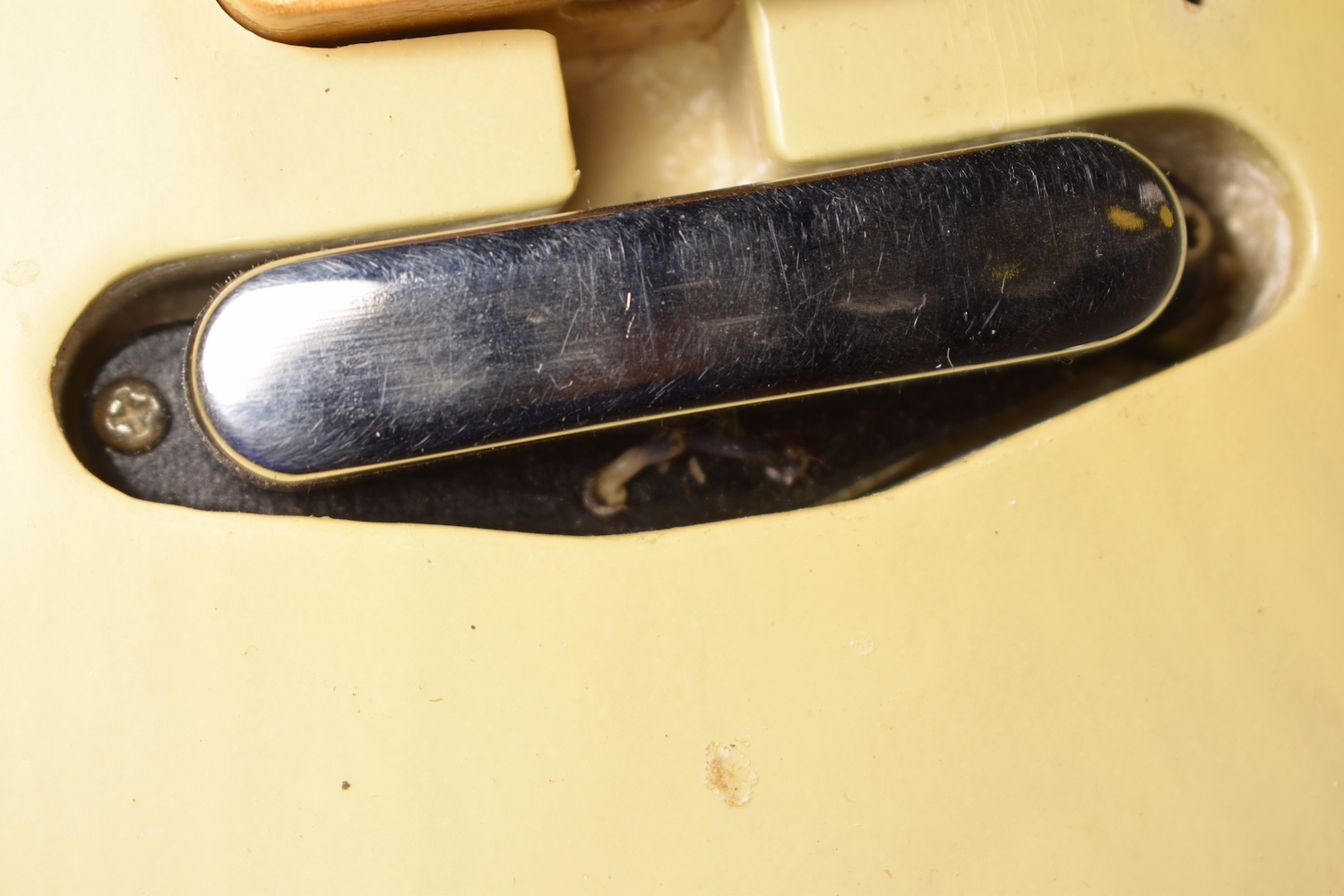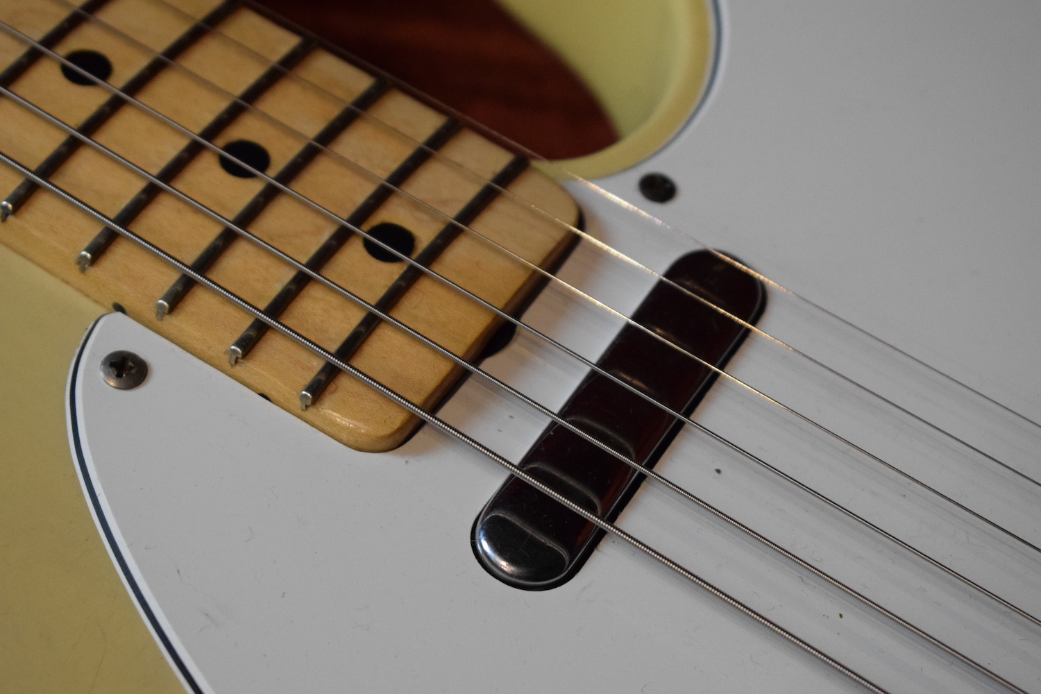 A la manière des Telecasters de la deuxième moitié des années 50, celle-ci est en frêne avec une peinture blonde translucide et complétée par un pickguard blanc. Si le frêne est souvent un peu plus dense que l’aulne, celle-ci n’est pas lourde puisqu’elle fait pile 4kg. C’est un instrument très bien conservé avec toutes ses pièces d’origine. La peinture originale est bien préservée. Elle sonne très bien, elle est facile à jouer, les frettes sont d’un bon niveau, l’action est basse et l’instrument réglé. C’est un bon numéro. Elle est fournie avec son étui rigide original.