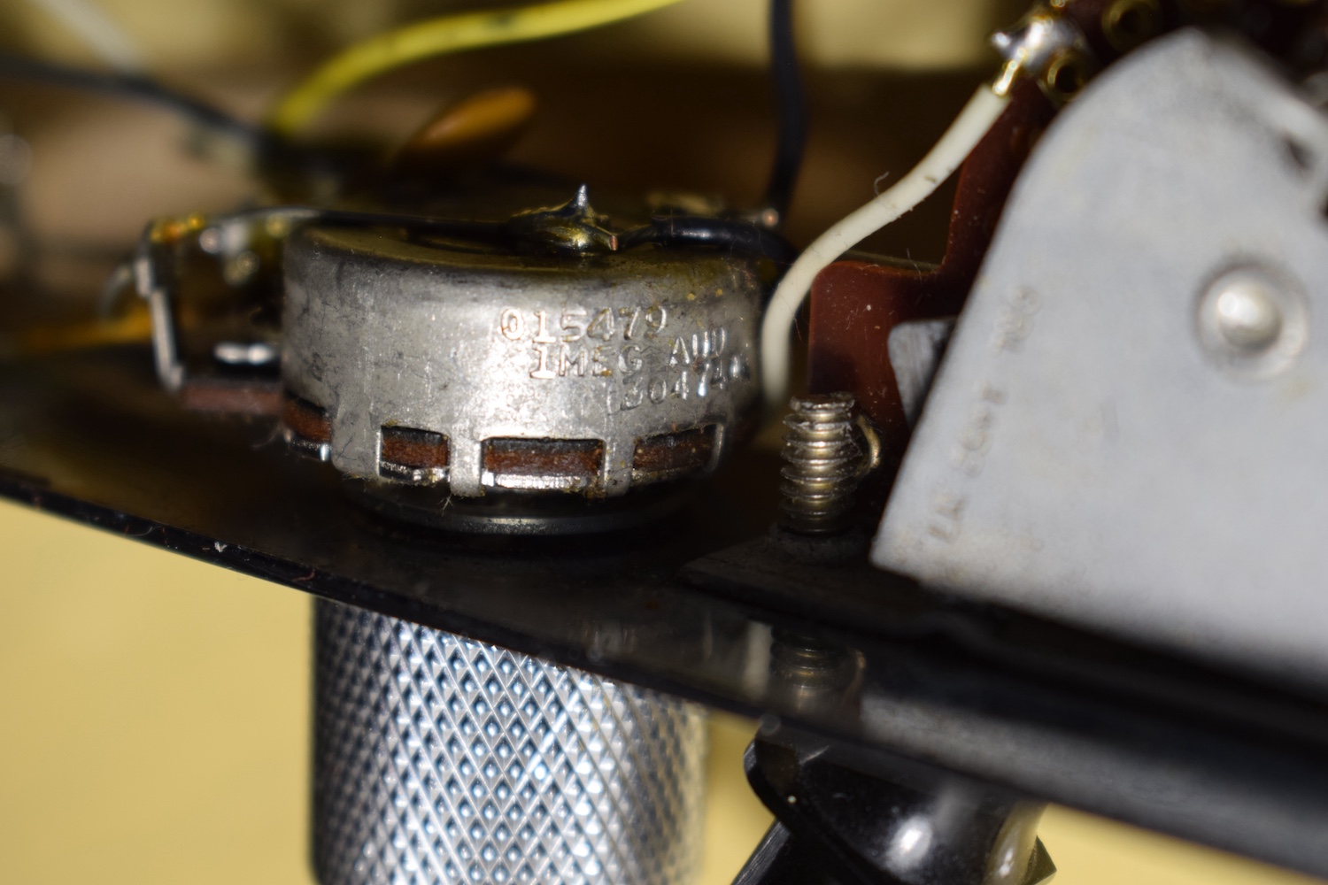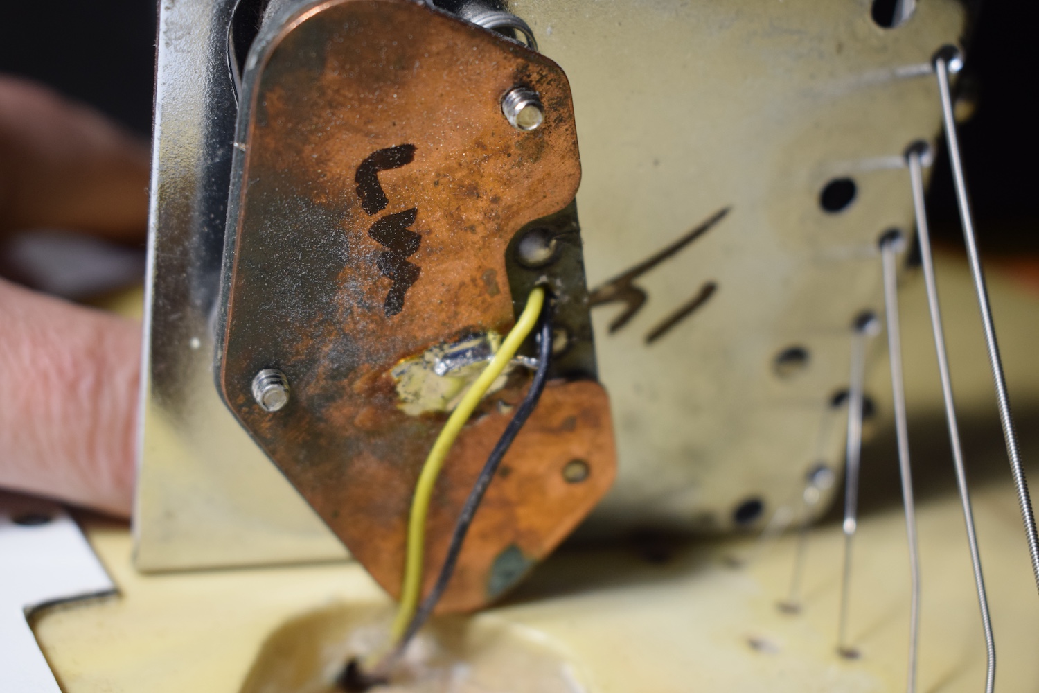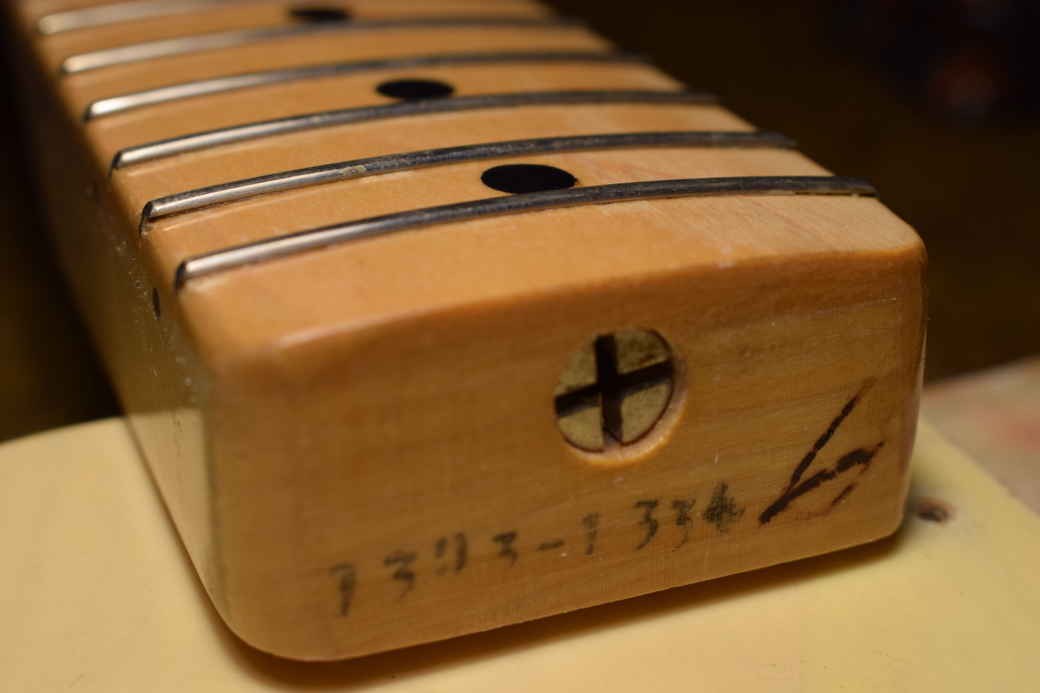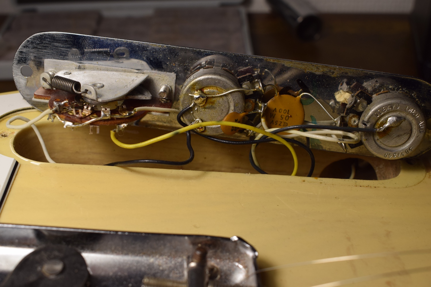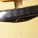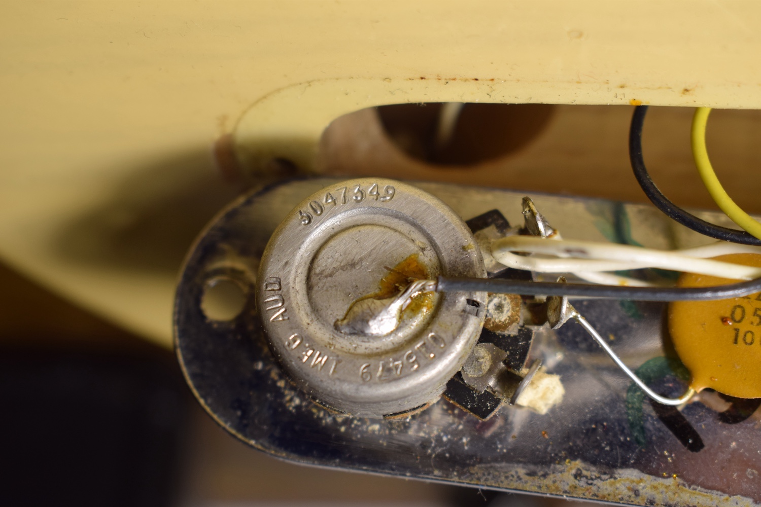 A la manière des Telecasters de la deuxième moitié des années 50, celle-ci est en frêne avec une peinture blonde translucide et complétée par un pickguard blanc. Si le frêne est souvent un peu plus dense que l’aulne, celle-ci n’est pas lourde puisqu’elle fait pile 4kg. C’est un instrument très bien conservé avec toutes ses pièces d’origine. La peinture originale est bien préservée. Elle sonne très bien, elle est facile à jouer, les frettes sont d’un bon niveau, l’action est basse et l’instrument réglé. C’est un bon numéro. Elle est fournie avec son étui rigide original.