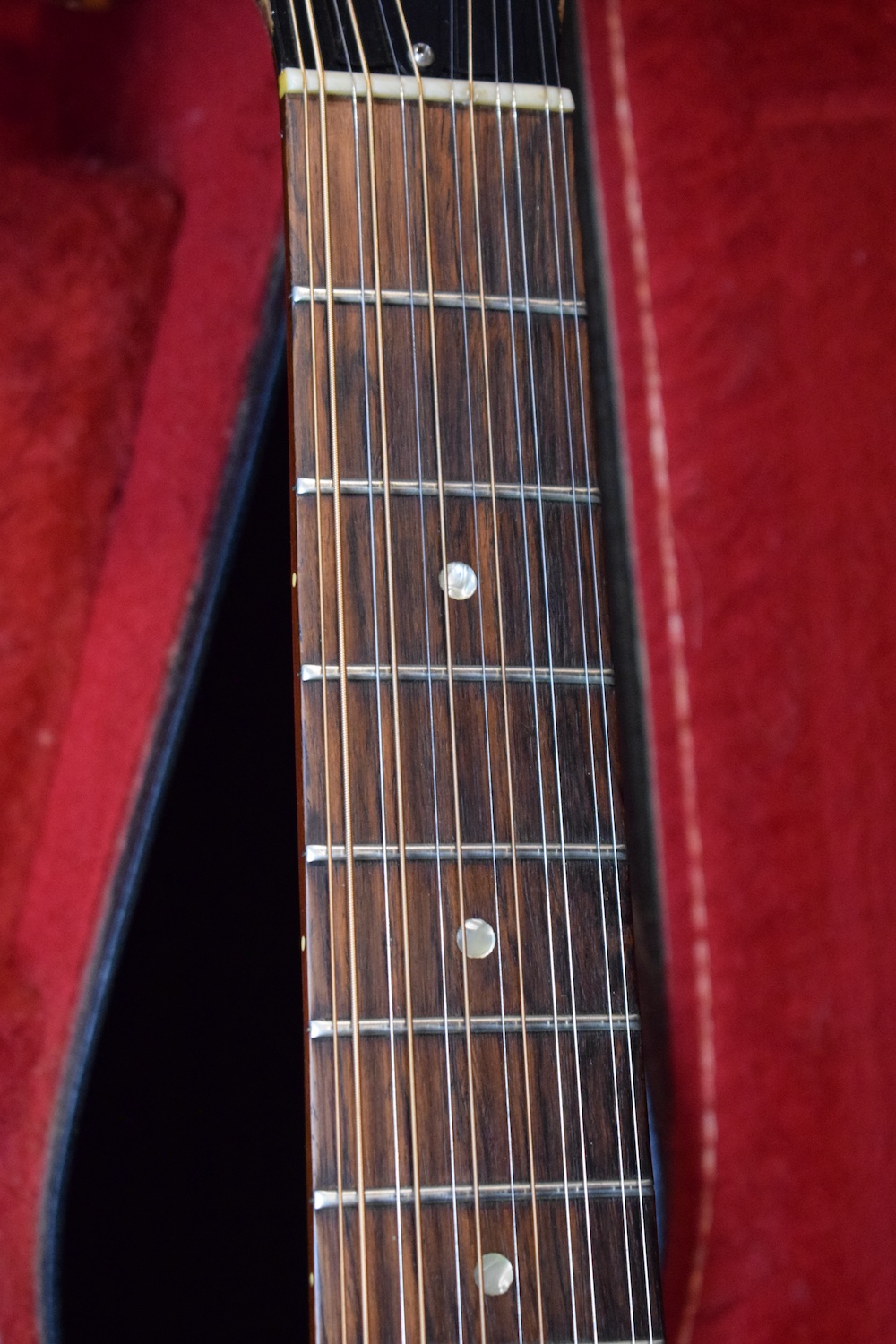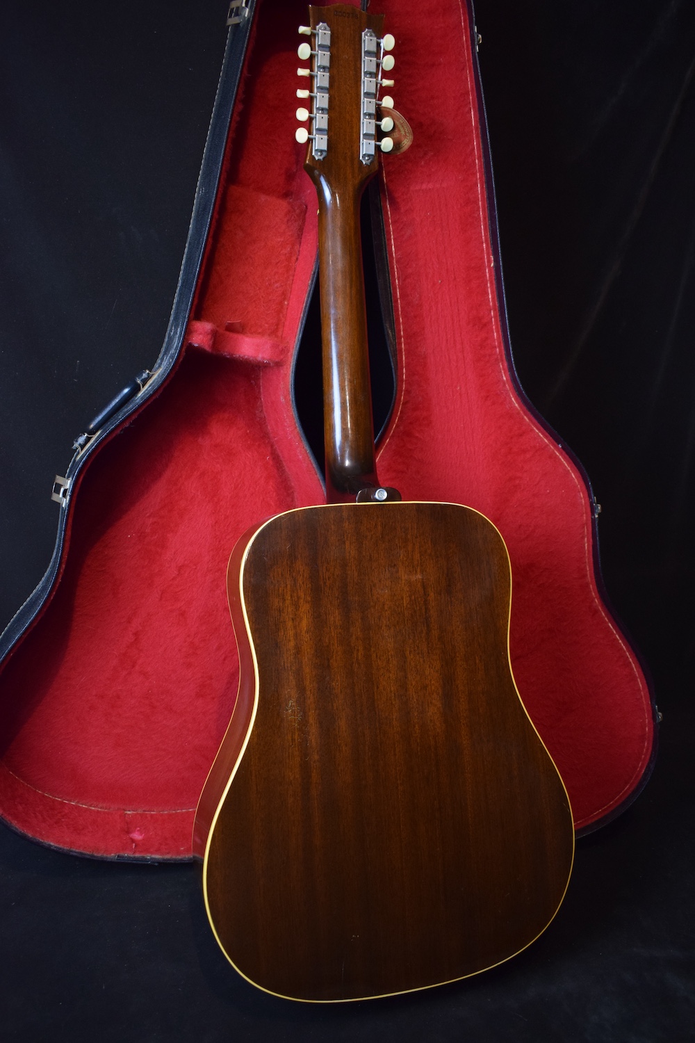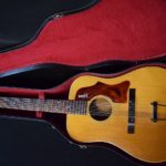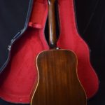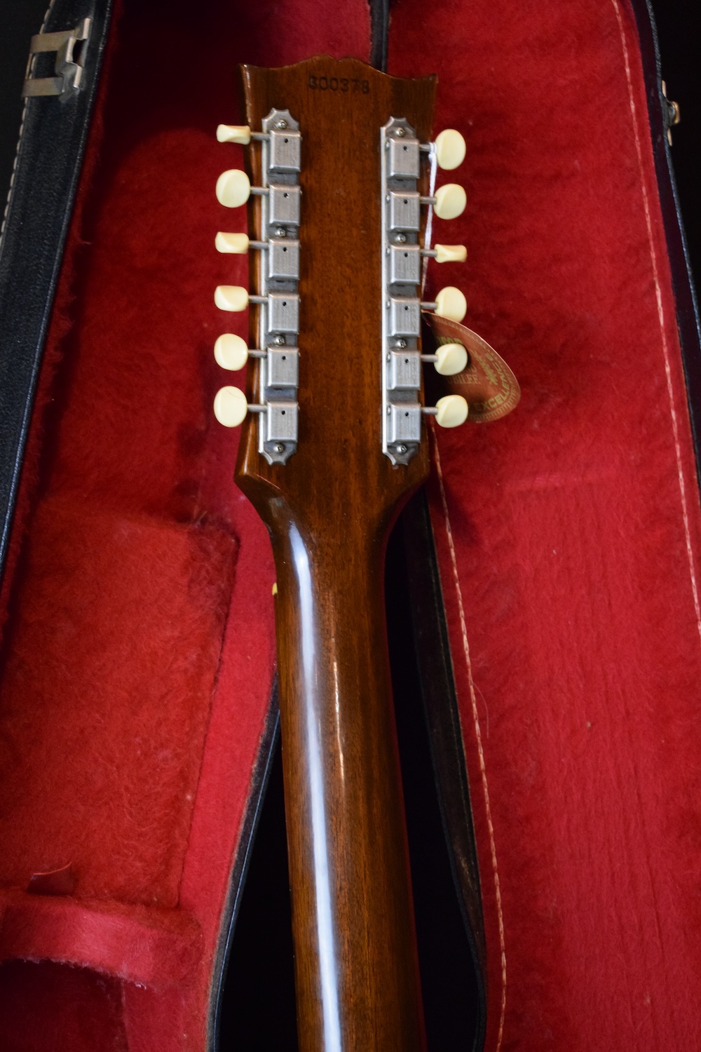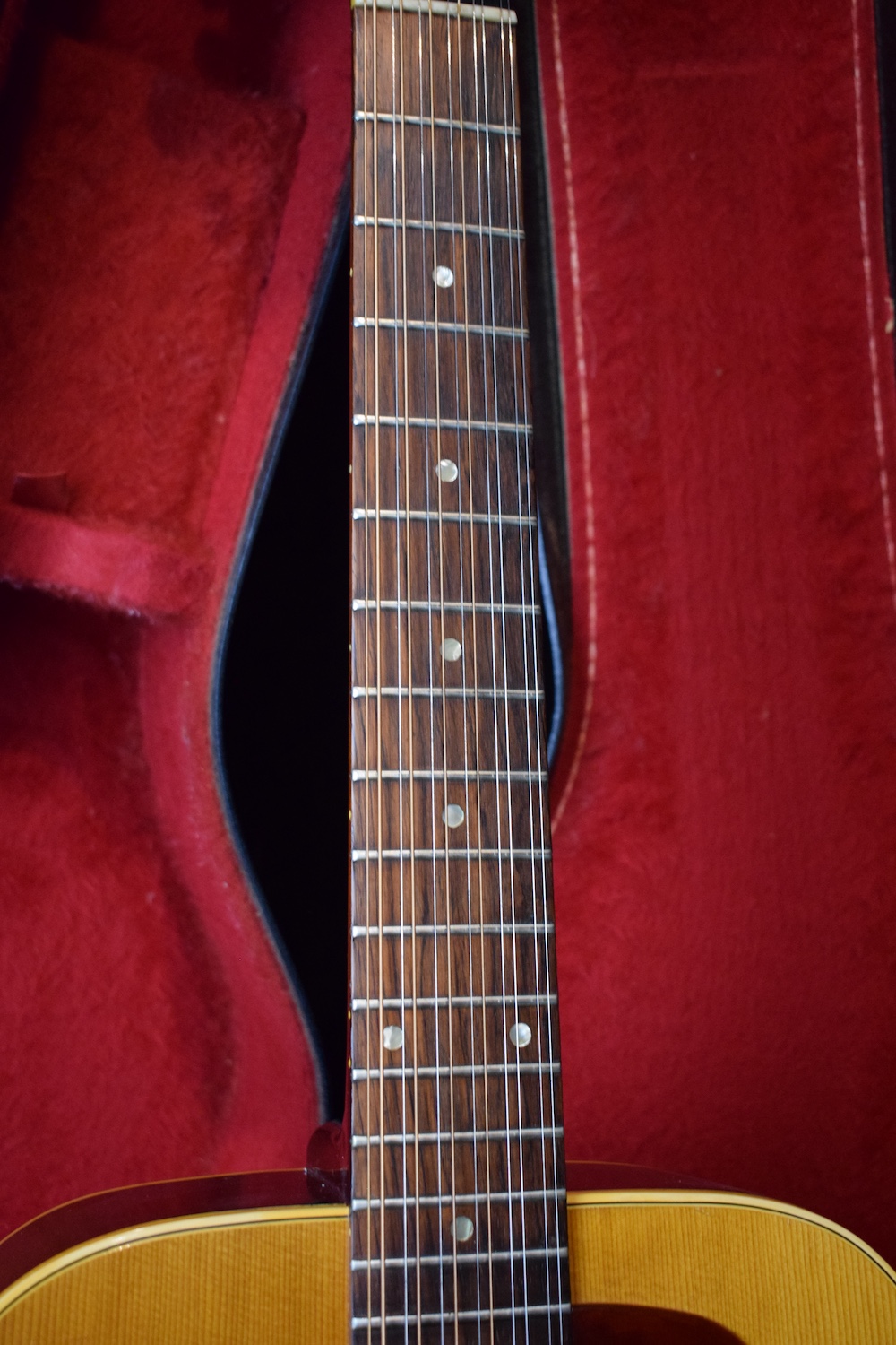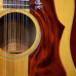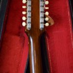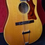 Voici un modèle que je ne vous ai pas présenté souvent. La B45-12 est une sorte de J45 12 cordes et celle-ci a très bien vieilli. La table est en excellent état et elle n’est pas voilée au niveau de la rosace. Le manche est bien droit et au bon angle. Ces vieilles douze cordes sont très difficiles à trouver dans un tel état. On les voit souvent fracturée de partout ou avec des actions injouables. C’est ce qui fait que j’ai sélectionné cet exemplaire pour vous car en trouver dans cet état est quasi impossible. Elle est donc parfaitement jouable sur l’ensemble du manche, avec un action basse et confortable. Elle sonne très bien, c’est ample et chaleureux. Notez l’état du logo sur le pickguard, typique de cette époque et en parfait état. Un signe qui montre à coup sûr que grand soin a été porté à cet instrument. Elle est fournie avec son étui d’époque.