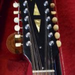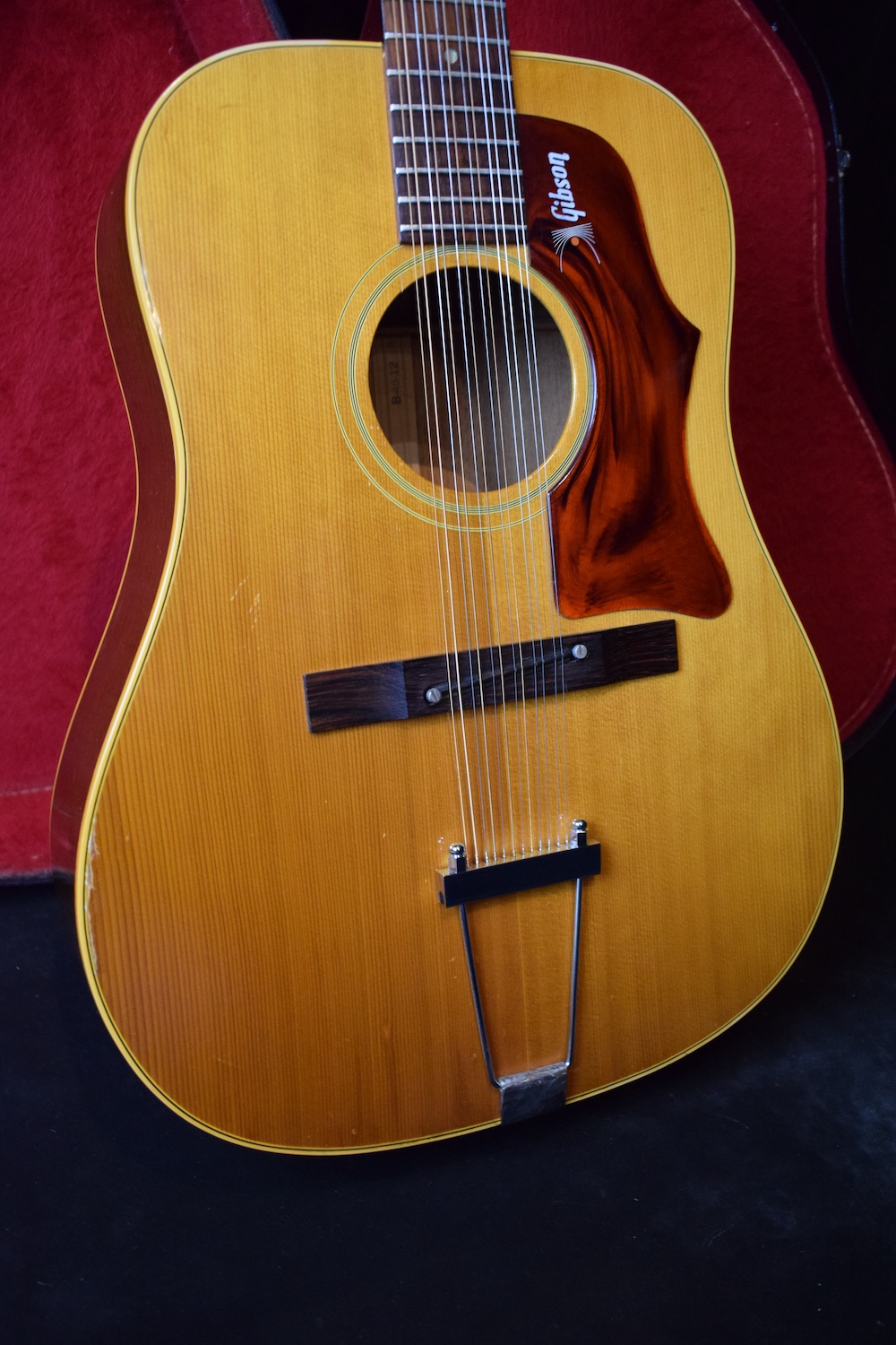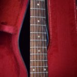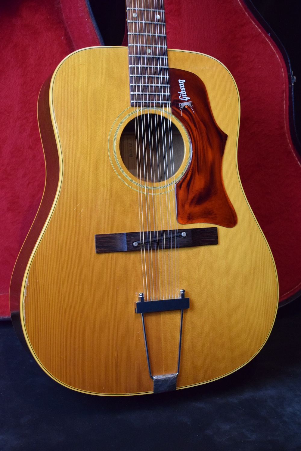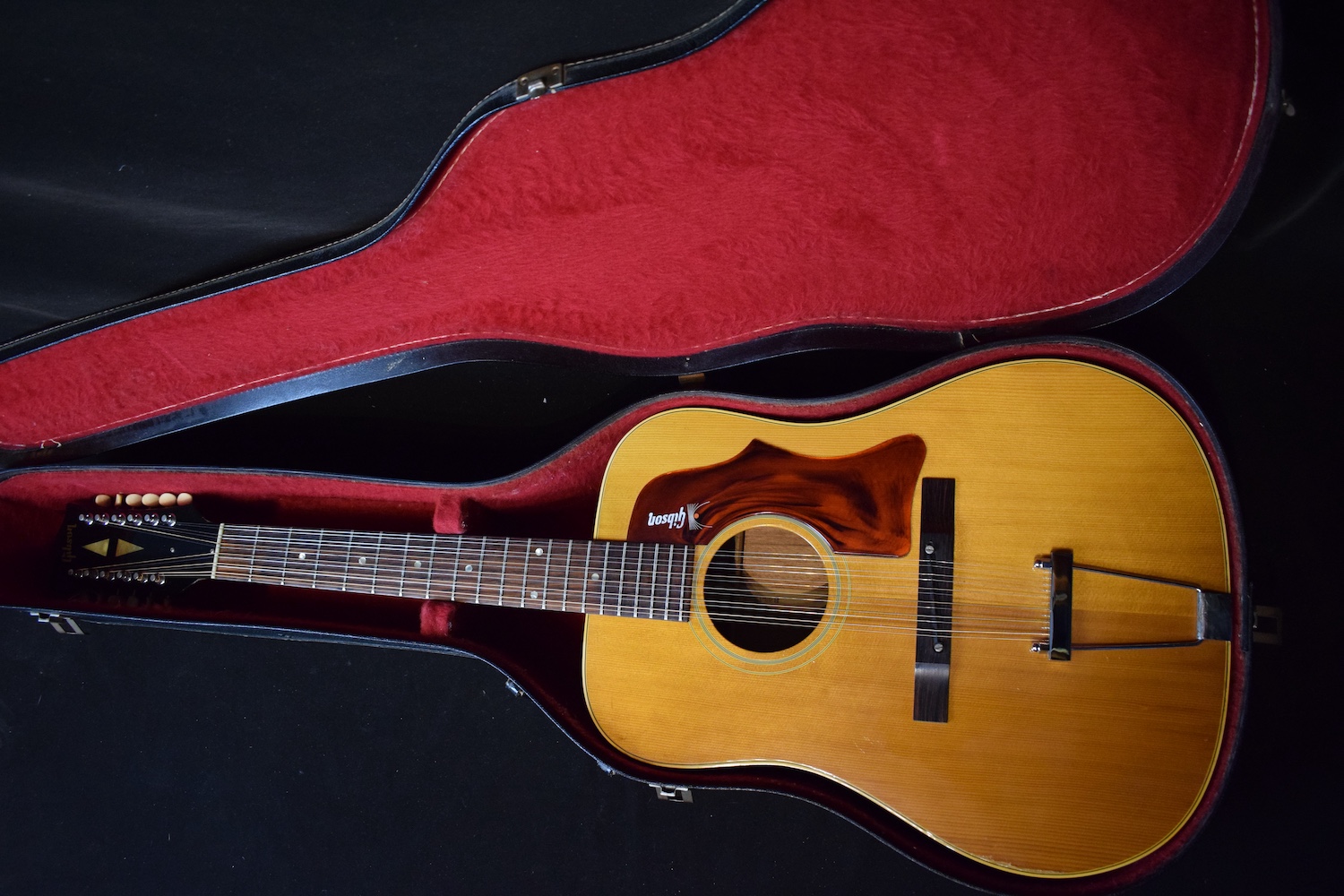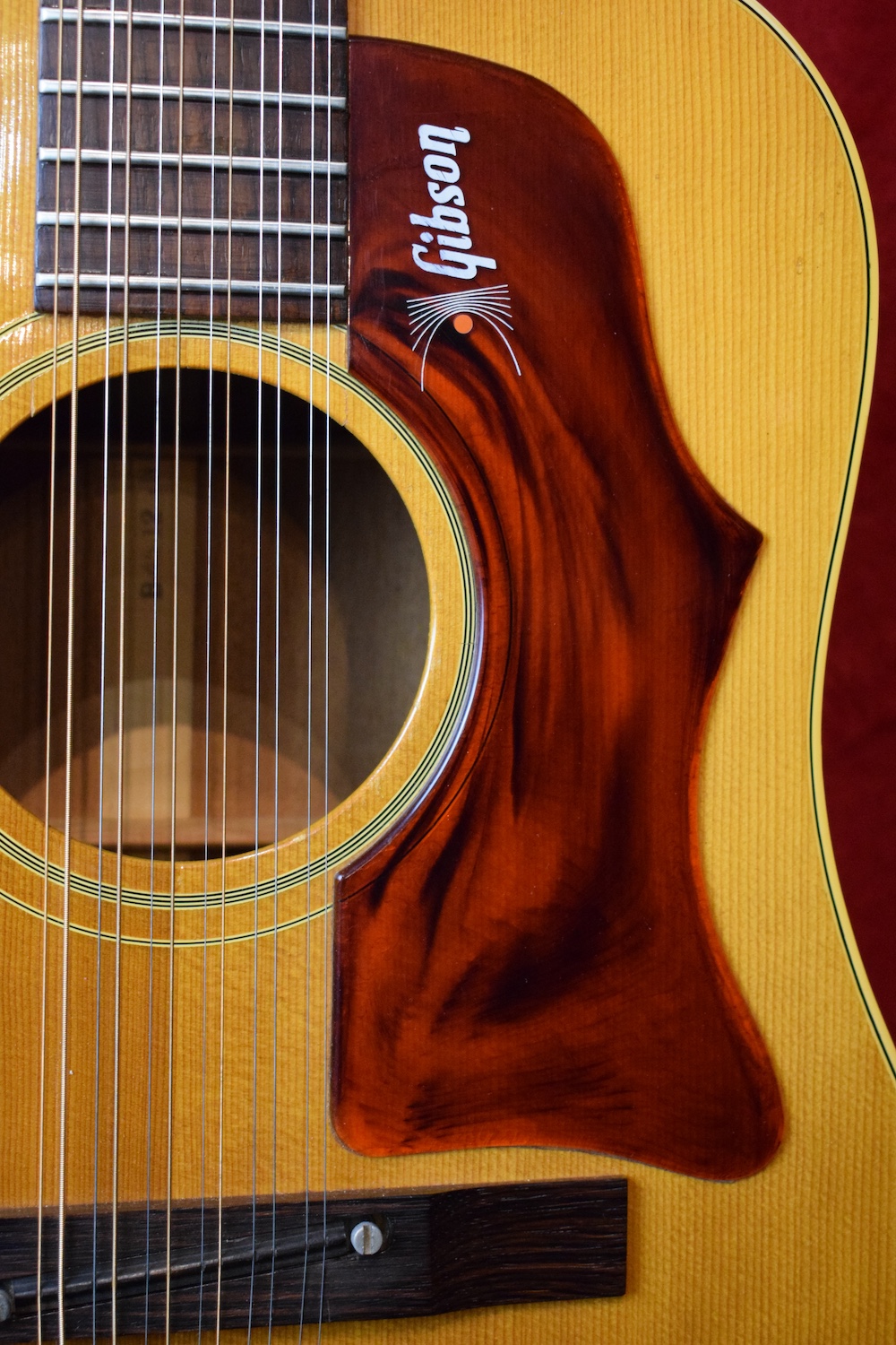 Voici un modèle que je ne vous ai pas présenté souvent. La B45-12 est une sorte de J45 12 cordes et celle-ci a très bien vieilli. La table est en excellent état et elle n’est pas voilée au niveau de la rosace. Le manche est bien droit et au bon angle. Ces vieilles douze cordes sont très difficiles à trouver dans un tel état. On les voit souvent fracturée de partout ou avec des actions injouables. C’est ce qui fait que j’ai sélectionné cet exemplaire pour vous car en trouver dans cet état est quasi impossible. Elle est donc parfaitement jouable sur l’ensemble du manche, avec un action basse et confortable. Elle sonne très bien, c’est ample et chaleureux. Notez l’état du logo sur le pickguard, typique de cette époque et en parfait état. Un signe qui montre à coup sûr que grand soin a été porté à cet instrument. Elle est fournie avec son étui d’époque.