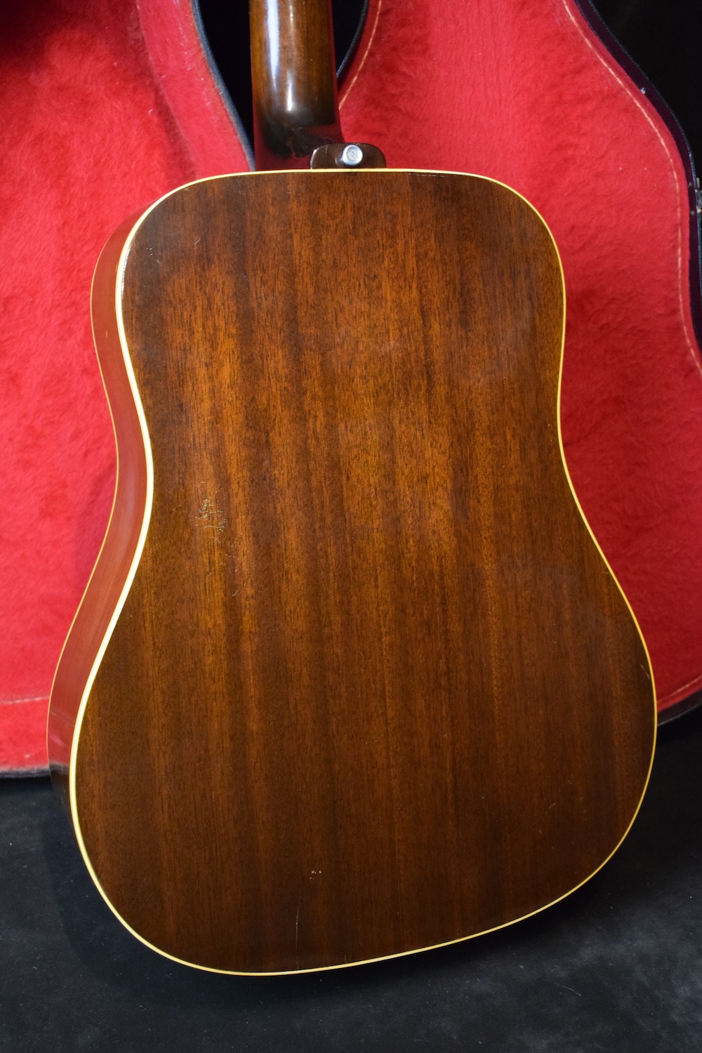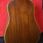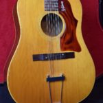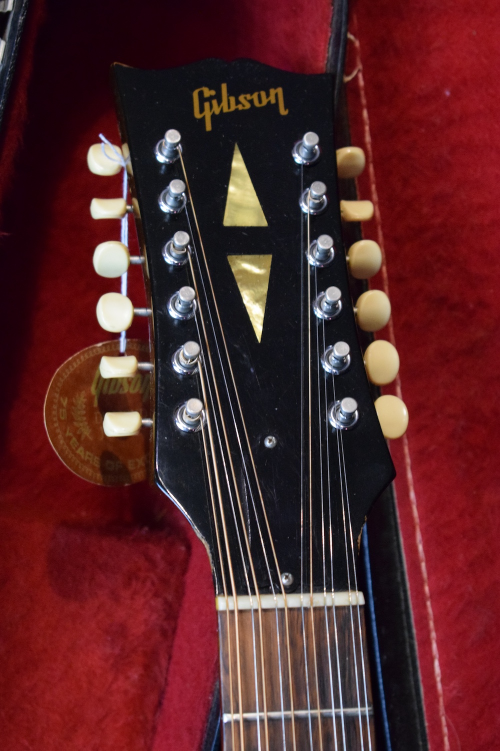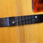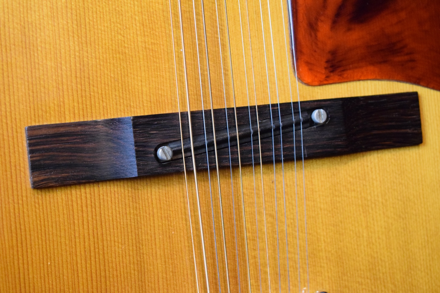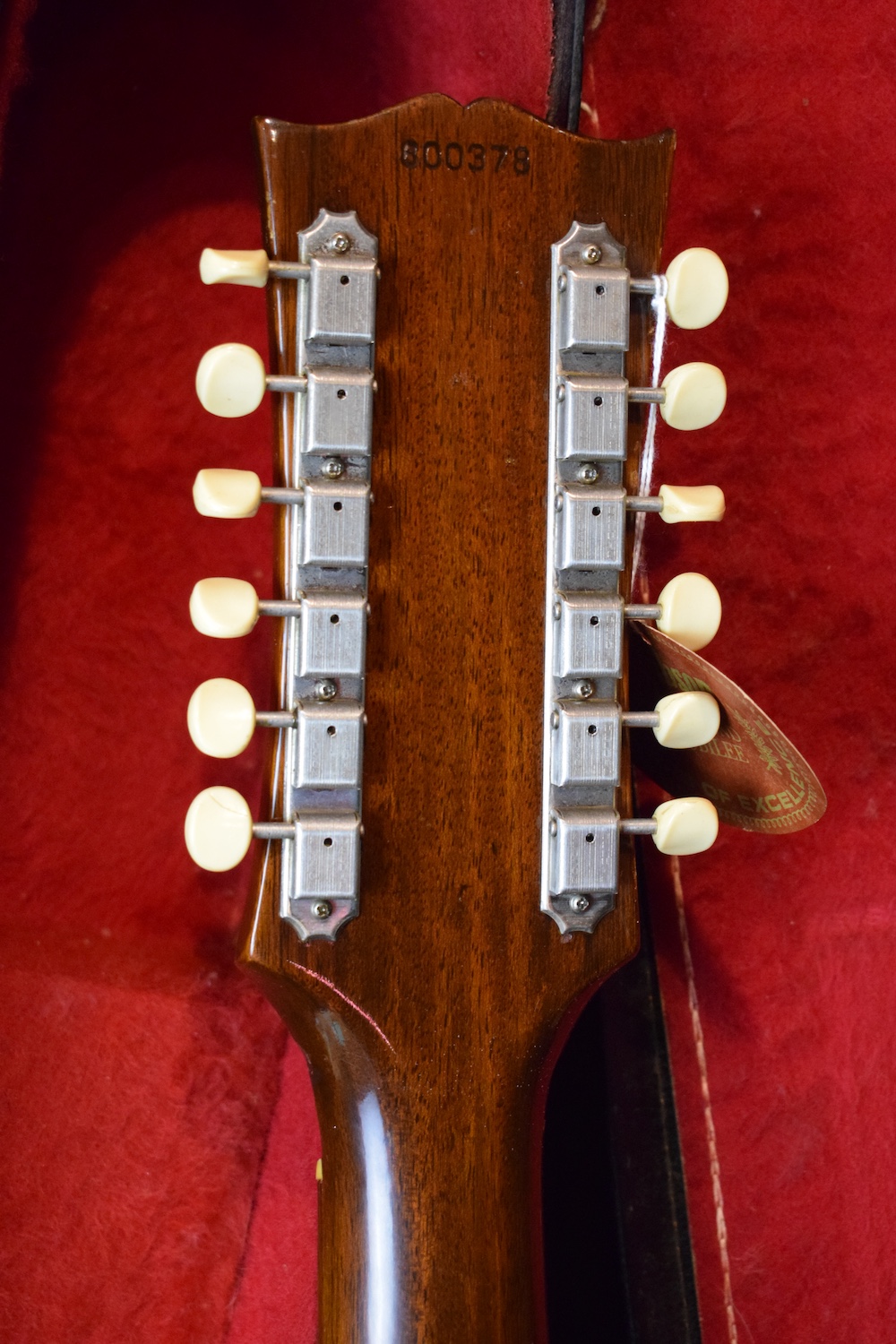 Voici un modèle que je ne vous ai pas présenté souvent. La B45-12 est une sorte de J45 12 cordes et celle-ci a très bien vieilli. La table est en excellent état et elle n’est pas voilée au niveau de la rosace. Le manche est bien droit et au bon angle. Ces vieilles douze cordes sont très difficiles à trouver dans un tel état. On les voit souvent fracturée de partout ou avec des actions injouables. C’est ce qui fait que j’ai sélectionné cet exemplaire pour vous car en trouver dans cet état est quasi impossible. Elle est donc parfaitement jouable sur l’ensemble du manche, avec un action basse et confortable. Elle sonne très bien, c’est ample et chaleureux. Notez l’état du logo sur le pickguard, typique de cette époque et en parfait état. Un signe qui montre à coup sûr que grand soin a été porté à cet instrument. Elle est fournie avec son étui d’époque.