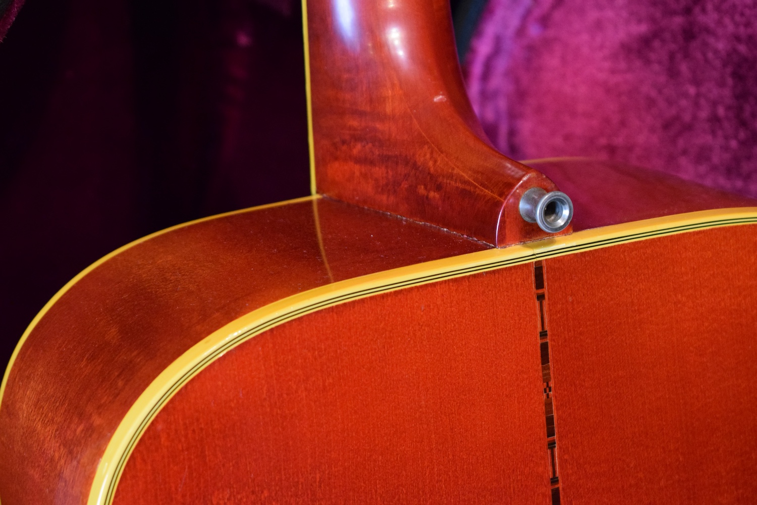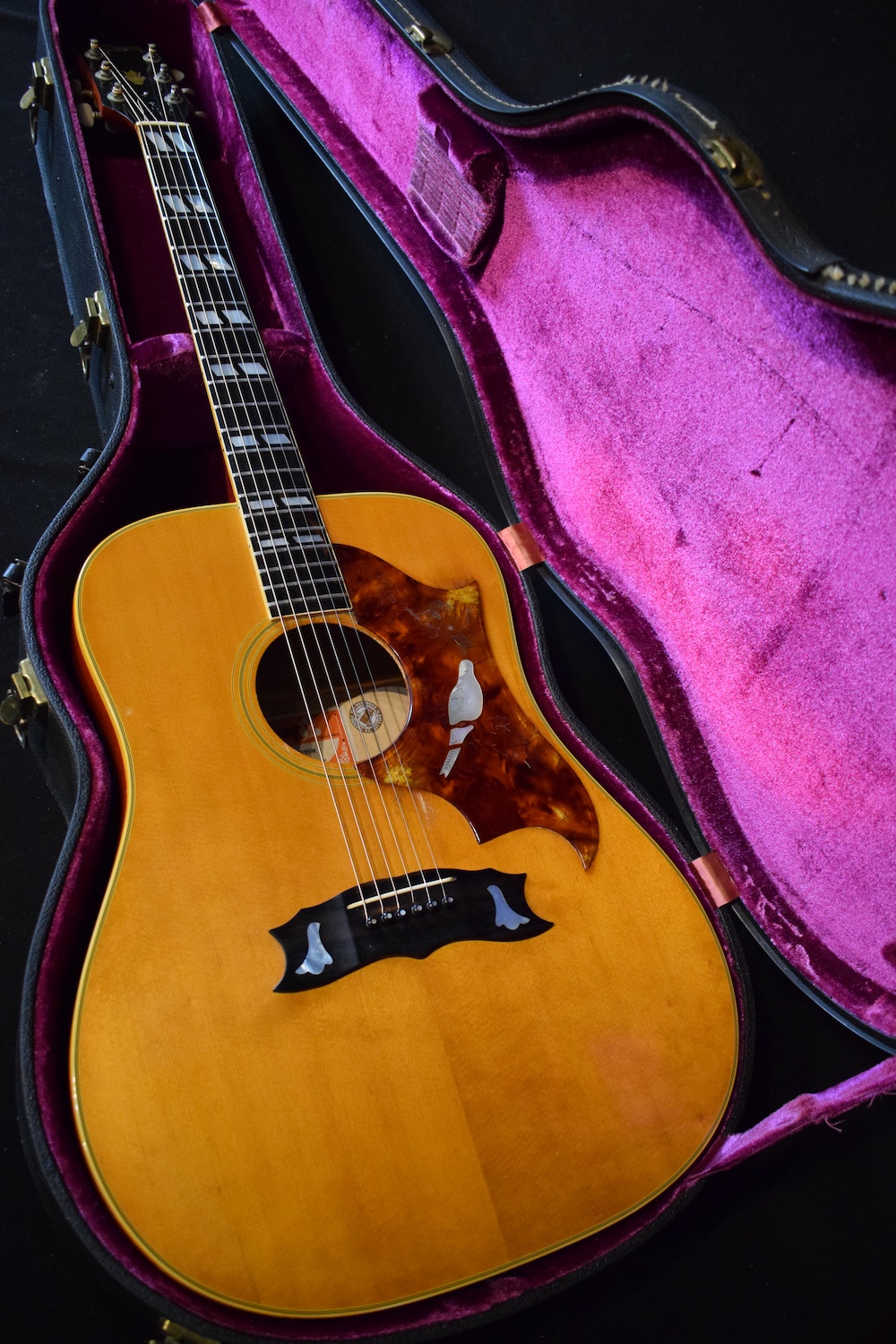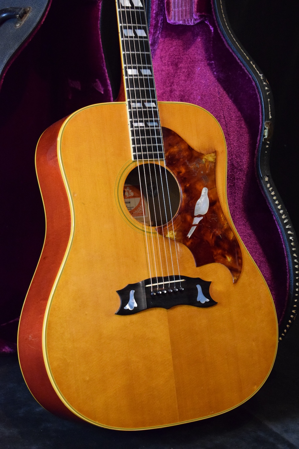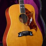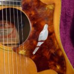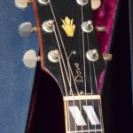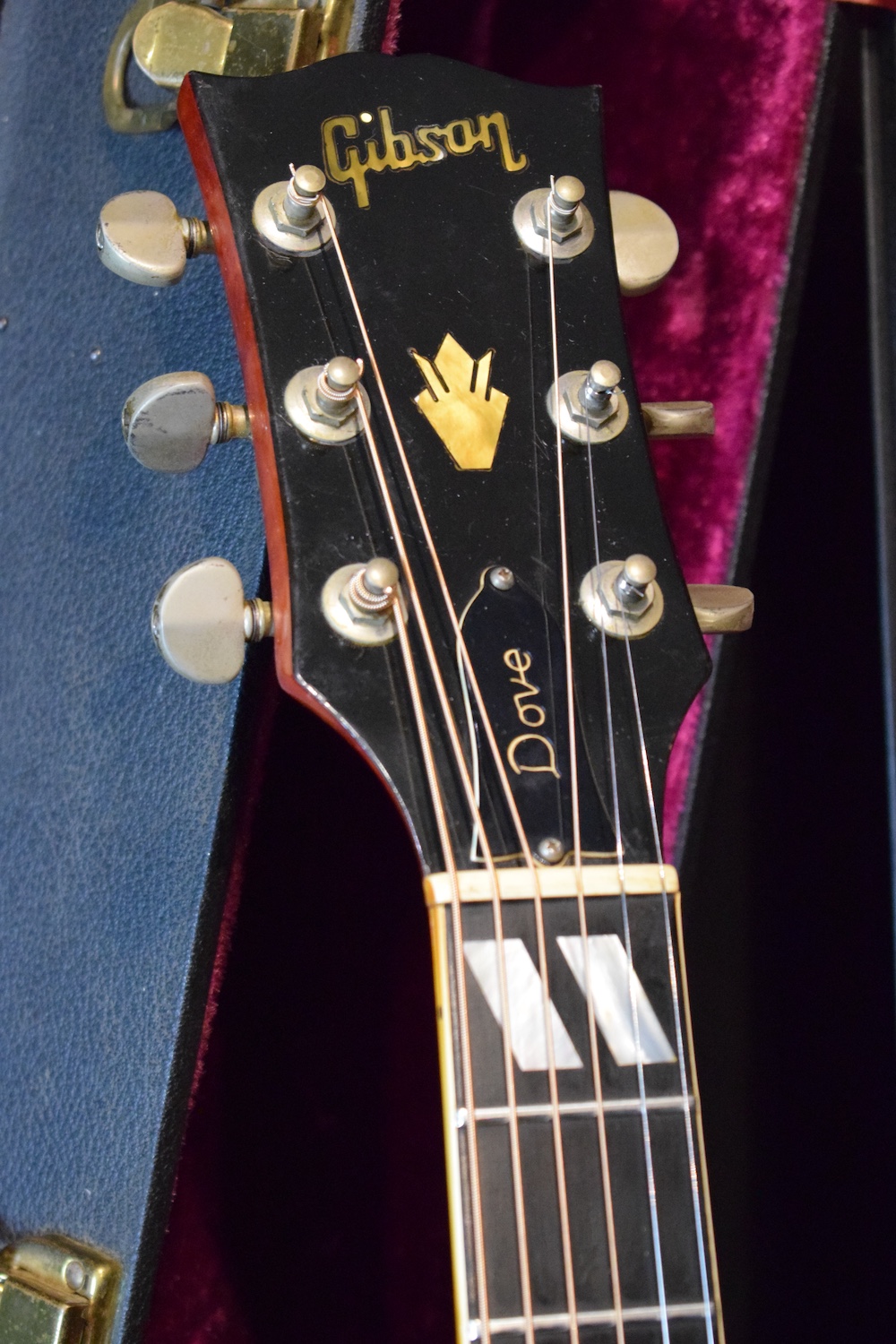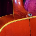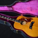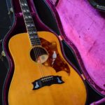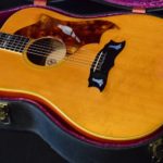 Tout en haut de la gamme Gibson, la Dove est une guitare qui a largement contribué à la légende de la marque. Endossée par Elvis, Duane Allman, ou encore Tom Petty, la Dove est un classique incontournable et pourtant en trouver une vintage est loin d’être aisé. Ce modèle en particulier était déjà passé par ici il y a une dizaine d’année. Elle n’a pas bougé et avait juste besoin d’un petit nettoyage et d’un réglage ce qui est bien normal après tout ce temps. Son état est très bon. Pas de fentes ou de réparations. On notera que l’azote qui s’échappe du pickguard lui a donné cet aspect quelque peu blanchi, je suis sûr que vous êtes familier avec ce phénomène si vous lisez régulièrement ces pages. L’angle du manche est bon, les frettes d’un bon niveau et la guitare sonne très bien évidemment. Un son folk très large et assez brillant, bien ample avec de belles harmoniques. Tout ce que l’on est endroit d’attendre d’un des symboles de la lutherie américaine. Icône d’une génération qui comme tant d’autres rêvait de la paix.