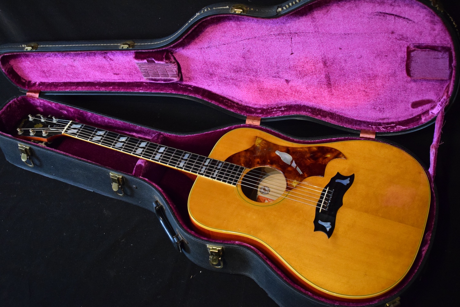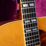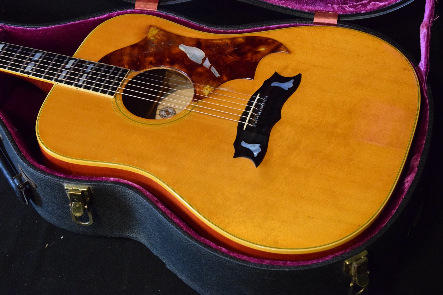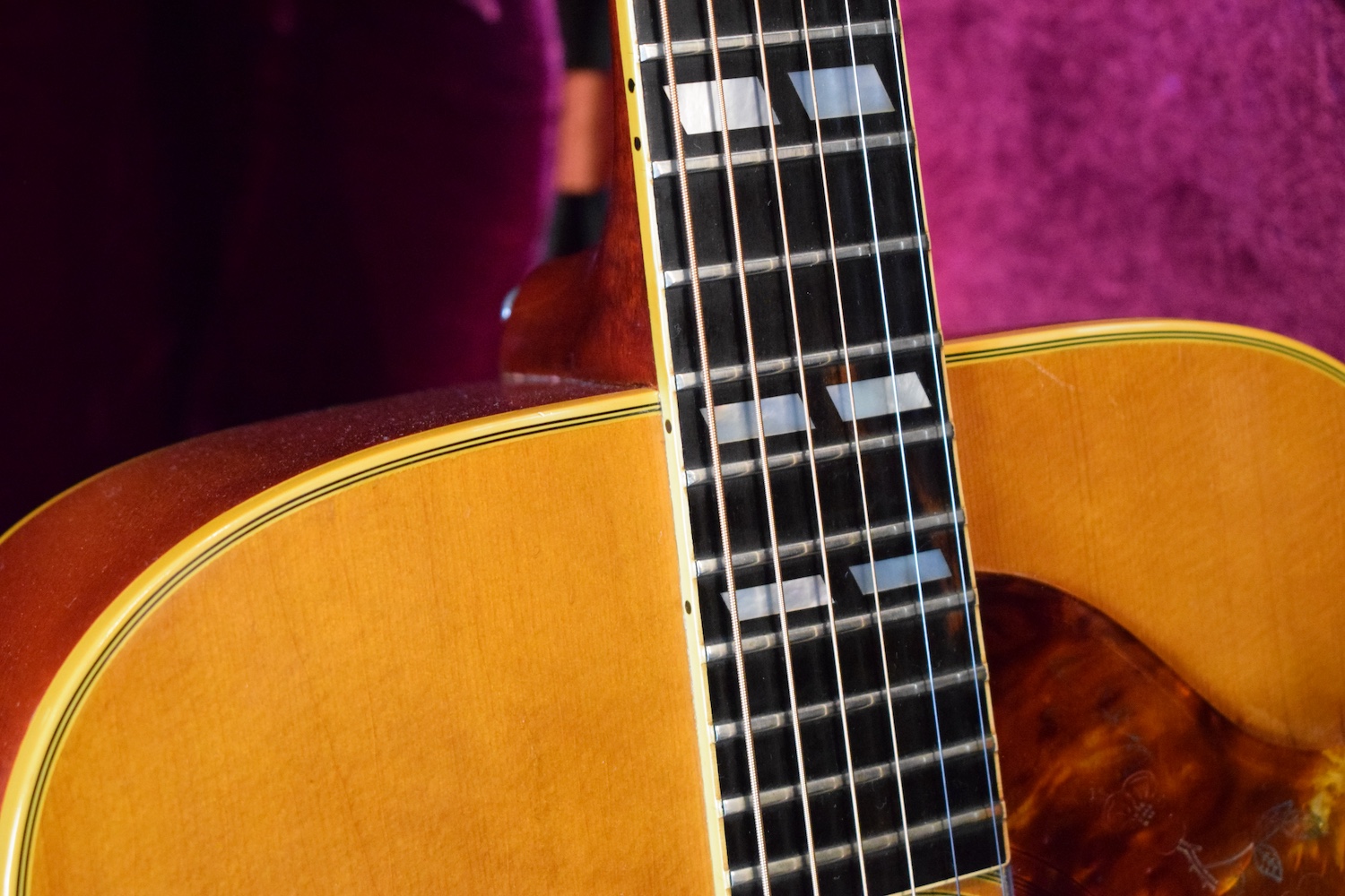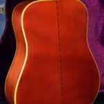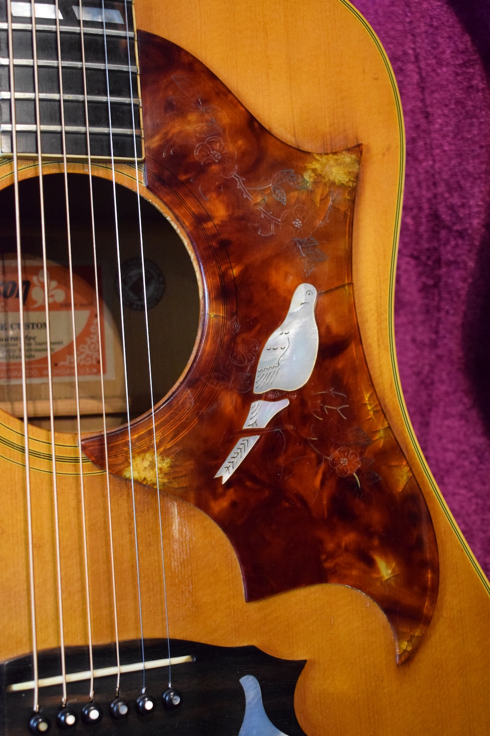 Tout en haut de la gamme Gibson, la Dove est une guitare qui a largement contribué à la légende de la marque. Endossée par Elvis, Duane Allman, ou encore Tom Petty, la Dove est un classique incontournable et pourtant en trouver une vintage est loin d’être aisé. Ce modèle en particulier était déjà passé par ici il y a une dizaine d’année. Elle n’a pas bougé et avait juste besoin d’un petit nettoyage et d’un réglage ce qui est bien normal après tout ce temps. Son état est très bon. Pas de fentes ou de réparations. On notera que l’azote qui s’échappe du pickguard lui a donné cet aspect quelque peu blanchi, je suis sûr que vous êtes familier avec ce phénomène si vous lisez régulièrement ces pages. L’angle du manche est bon, les frettes d’un bon niveau et la guitare sonne très bien évidemment. Un son folk très large et assez brillant, bien ample avec de belles harmoniques. Tout ce que l’on est endroit d’attendre d’un des symboles de la lutherie américaine. Icône d’une génération qui comme tant d’autres rêvait de la paix.