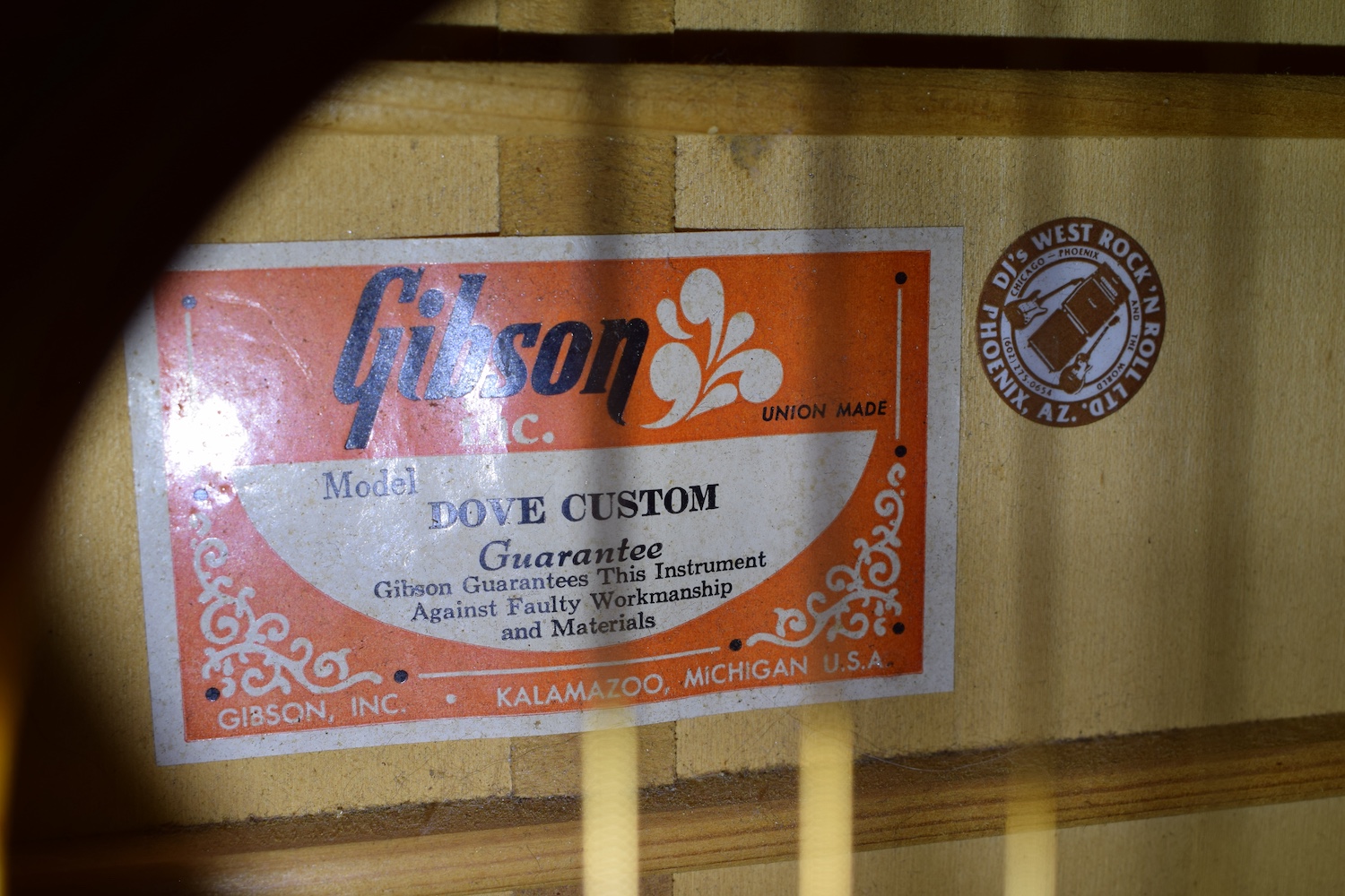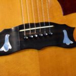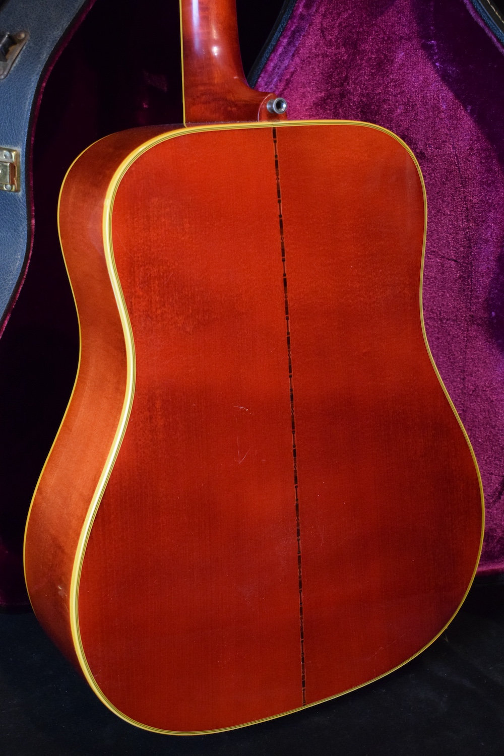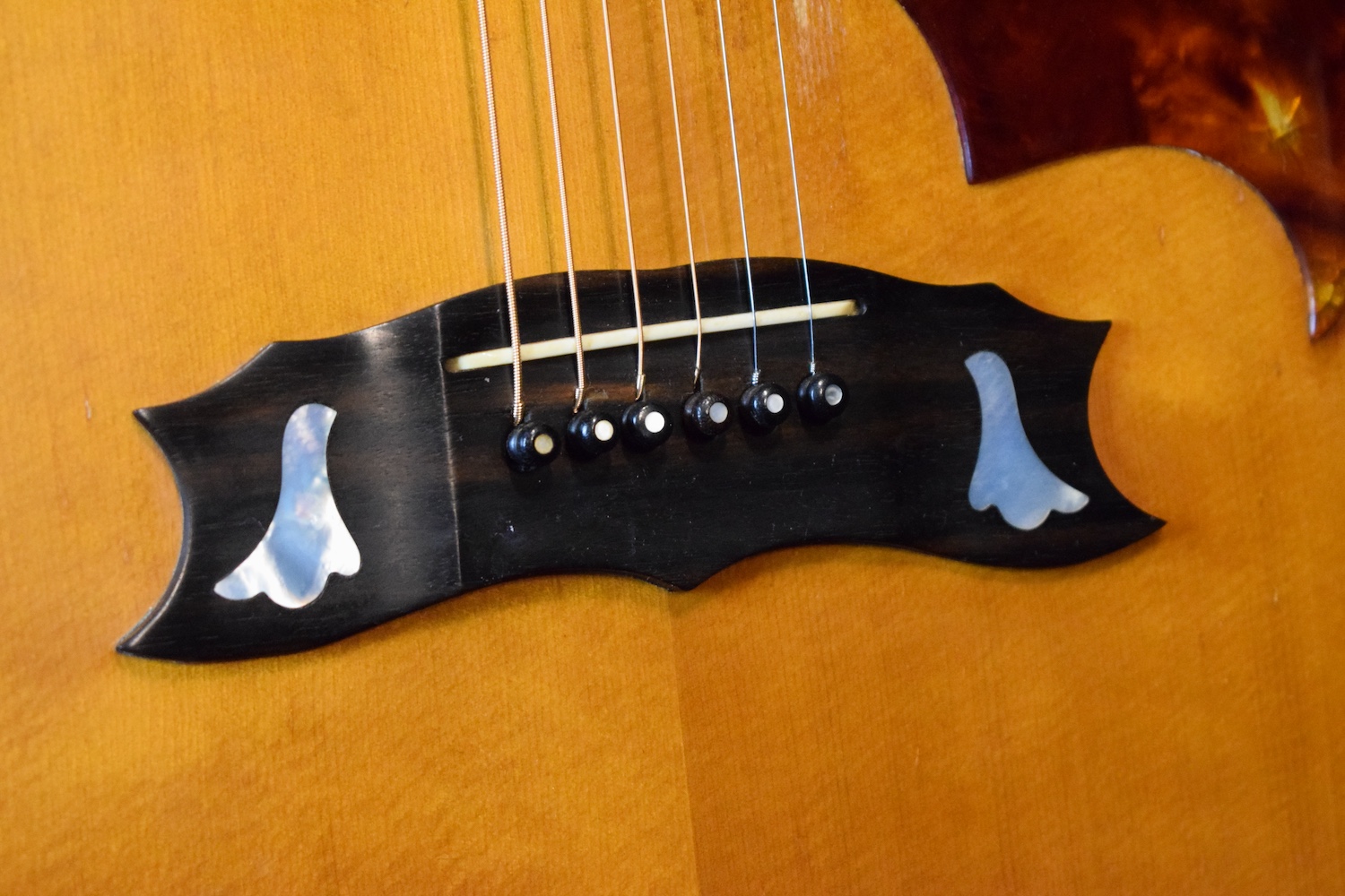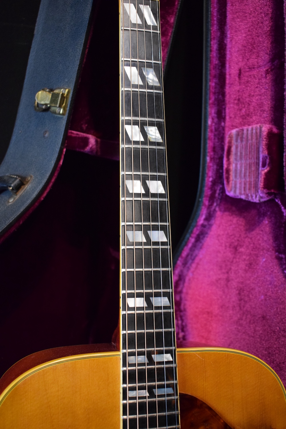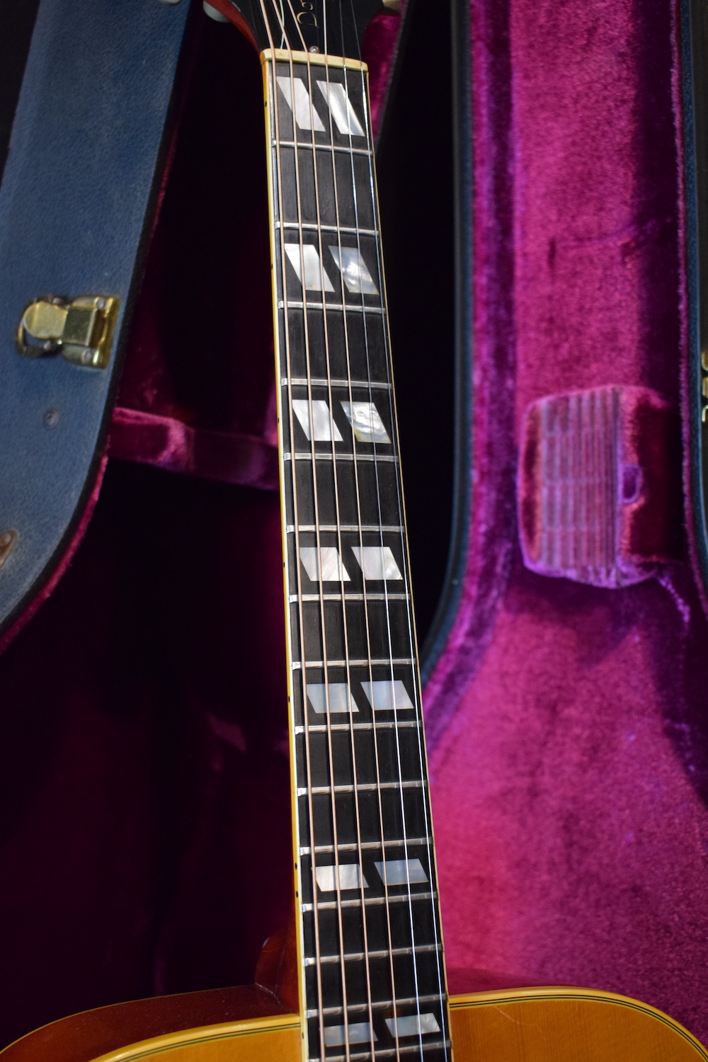 Tout en haut de la gamme Gibson, la Dove est une guitare qui a largement contribué à la légende de la marque. Endossée par Elvis, Duane Allman, ou encore Tom Petty, la Dove est un classique incontournable et pourtant en trouver une vintage est loin d’être aisé. Ce modèle en particulier était déjà passé par ici il y a une dizaine d’année. Elle n’a pas bougé et avait juste besoin d’un petit nettoyage et d’un réglage ce qui est bien normal après tout ce temps. Son état est très bon. Pas de fentes ou de réparations. On notera que l’azote qui s’échappe du pickguard lui a donné cet aspect quelque peu blanchi, je suis sûr que vous êtes familier avec ce phénomène si vous lisez régulièrement ces pages. L’angle du manche est bon, les frettes d’un bon niveau et la guitare sonne très bien évidemment. Un son folk très large et assez brillant, bien ample avec de belles harmoniques. Tout ce que l’on est endroit d’attendre d’un des symboles de la lutherie américaine. Icône d’une génération qui comme tant d’autres rêvait de la paix.