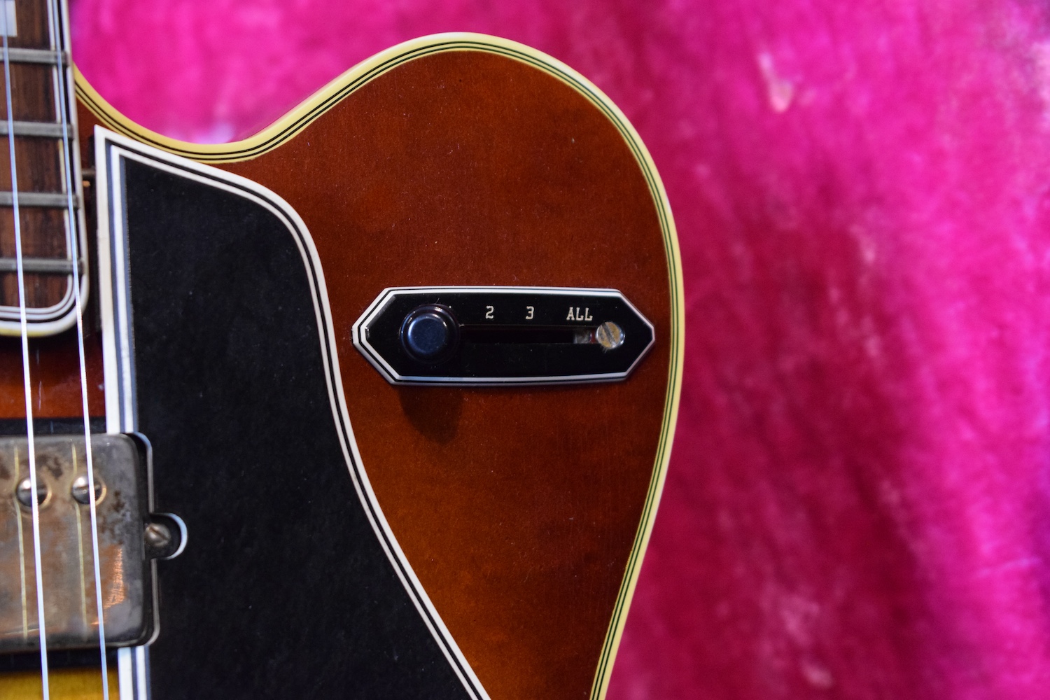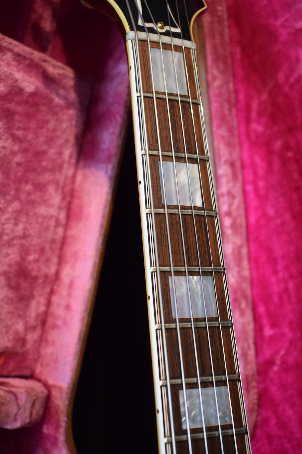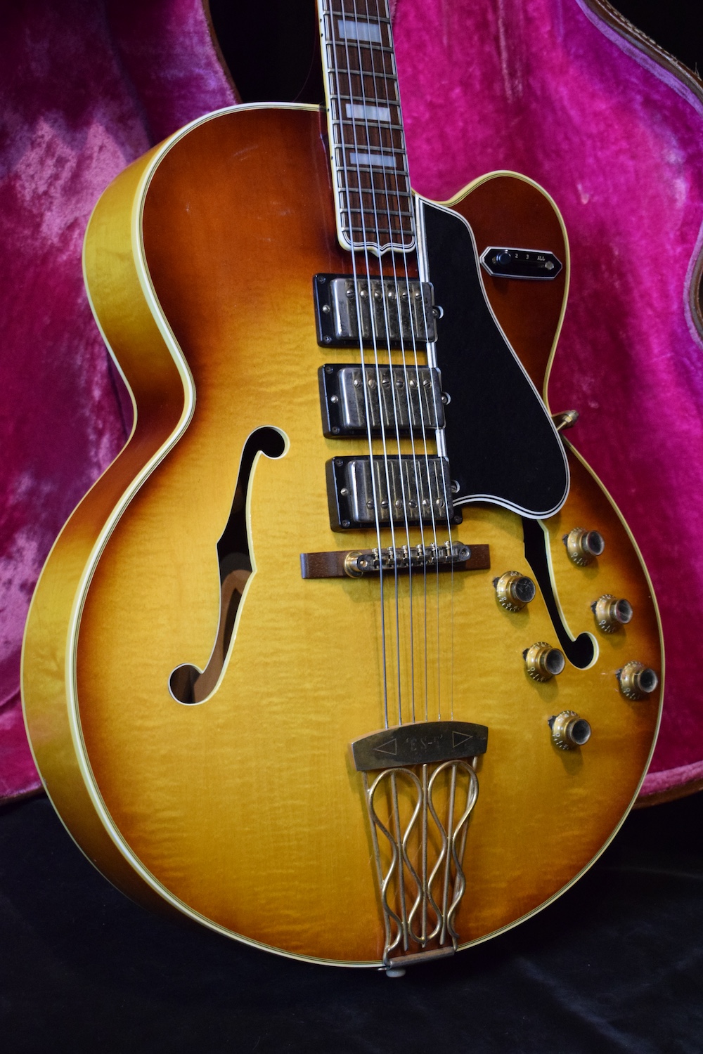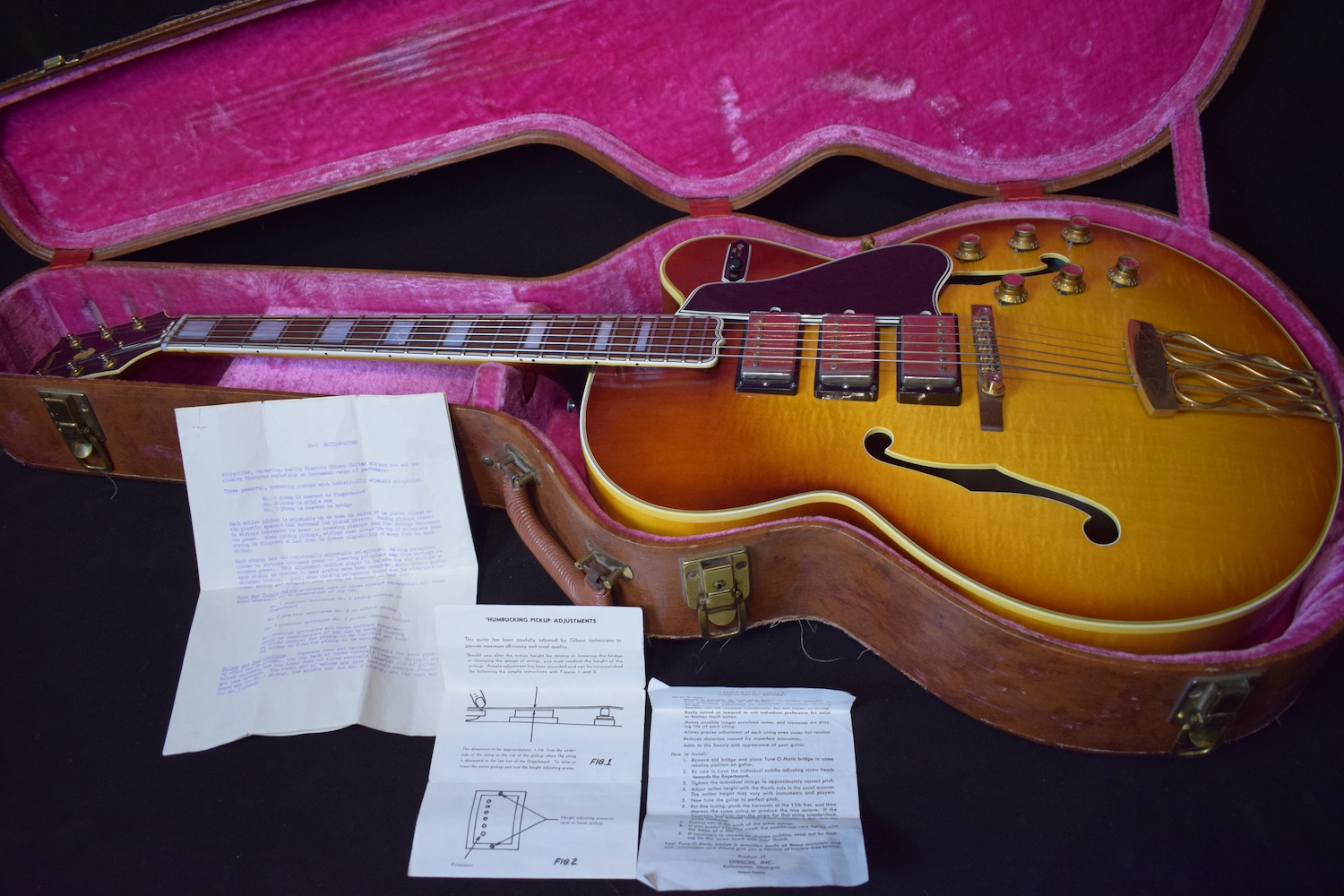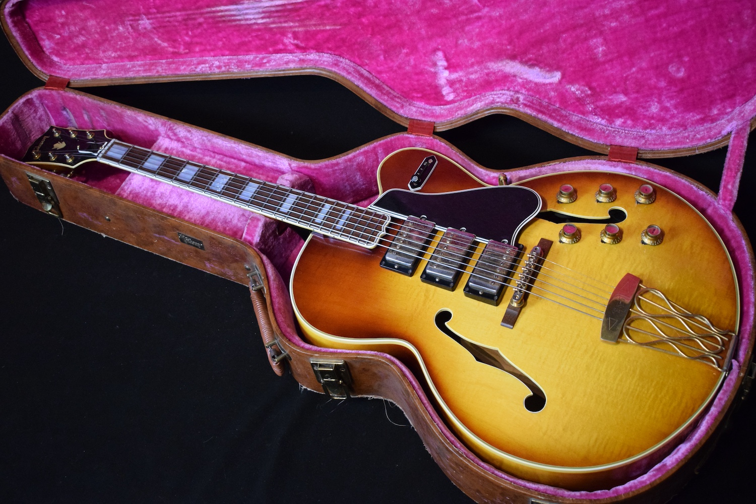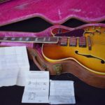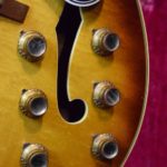 Initialement équipé de trois micros P-90, le modèle est passé en 1957 à l’ES-5 Switchmaster, équipée de trois micros humbuckers et d’un sélecteur 4 positions, offrant une polyvalence sonore inégalée pour l’époque. À la fin des années 1950, l’ES-5 Switchmaster s’était imposée comme une guitare électrique archtop de premier ordre pour les musiciens de jazz et de blues. C’était un modèle très haut de gamme fabriqué en très petites quantités puisqu’il n’y en a eu que 46 de produites en 1960. Il en sortait à peine 4 par mois de l’usine. Combien ont survécu dans cet état et avec leurs micros jusqu’à aujourd’hui ? Probablement assez peu vu le nombre d’exemplaires que l’on trouve constamment avec des micros changés.