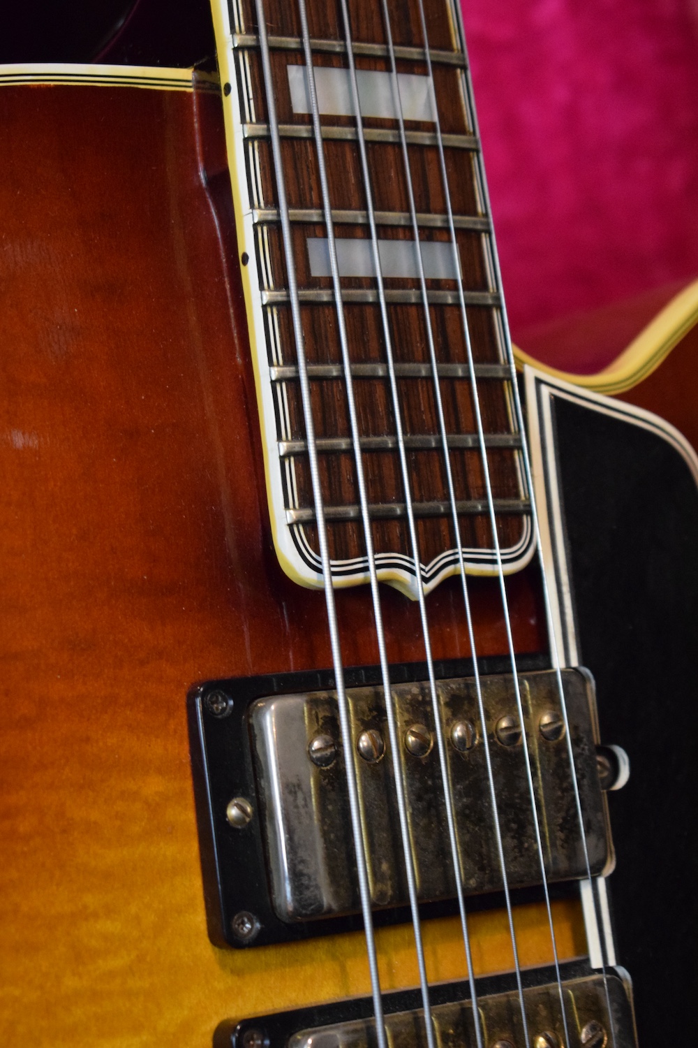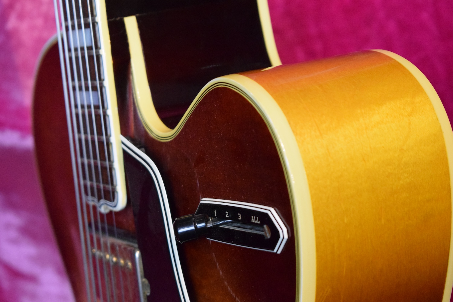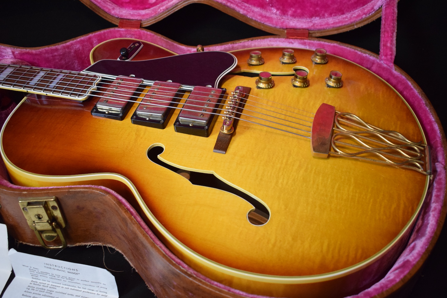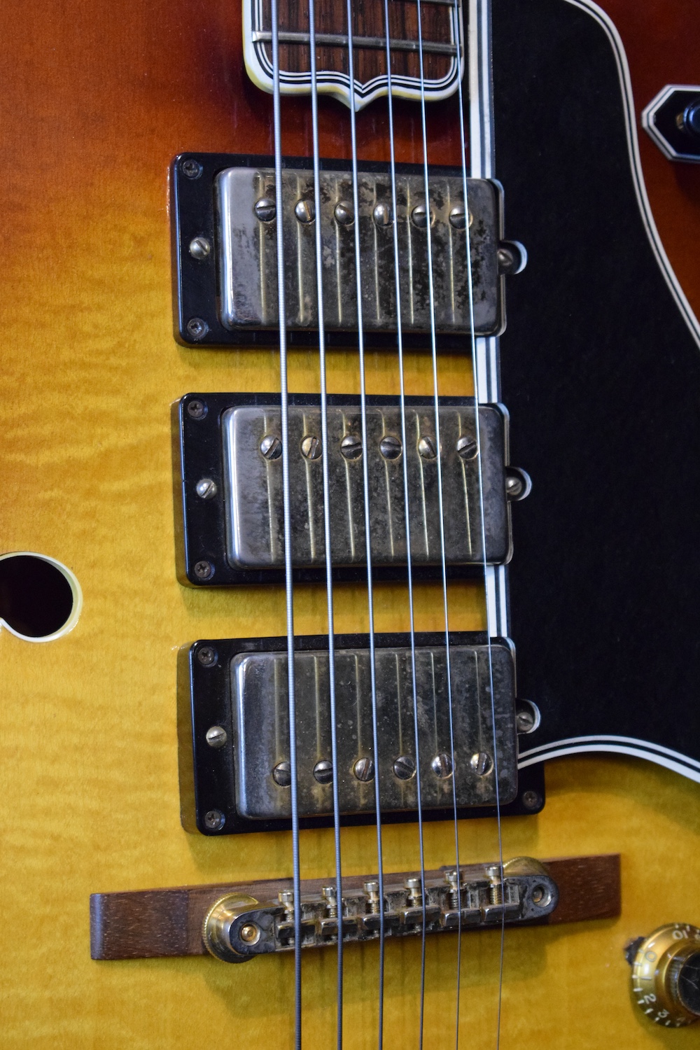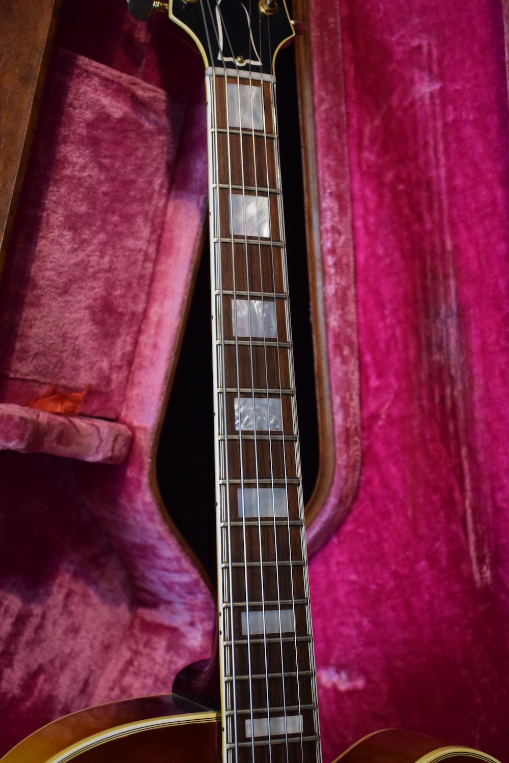 Initialement équipé de trois micros P-90, le modèle est passé en 1957 à l’ES-5 Switchmaster, équipée de trois micros humbuckers et d’un sélecteur 4 positions, offrant une polyvalence sonore inégalée pour l’époque. À la fin des années 1950, l’ES-5 Switchmaster s’était imposée comme une guitare électrique archtop de premier ordre pour les musiciens de jazz et de blues. C’était un modèle très haut de gamme fabriqué en très petites quantités puisqu’il n’y en a eu que 46 de produites en 1960. Il en sortait à peine 4 par mois de l’usine. Combien ont survécu dans cet état et avec leurs micros jusqu’à aujourd’hui ? Probablement assez peu vu le nombre d’exemplaires que l’on trouve constamment avec des micros changés.