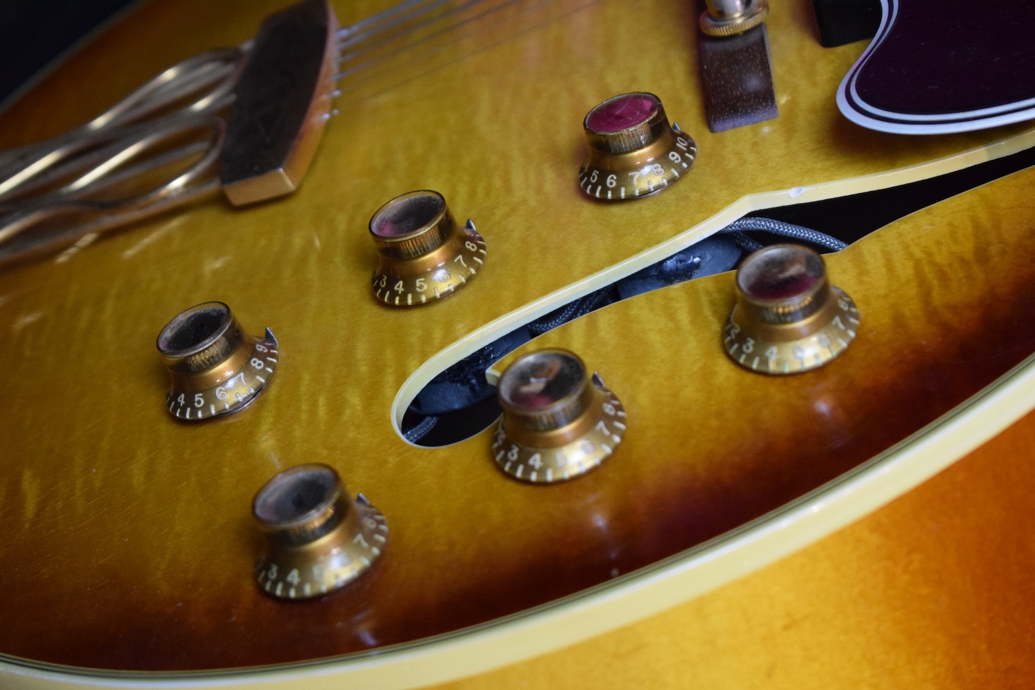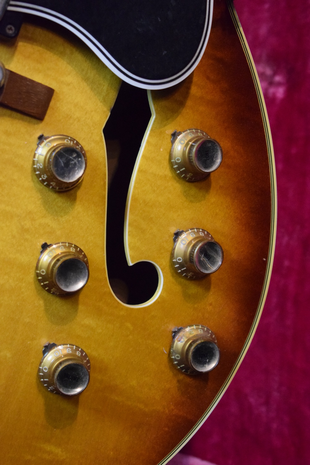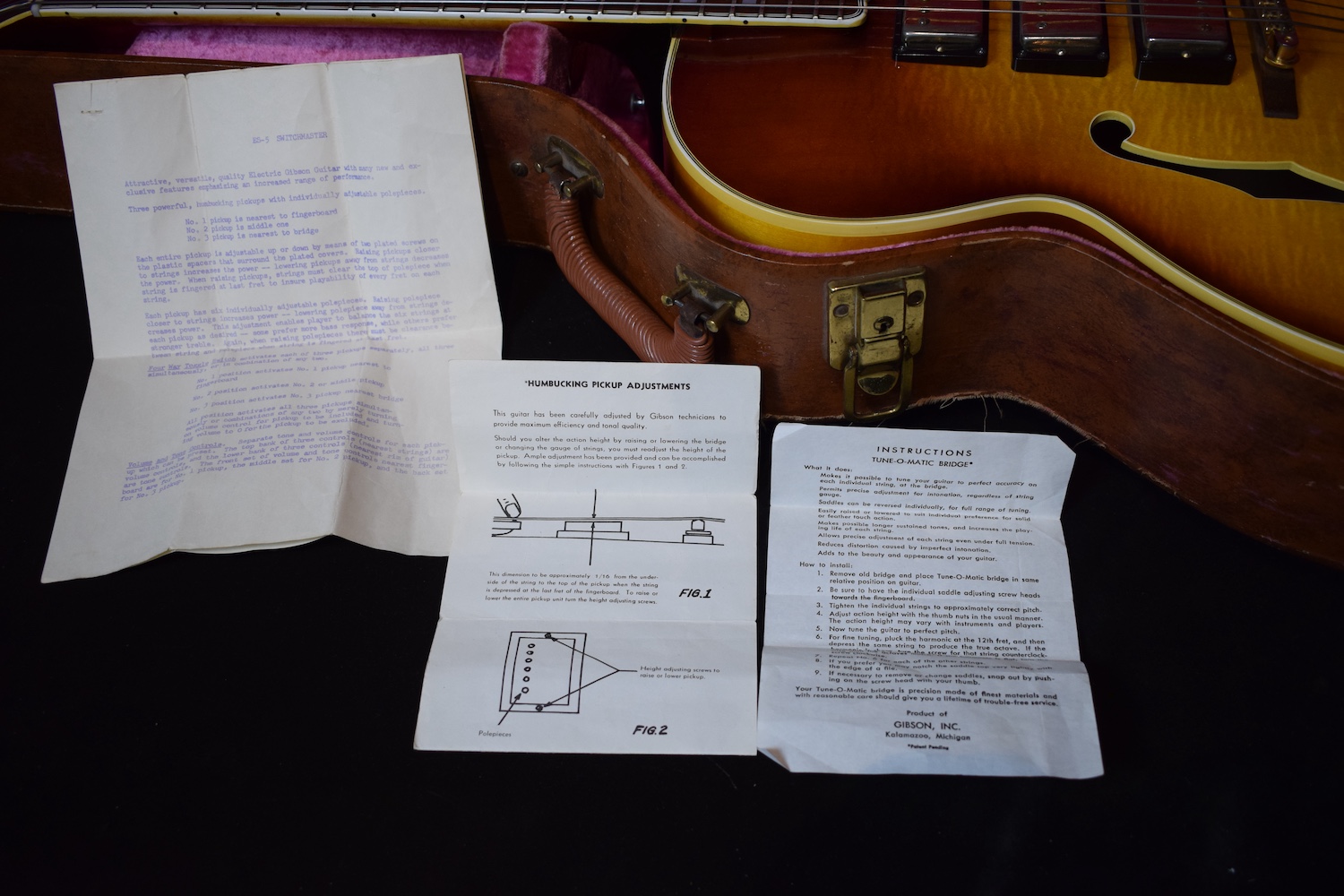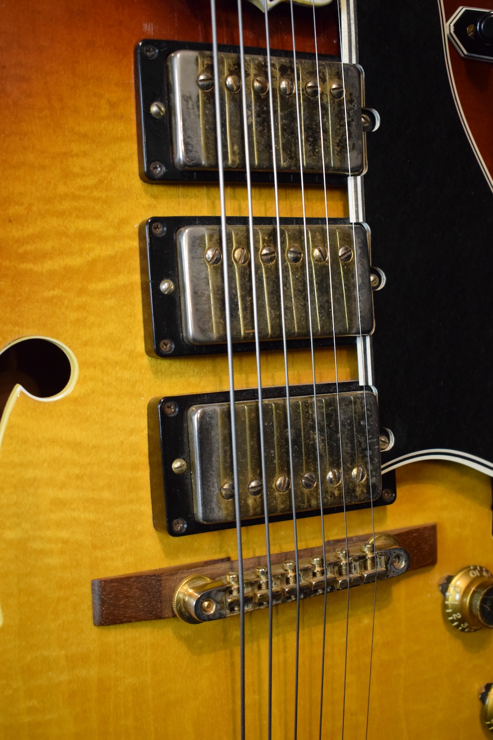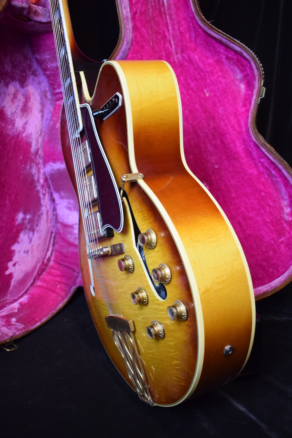 Initialement équipé de trois micros P-90, le modèle est passé en 1957 à l’ES-5 Switchmaster, équipée de trois micros humbuckers et d’un sélecteur 4 positions, offrant une polyvalence sonore inégalée pour l’époque. À la fin des années 1950, l’ES-5 Switchmaster s’était imposée comme une guitare électrique archtop de premier ordre pour les musiciens de jazz et de blues. C’était un modèle très haut de gamme fabriqué en très petites quantités puisqu’il n’y en a eu que 46 de produites en 1960. Il en sortait à peine 4 par mois de l’usine. Combien ont survécu dans cet état et avec leurs micros jusqu’à aujourd’hui ? Probablement assez peu vu le nombre d’exemplaires que l’on trouve constamment avec des micros changés.